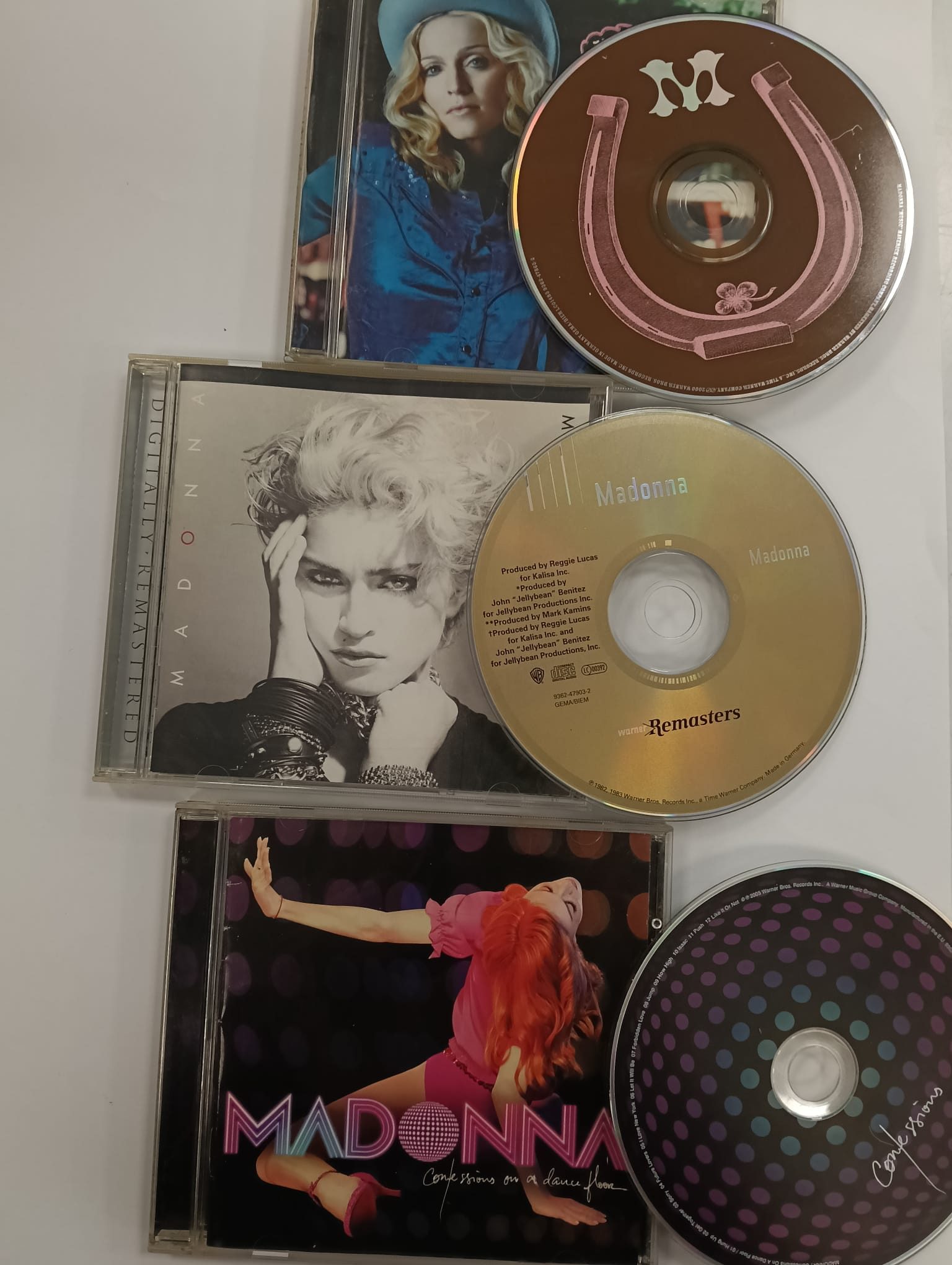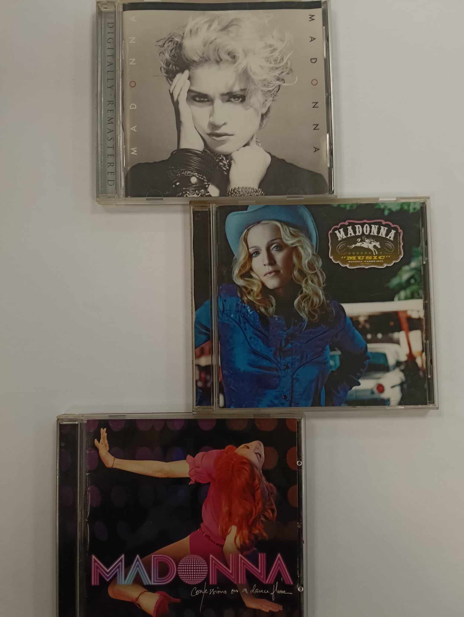 Lote de 3 CDs de la artista Madonna. Incluye los álbumes Music, Confessions on a Dance Floor y el álbum homónimo Madonna (remasterizado). Ideal para coleccionistas y amantes de la música pop y dance.