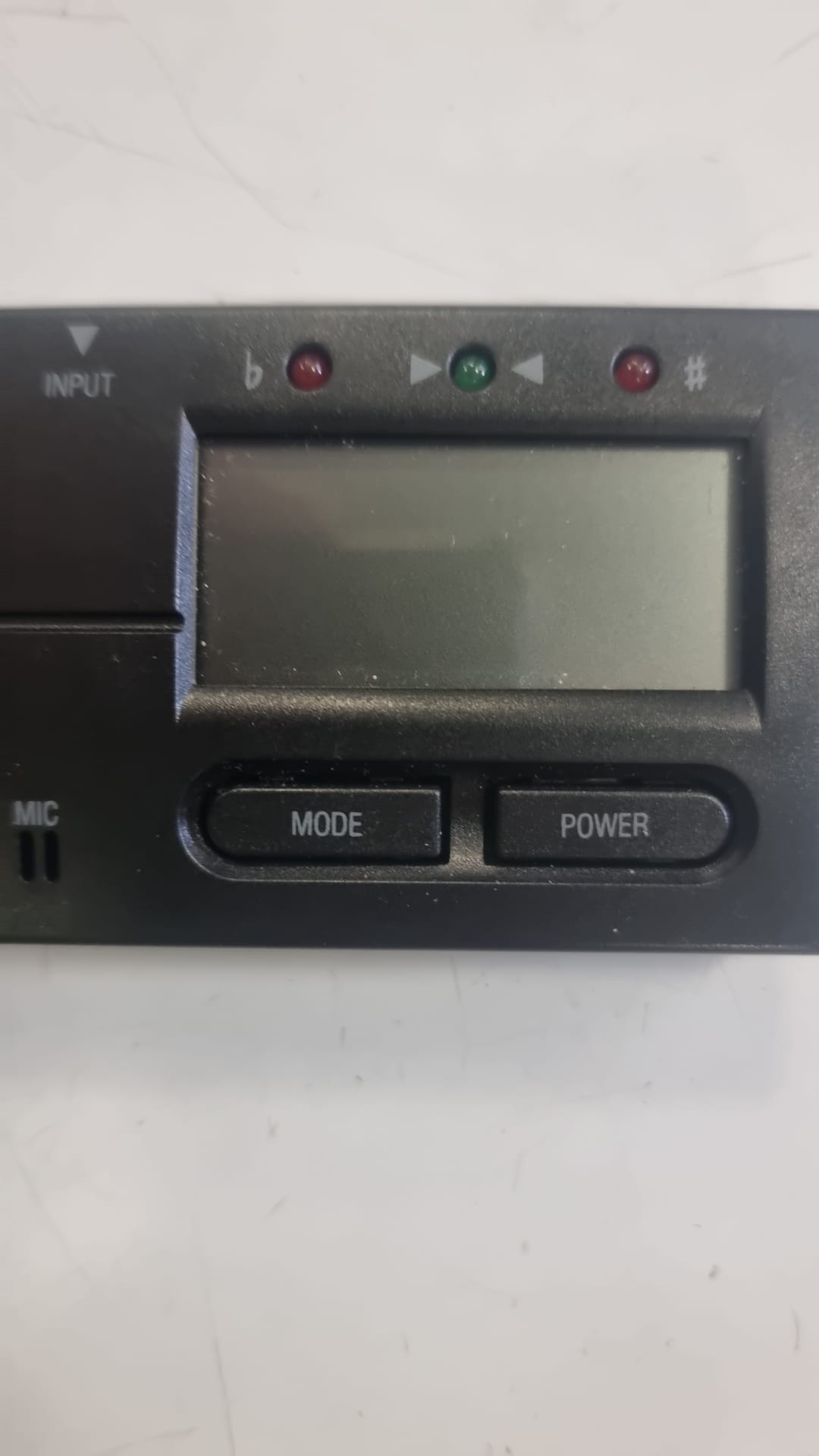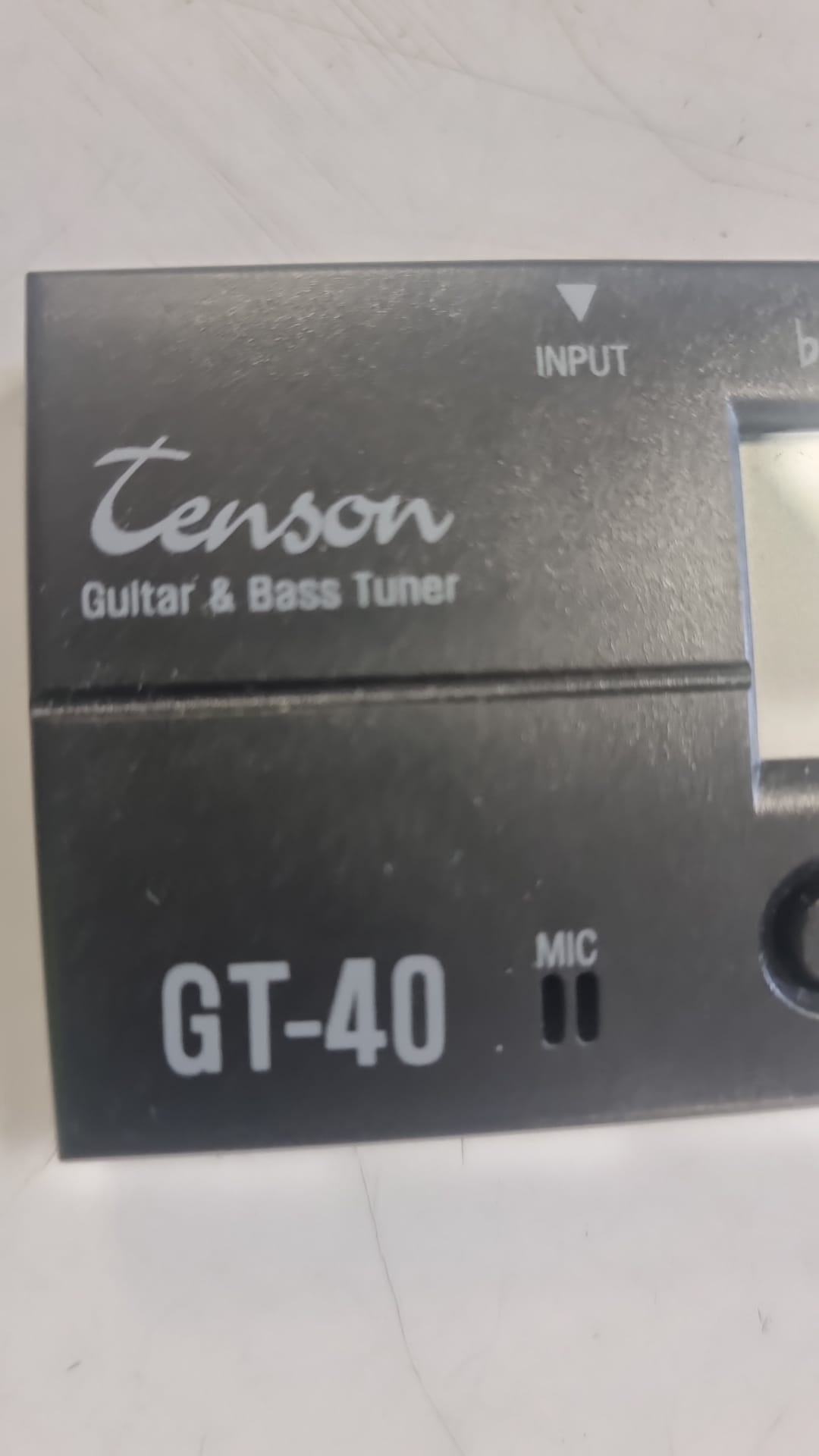 Afinador GT-40 para guitarra y bajo. Compacto y fácil de usar. Pantalla LCD. Botones MODE y POWER. Indicadores LED. Entrada INPUT.