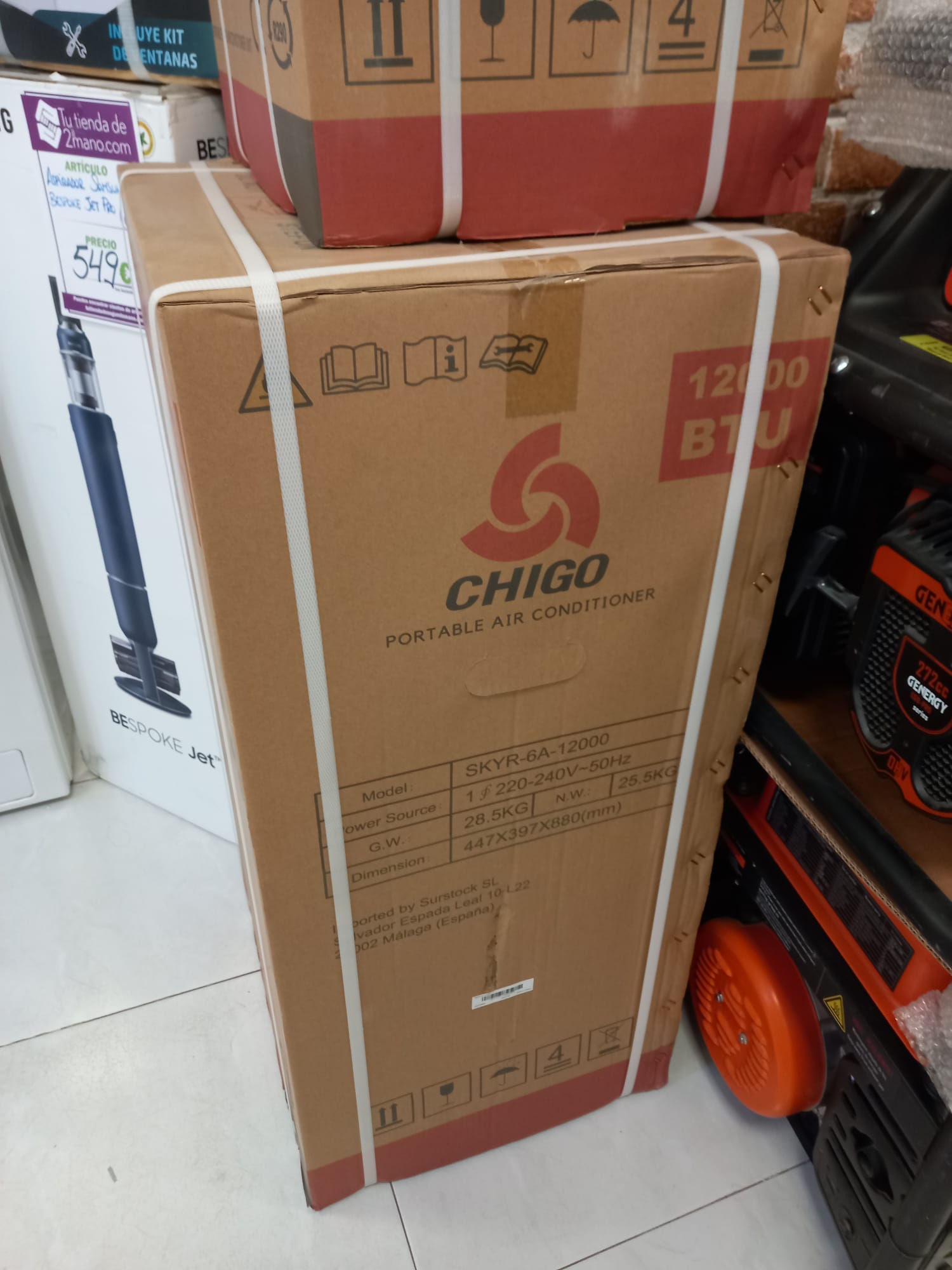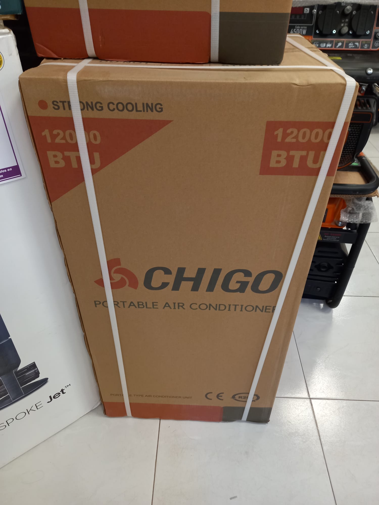 Aire acondicionado portatil Chigo, modelo Skyr 6A 12000. Potencia de enfriamiento 12000 btu que son 3010 frigorias. 4 funciones en 1. Enfria, bomba de calor, ventila y deshumidifica. Area de enfriamiento hasta 30m cuadrados.