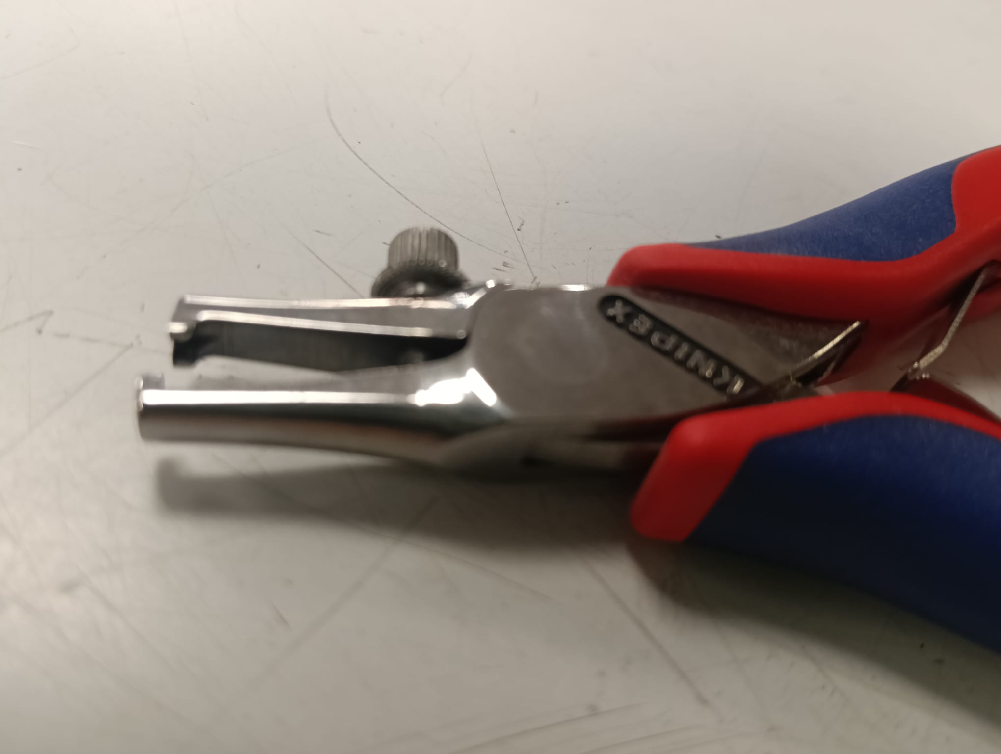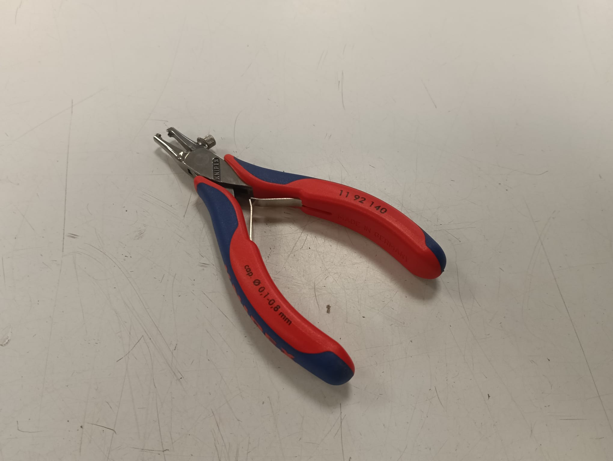 Alicate pelacables, modelo KNIPEX 1192140. Dimensiones 14,5l. x 4,9an. centímetros. Para cables con conductores finos unitarios y múltiples de 0,1 hasta 0,8 mm de diámetro con aislamiento de plástico y goma.