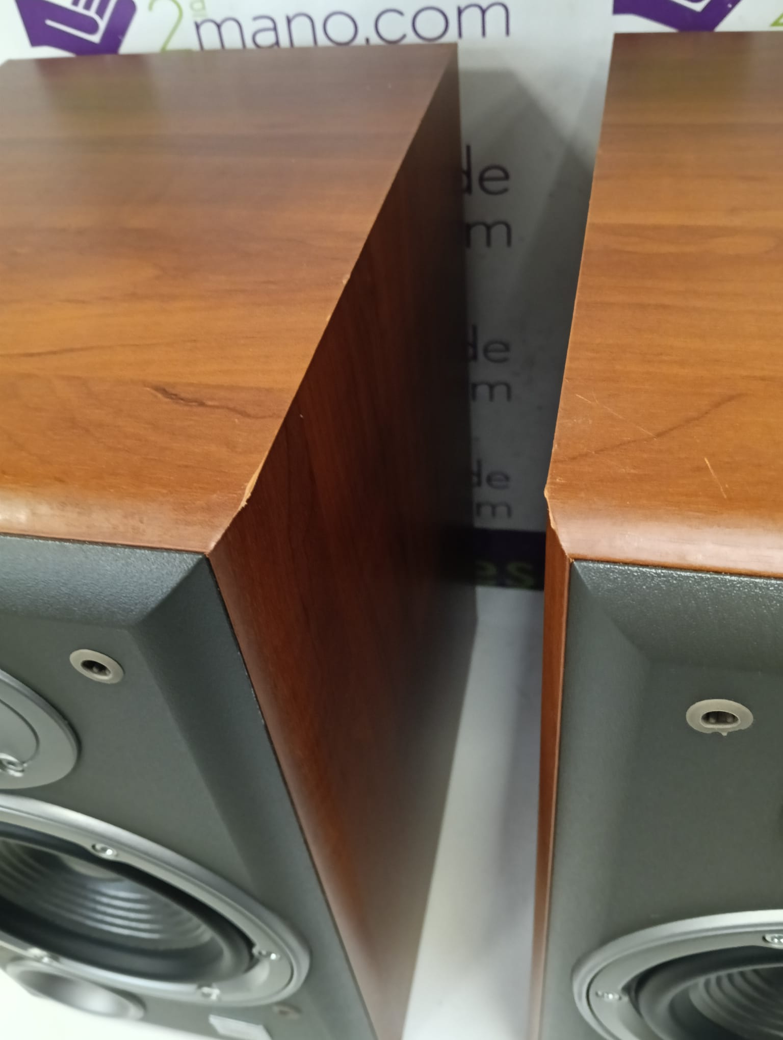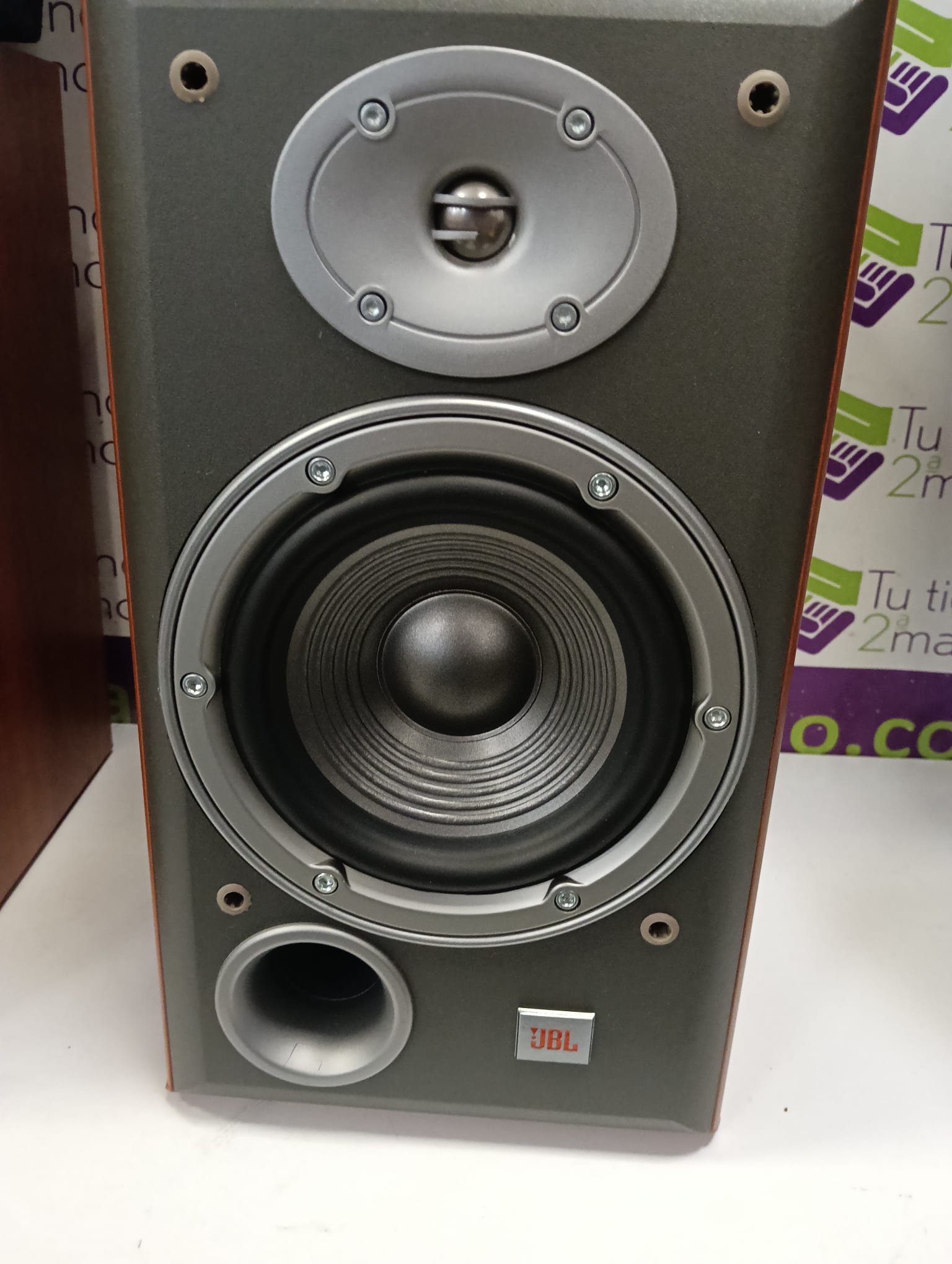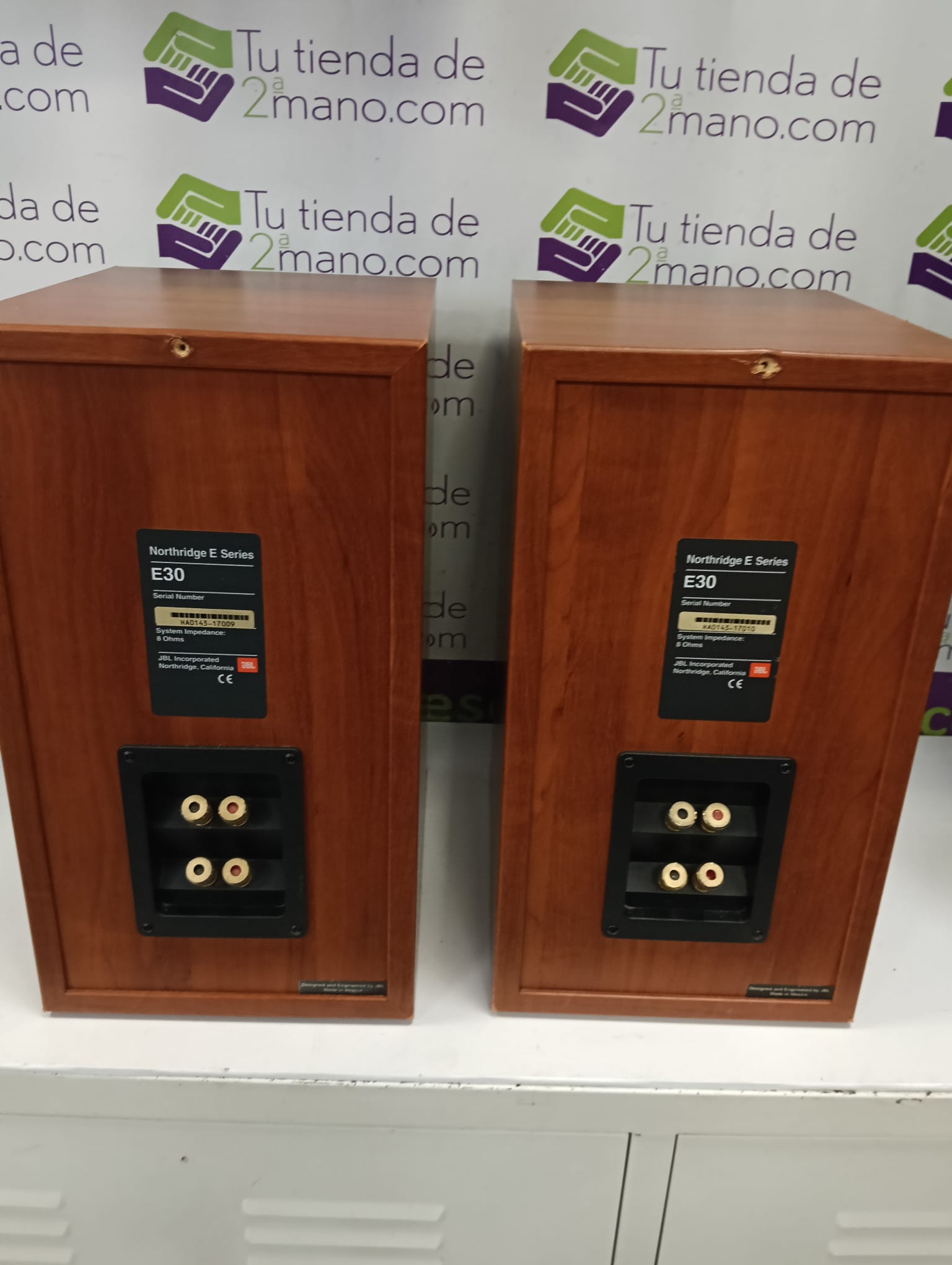 Altavoces JBL Northridge E30 en color marrón y gris. Diseñados para ofrecer una experiencia de audio de calidad. Modelo E30 de la serie Northridge. Acabado en madera y gris. Marcas estéticas en madera y tela de rejilla como se aprecia en las fotos.