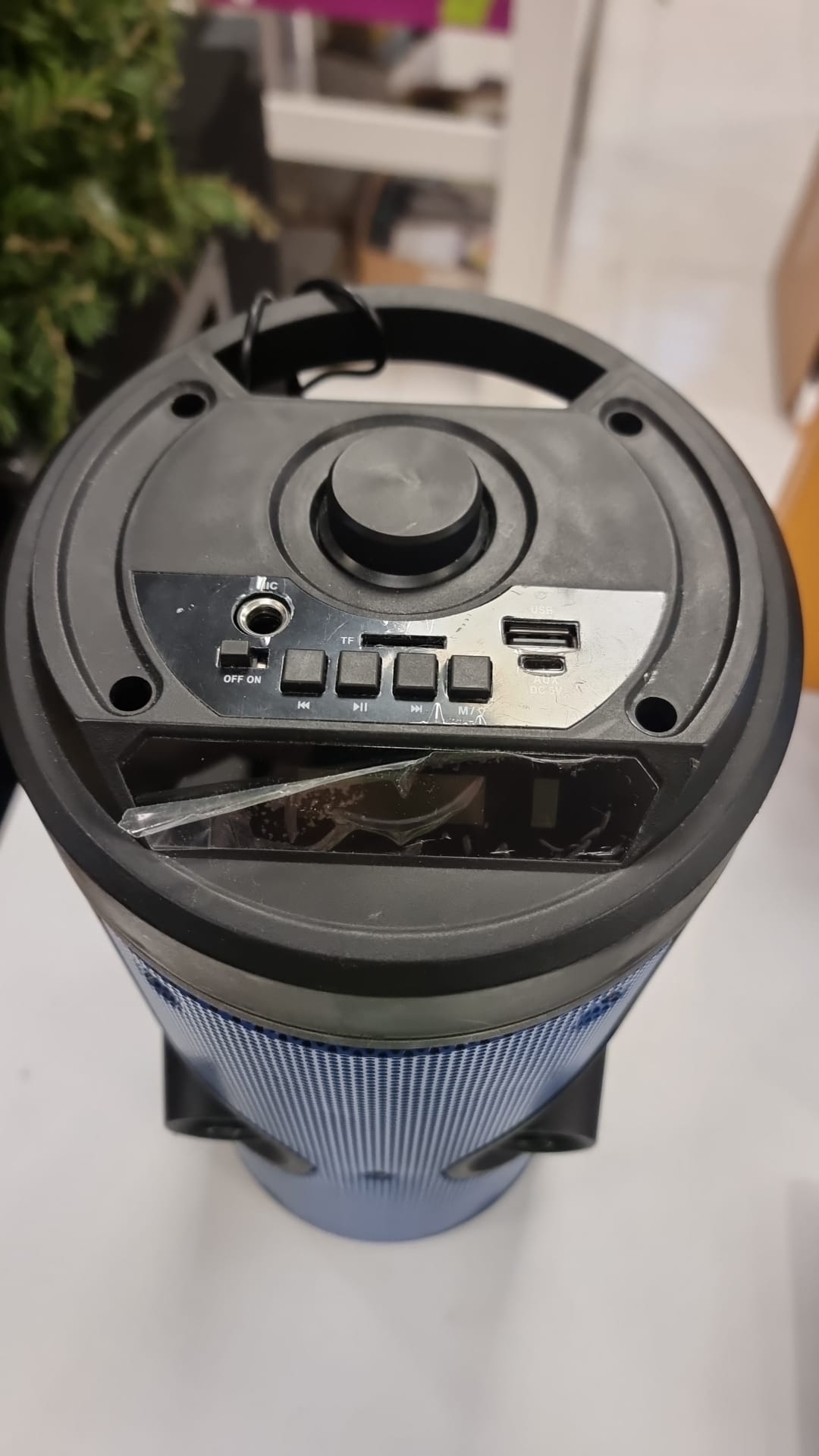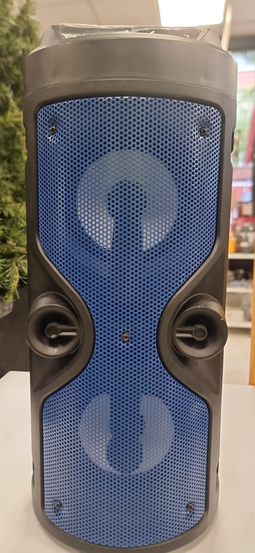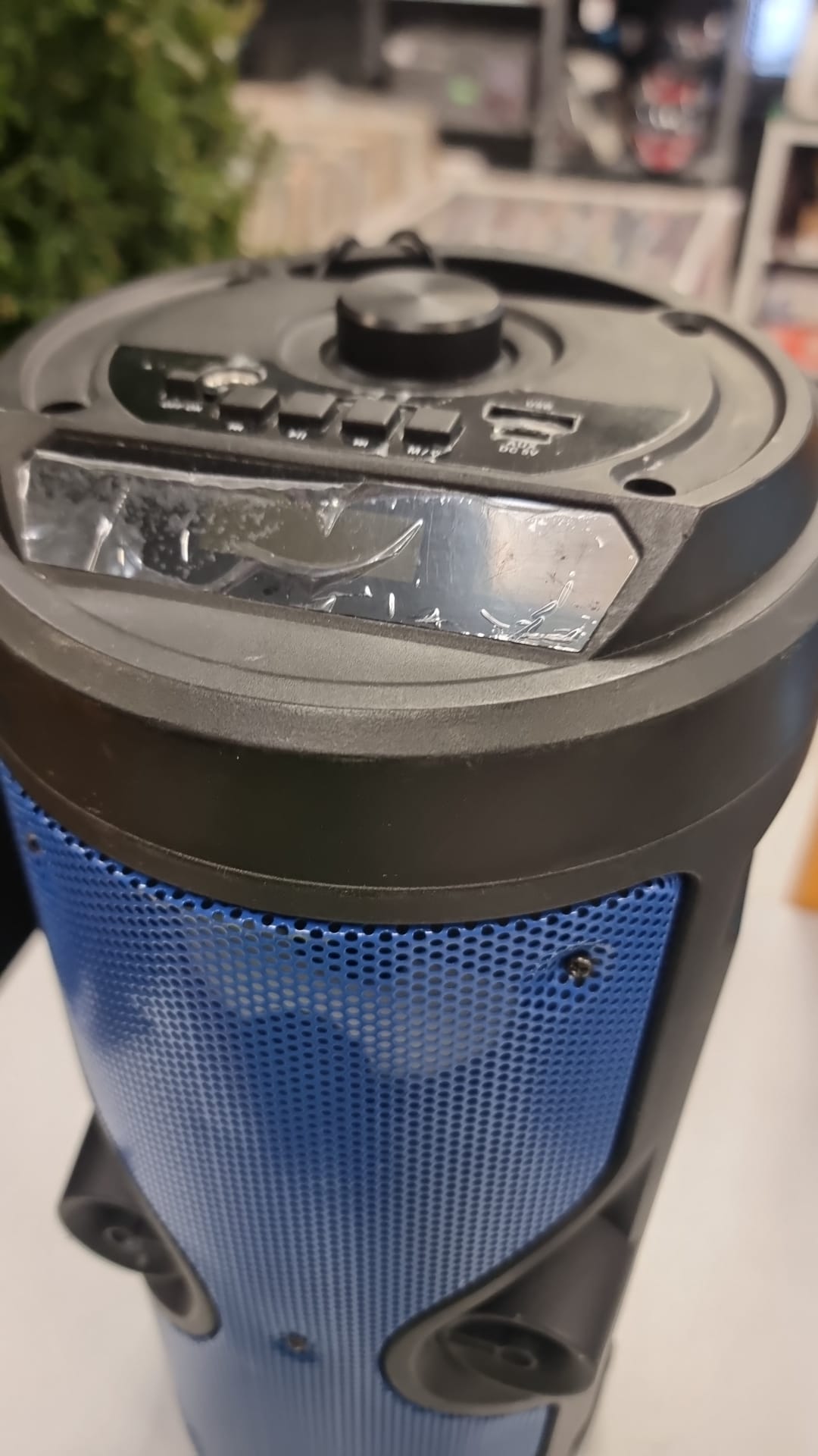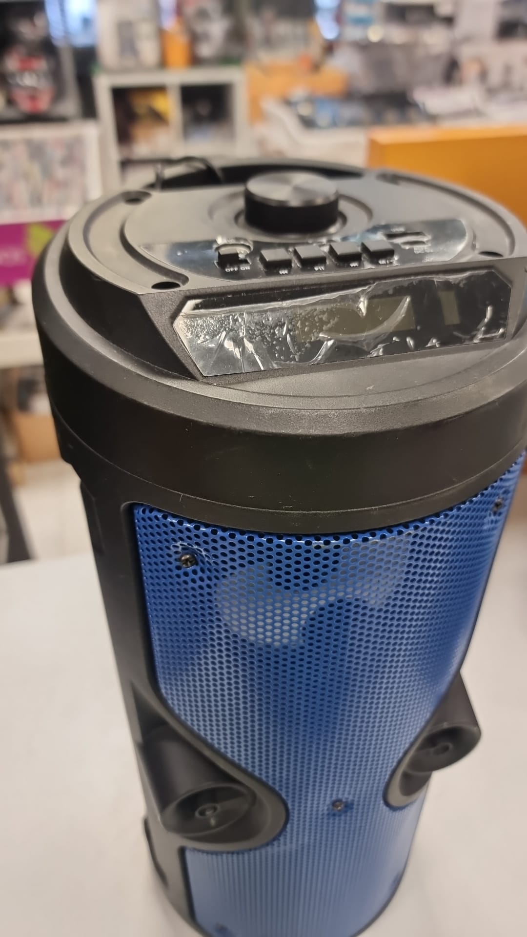Altavoz portátil con un diseño moderno y llamativo. Rejilla frontal de color azul. Acabado exterior en negro. Dos pequeños altavoces circulares en la parte frontal.