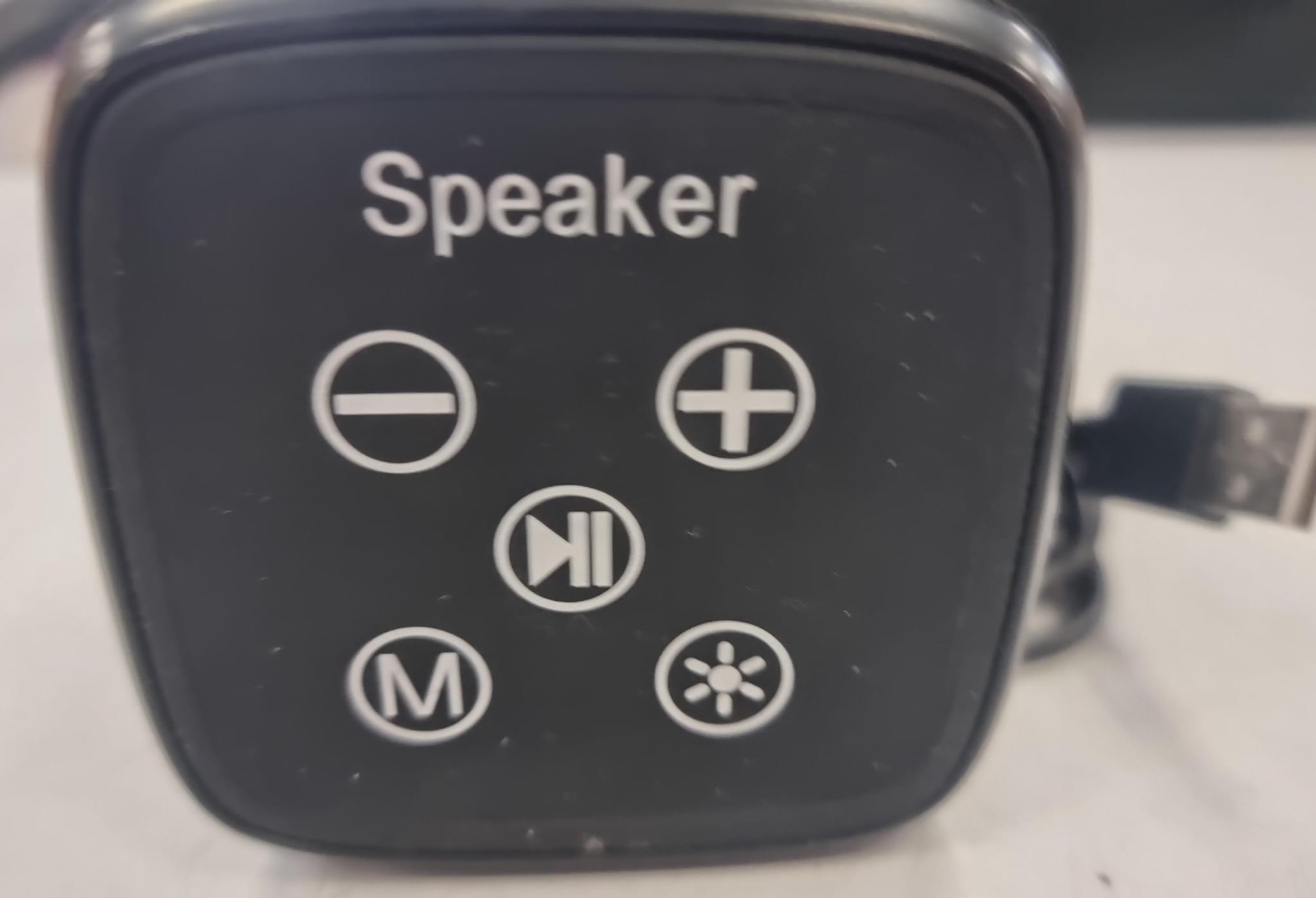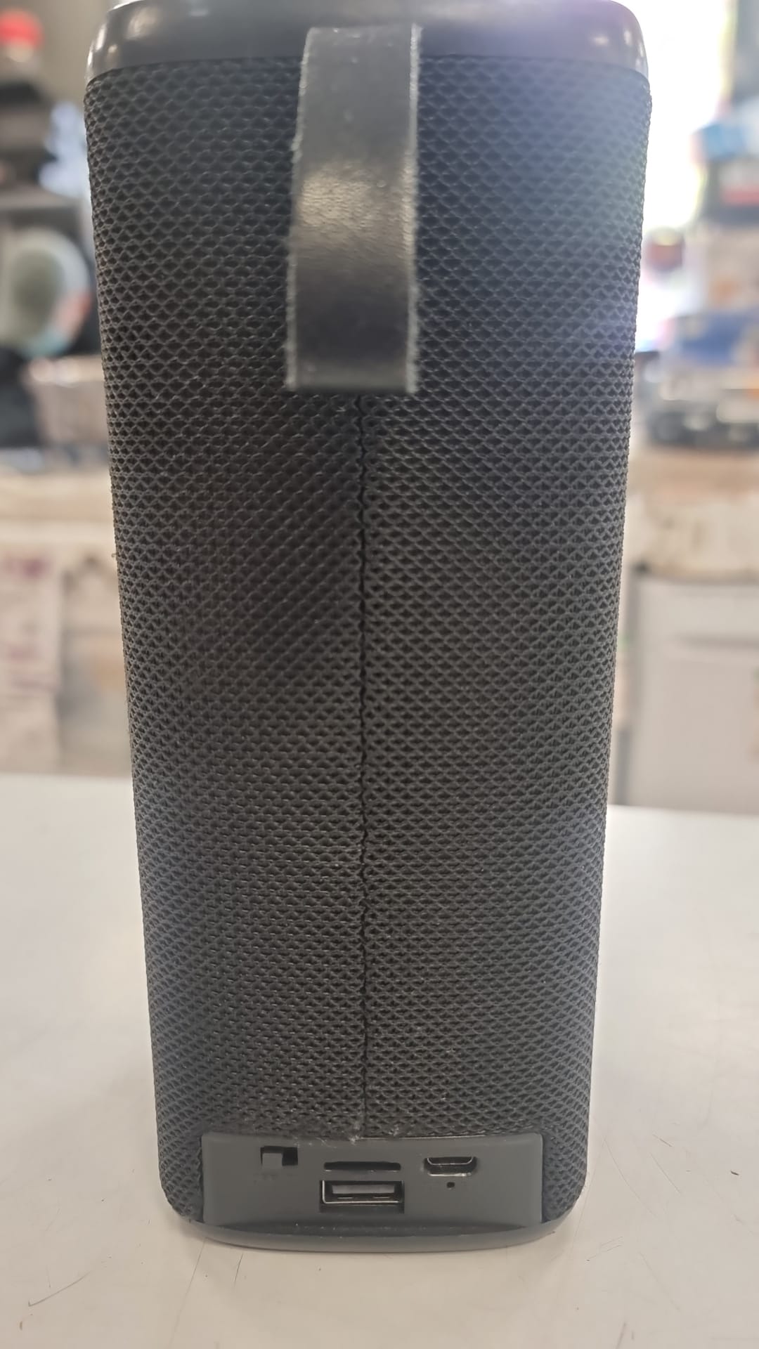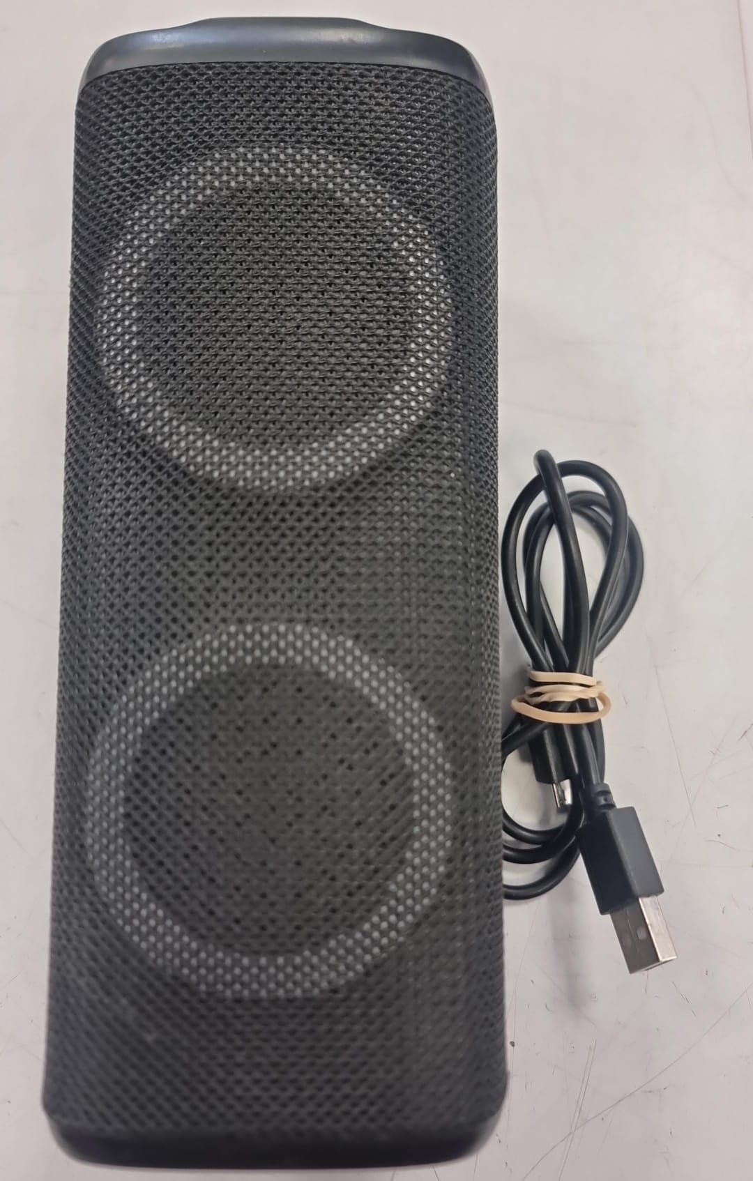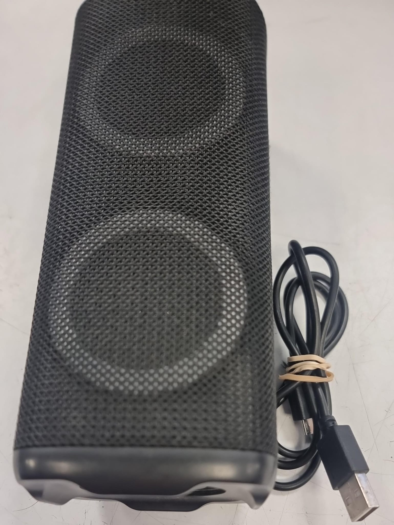 Altavoz portátil con conexión Bluetooth y USB. Diseño cilíndrico. Malla protectora en toda la superficie. Incluye cable de carga USB.