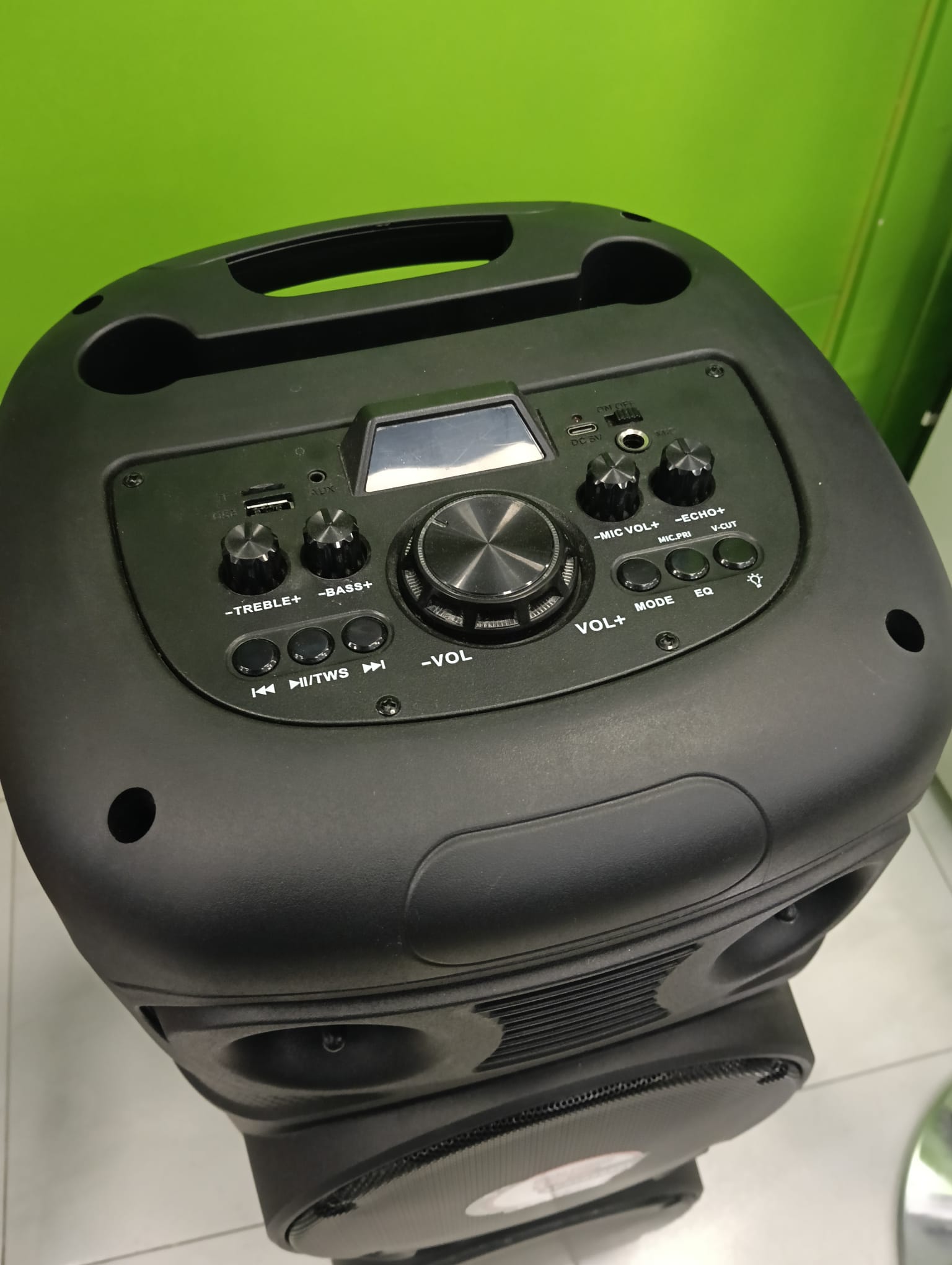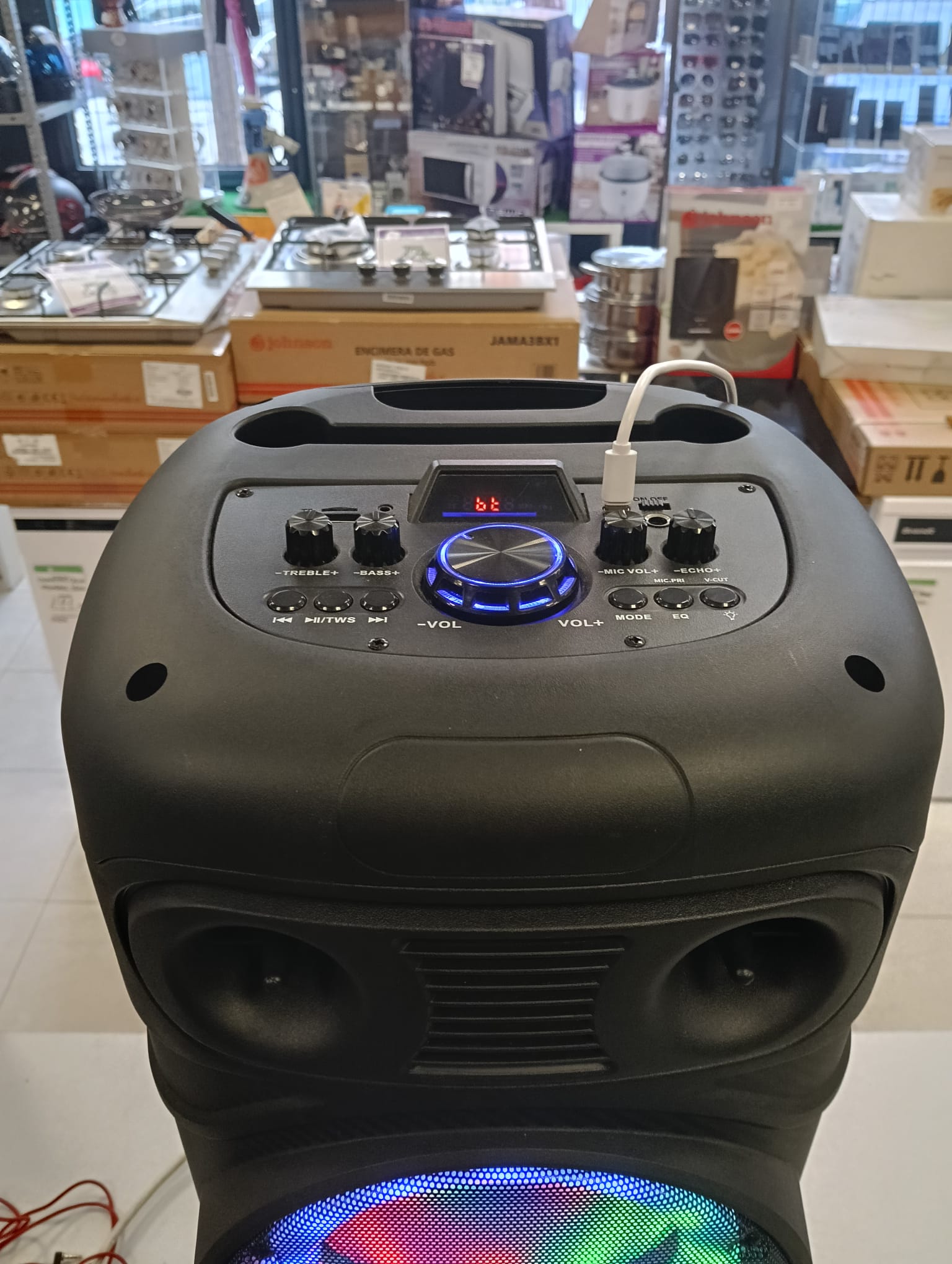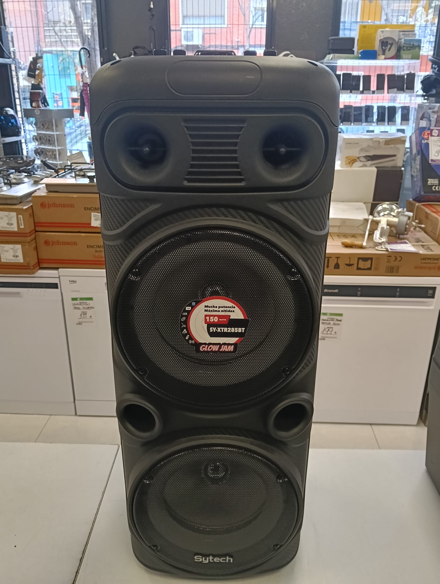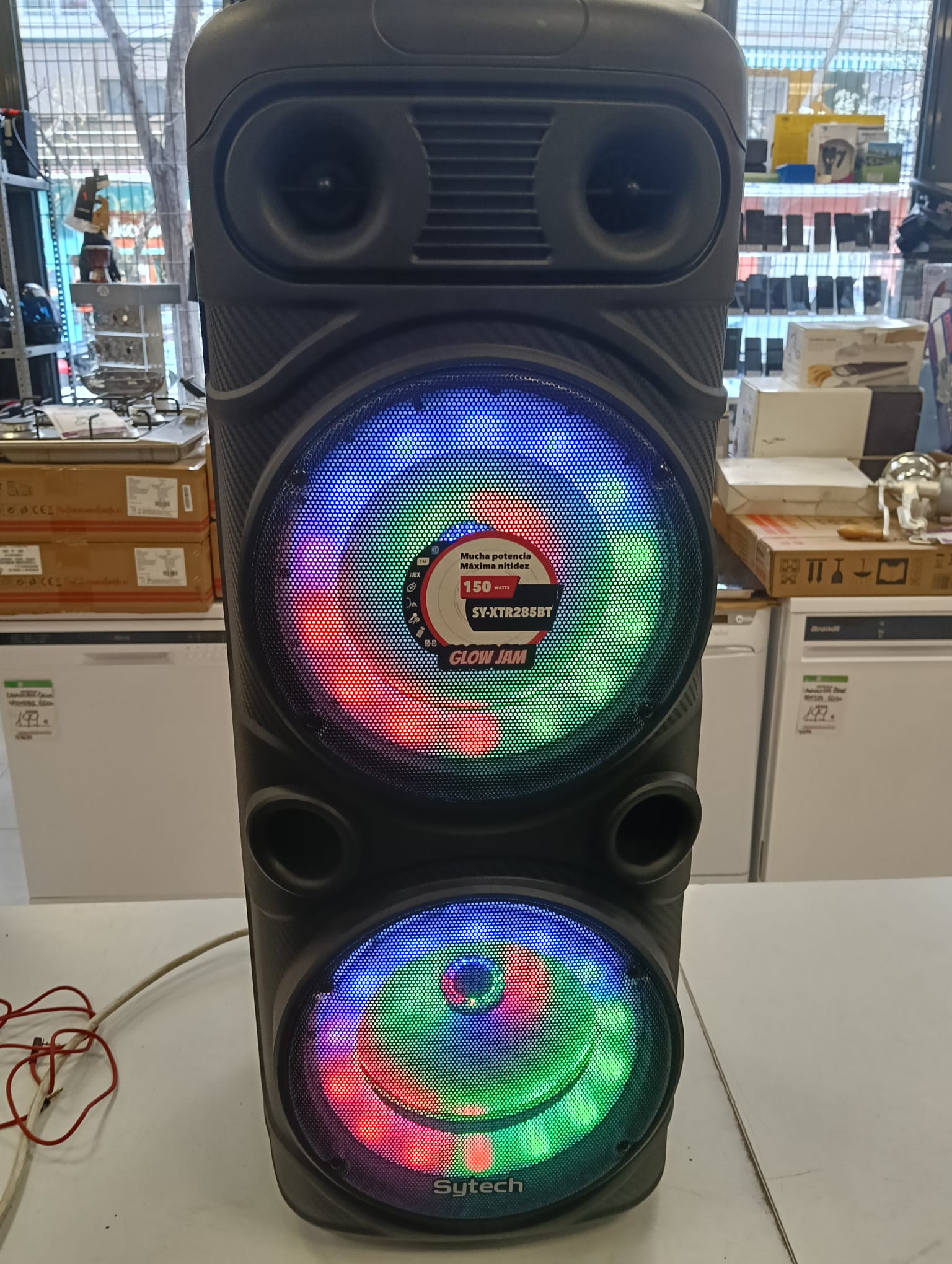 Altavoz portátil Sytech con luces LED. Modelo SY-XTR285BT. Conectividad Bluetooth. Función Glow Jam con luces. Diseño moderno en color negro y multicolor. Funciona conectado, batería mal