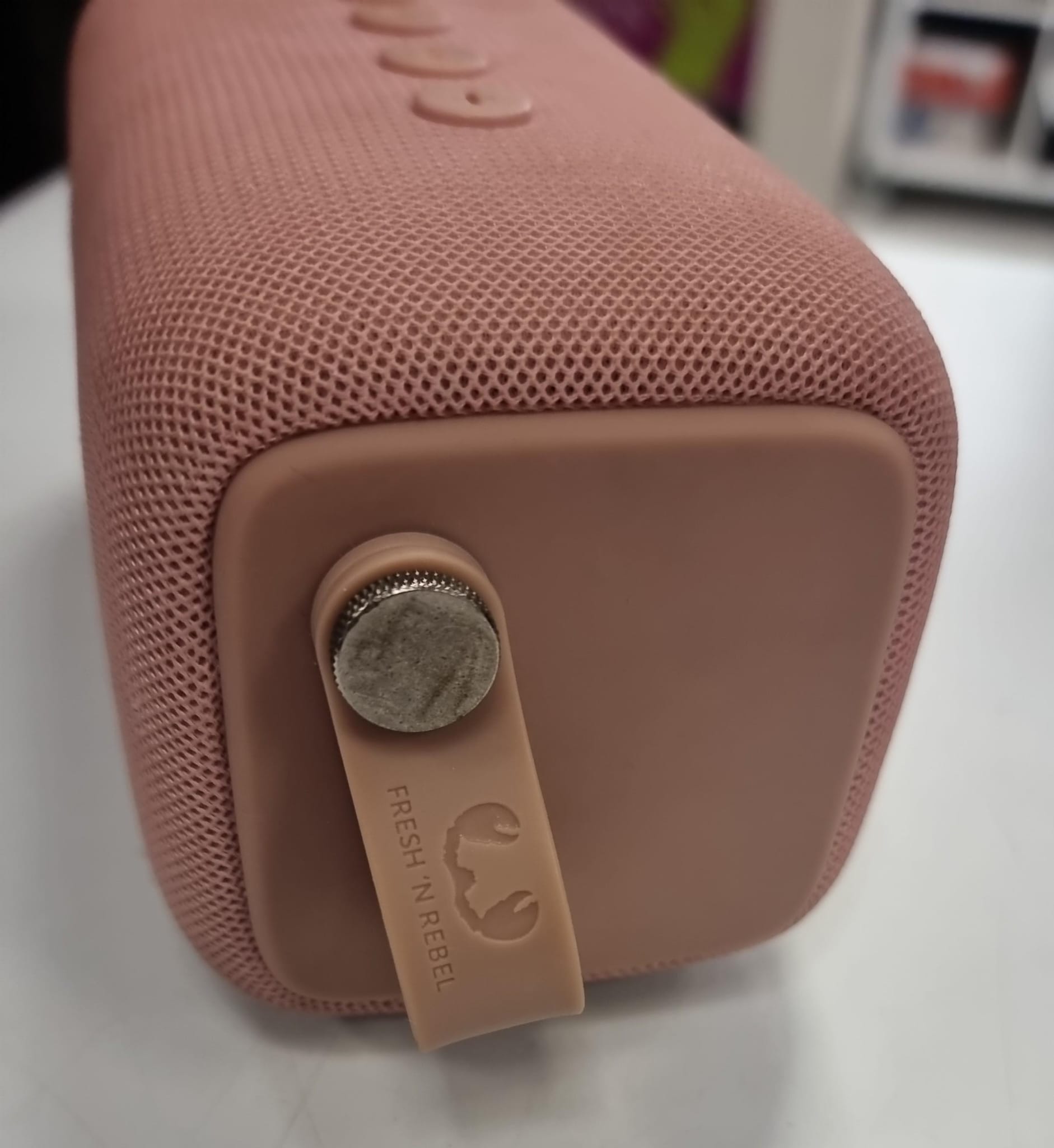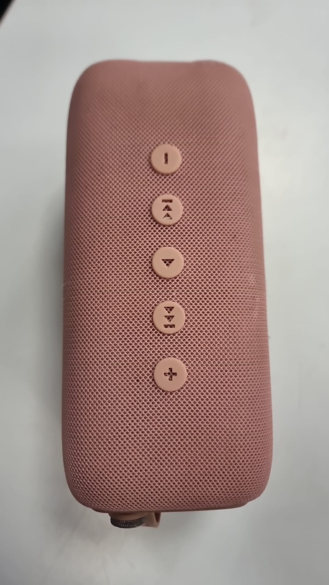 Altavoz Rockbox Bold M en color rosa. Un diseño moderno y compacto.Acabado en tela Signos visibles de uso. Botones de control en la parte superior.