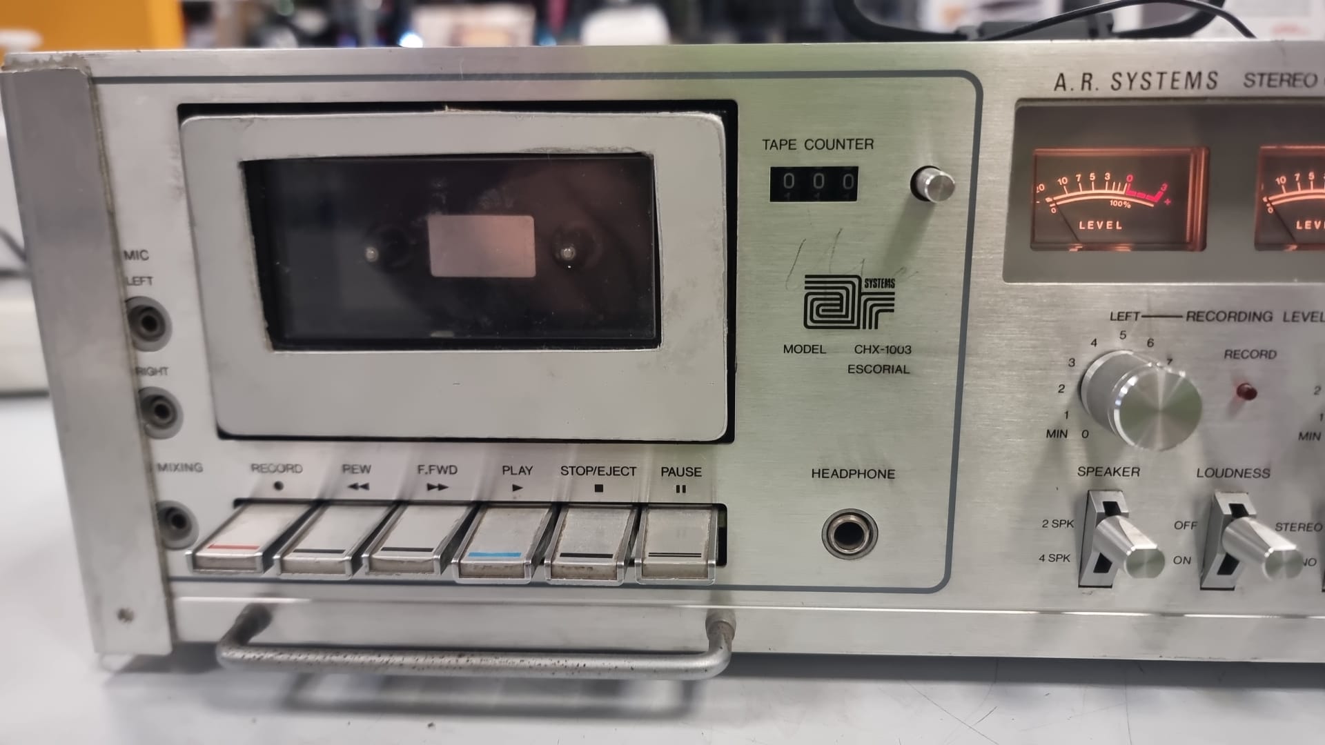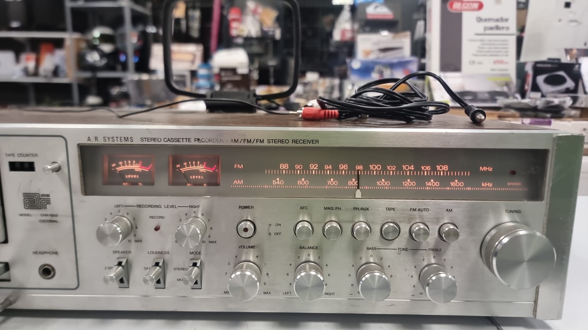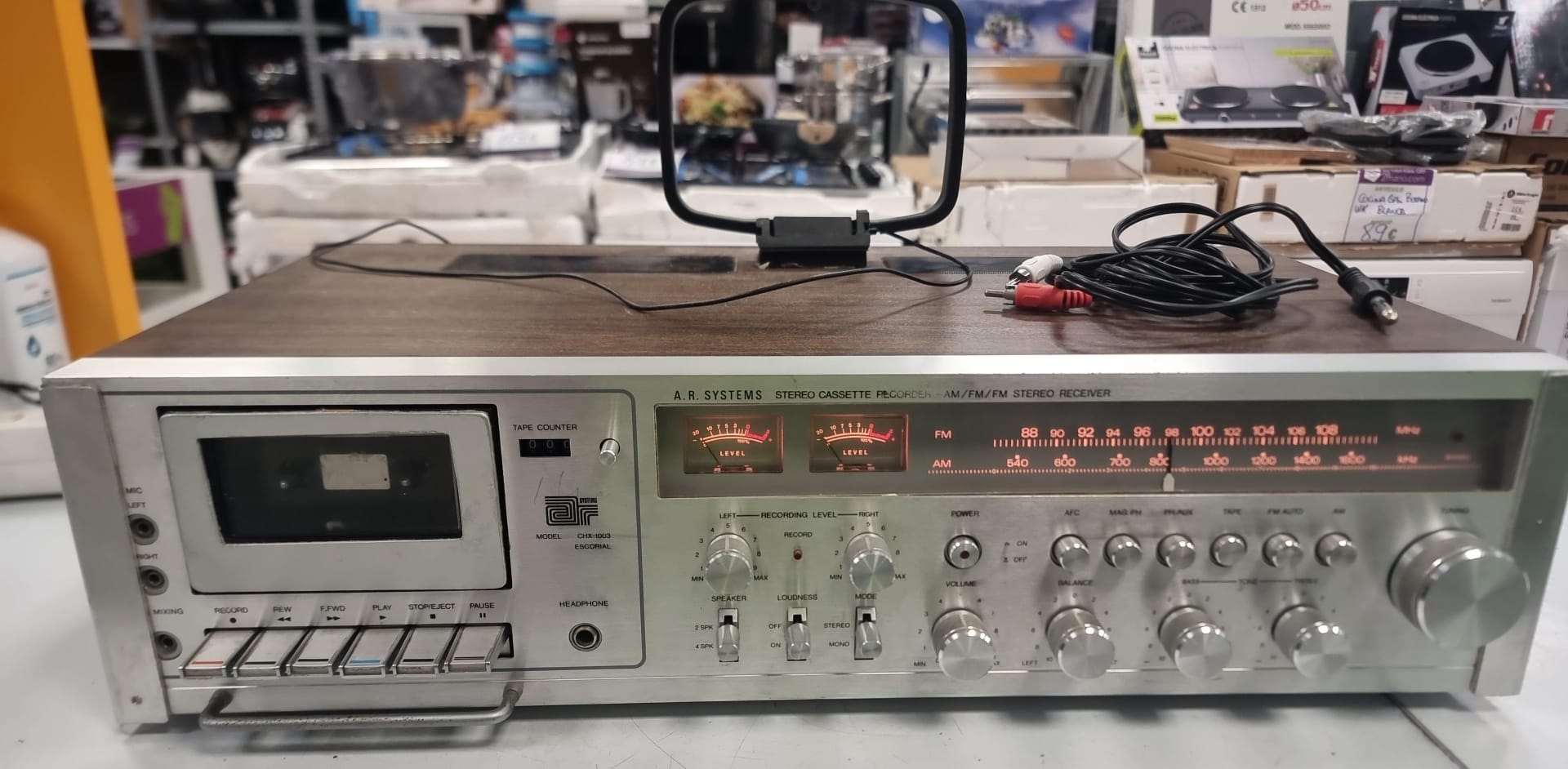 Receptor estéreo con reproductor de cassette integrado. Modelo: CHX0-1003 Sintonizador AM/FM/FM estéreo Indicadores de nivel de grabación.