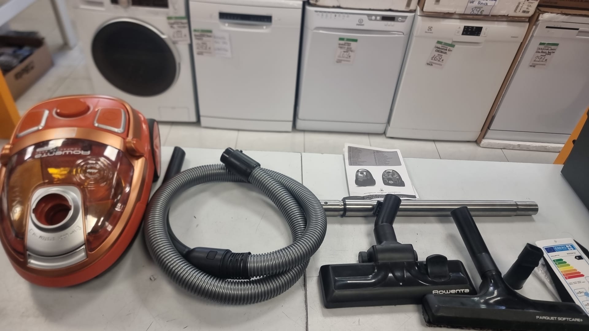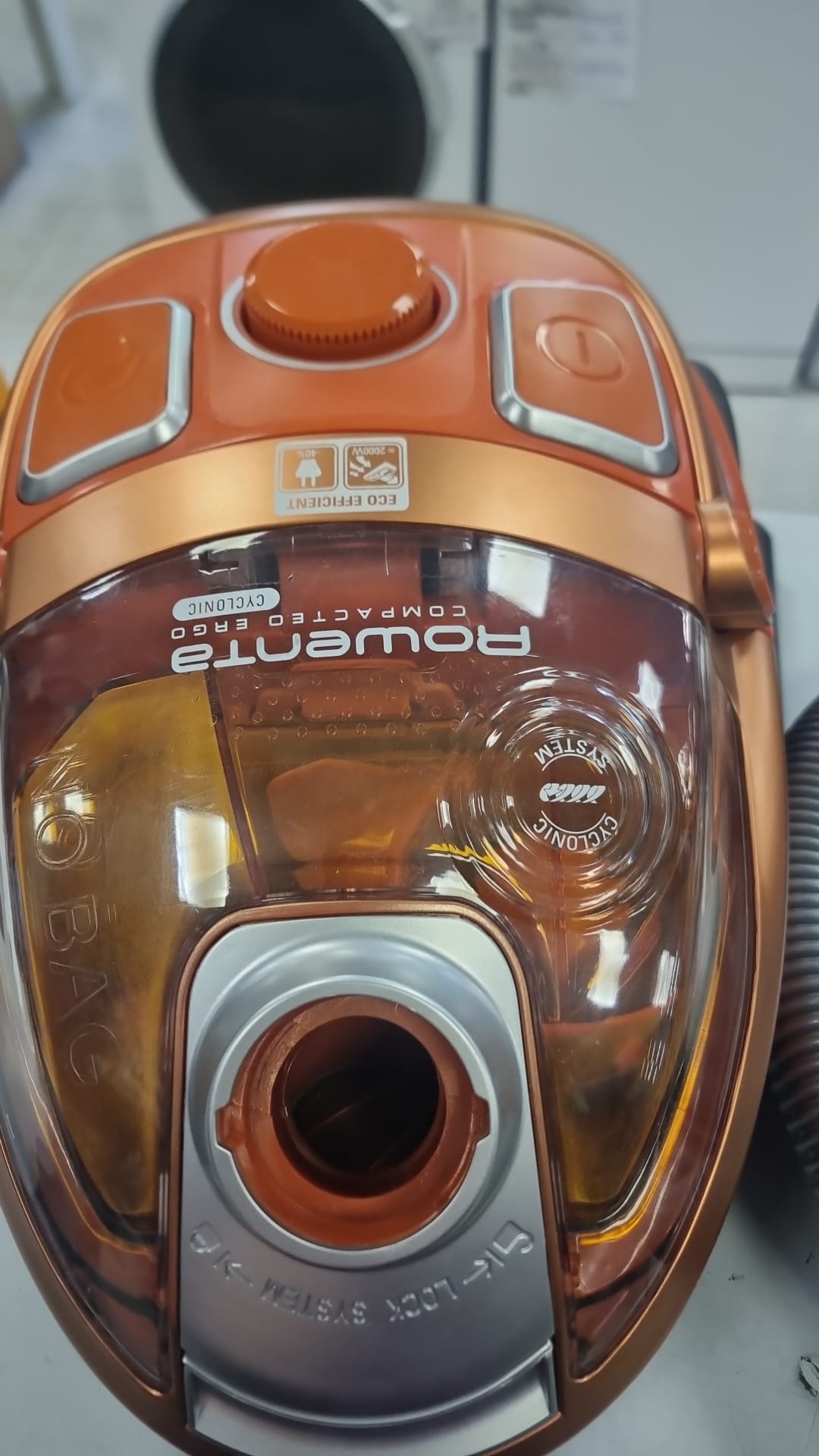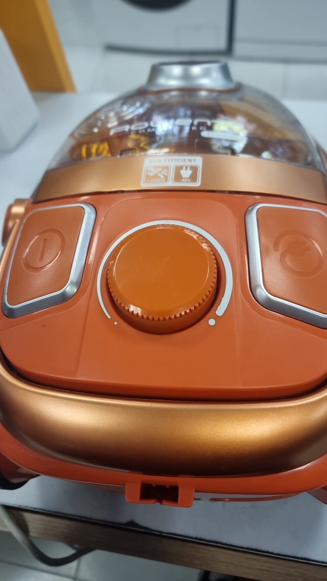 Aspiradora Rowenta en color naranja y cobre. Incluye varios accesorios para una limpieza completa. Aspiradora Rowenta Cyclonic. Modelo RO5334EA. Color naranja y cobre. Manguera flexible. Tubo telescópico. Cepillo principal. Cepillo para parquet. Aspirador trineo dotado de una potencia de 2000 W.