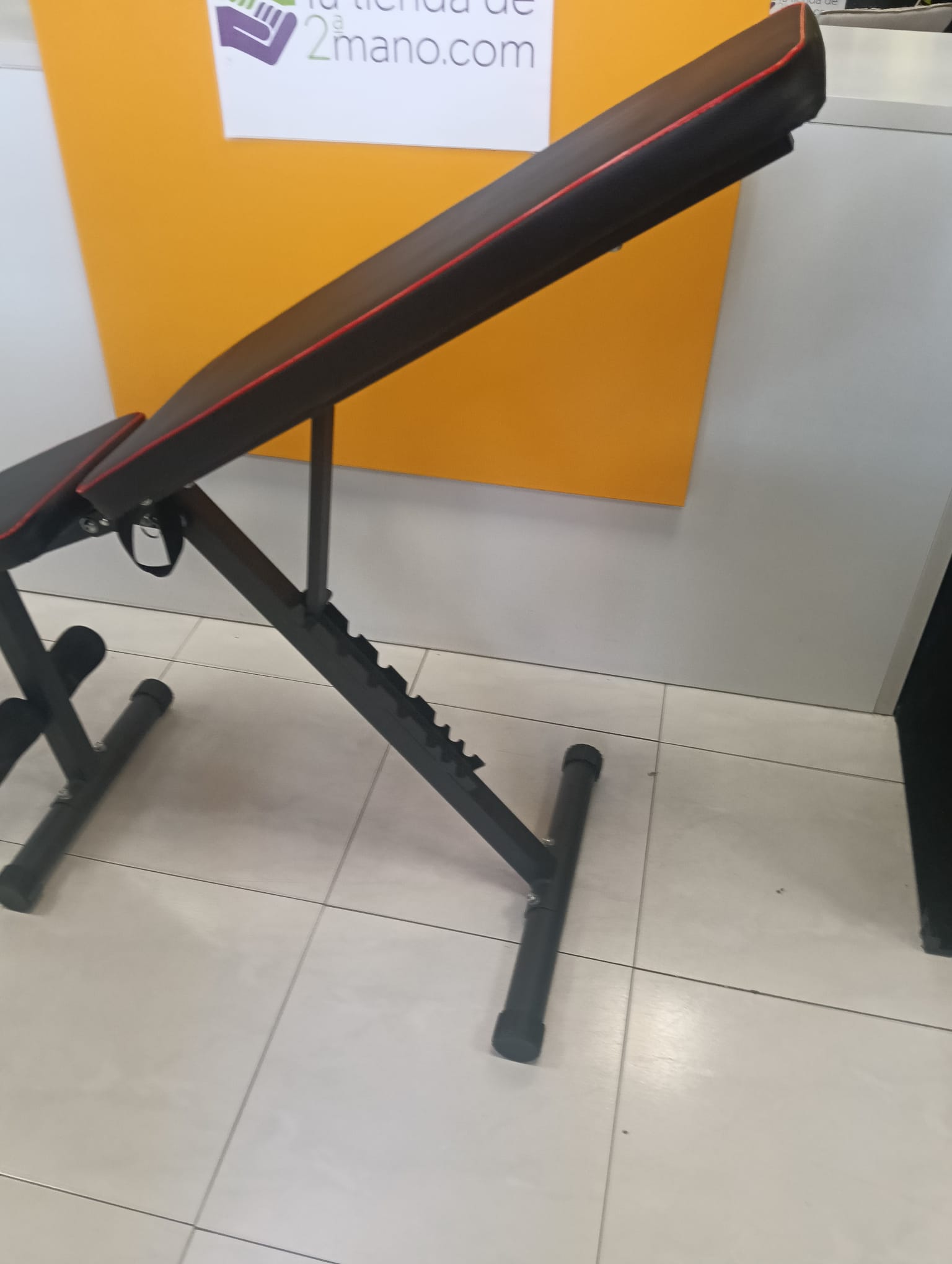 Banco de abdominales, modelo Yoleo. Fácil de plegar y guardar. Respaldo reclinable, Tapizado color negro. Respaldo en varias alturas.