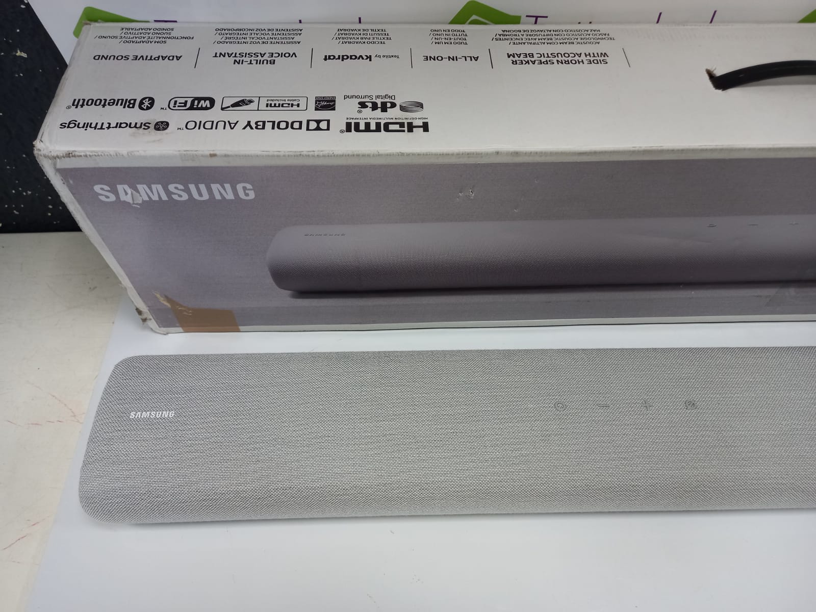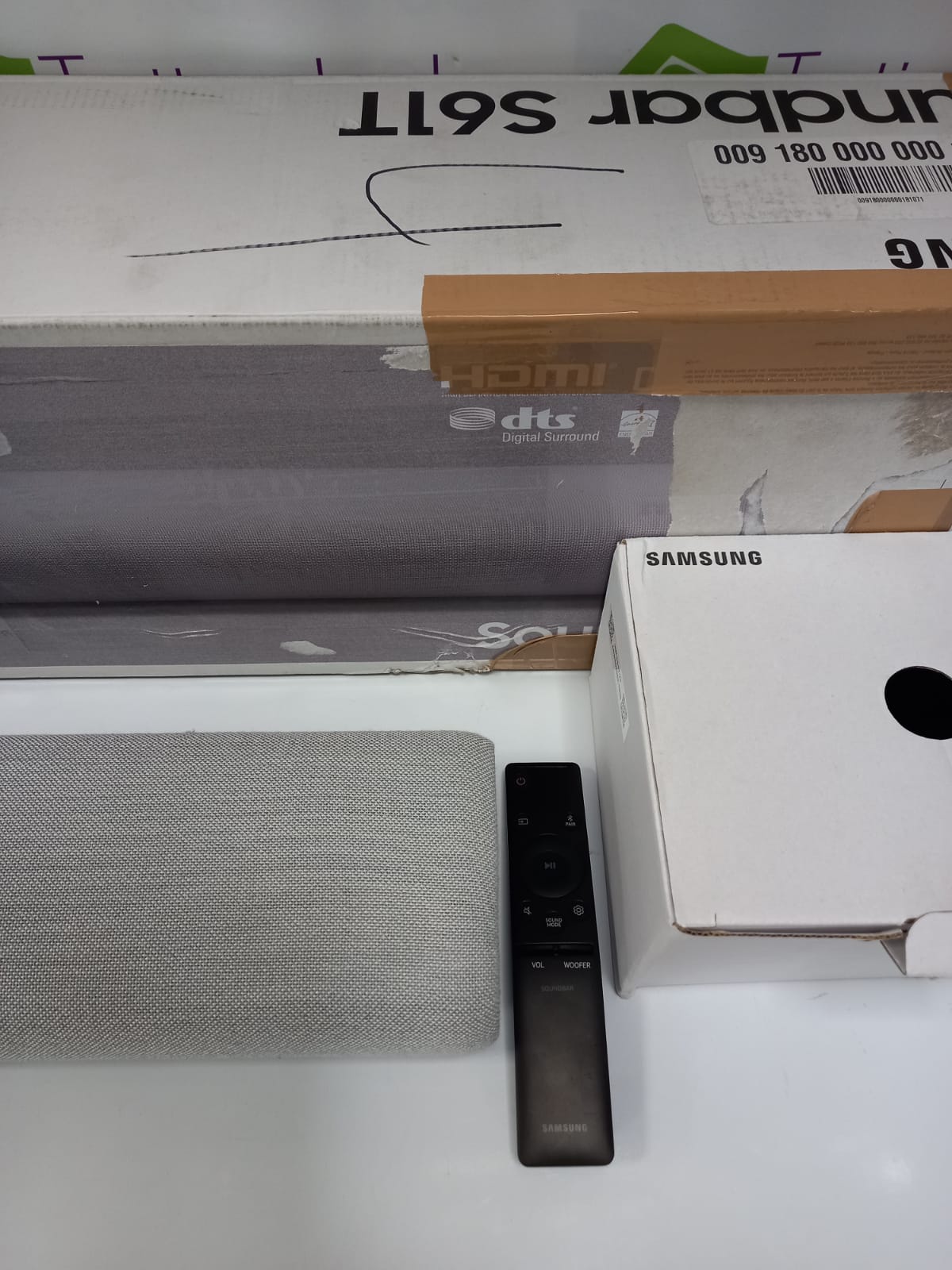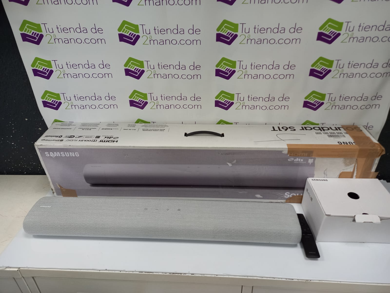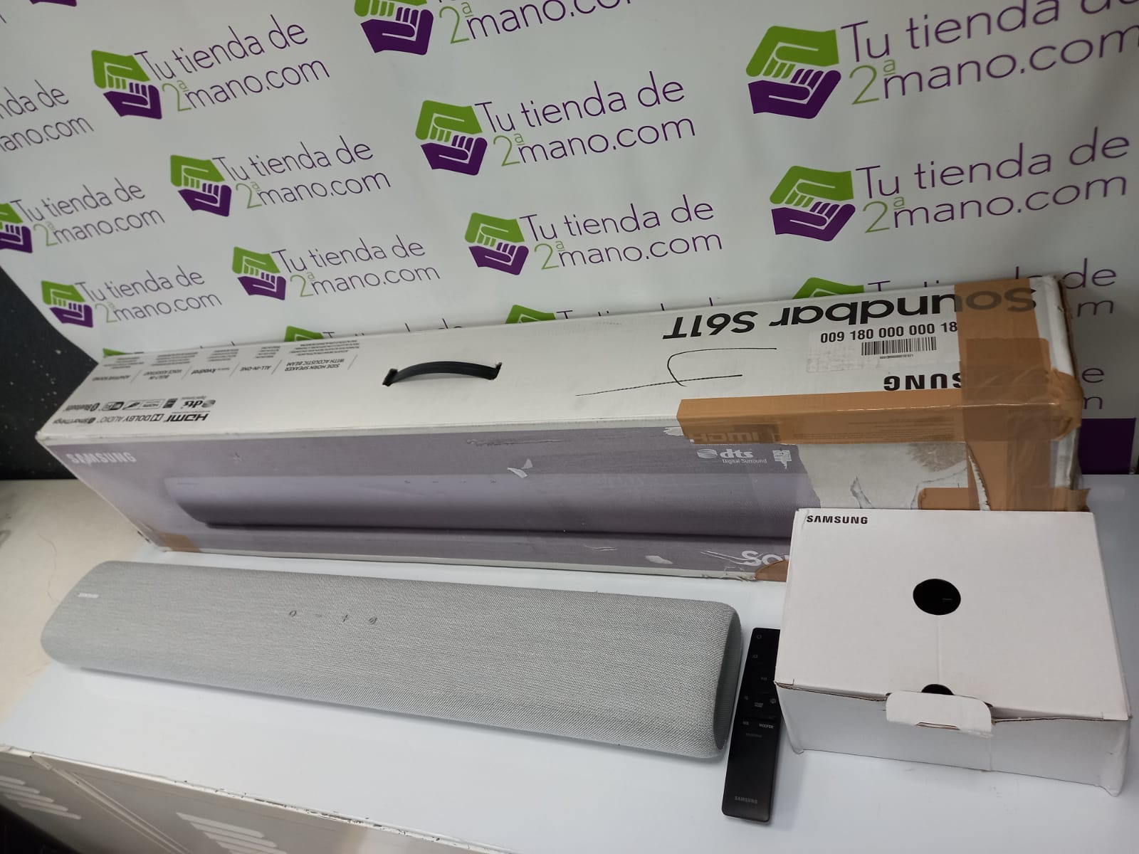 Barra de sonido marca Samsung modelo SOUNDBAR HW-S61T. 180 W. 4 canales. 6 altavoces. Sonido envolvente en sincronización con la acción en la pantalla. Asistentes de voz integrados. Conexión HDMI, Wi-Fi y Bluetooth. Dimensiones de 76.4 x 6.6 x 12.5 cm. Viene con mando. Reacondicionado.