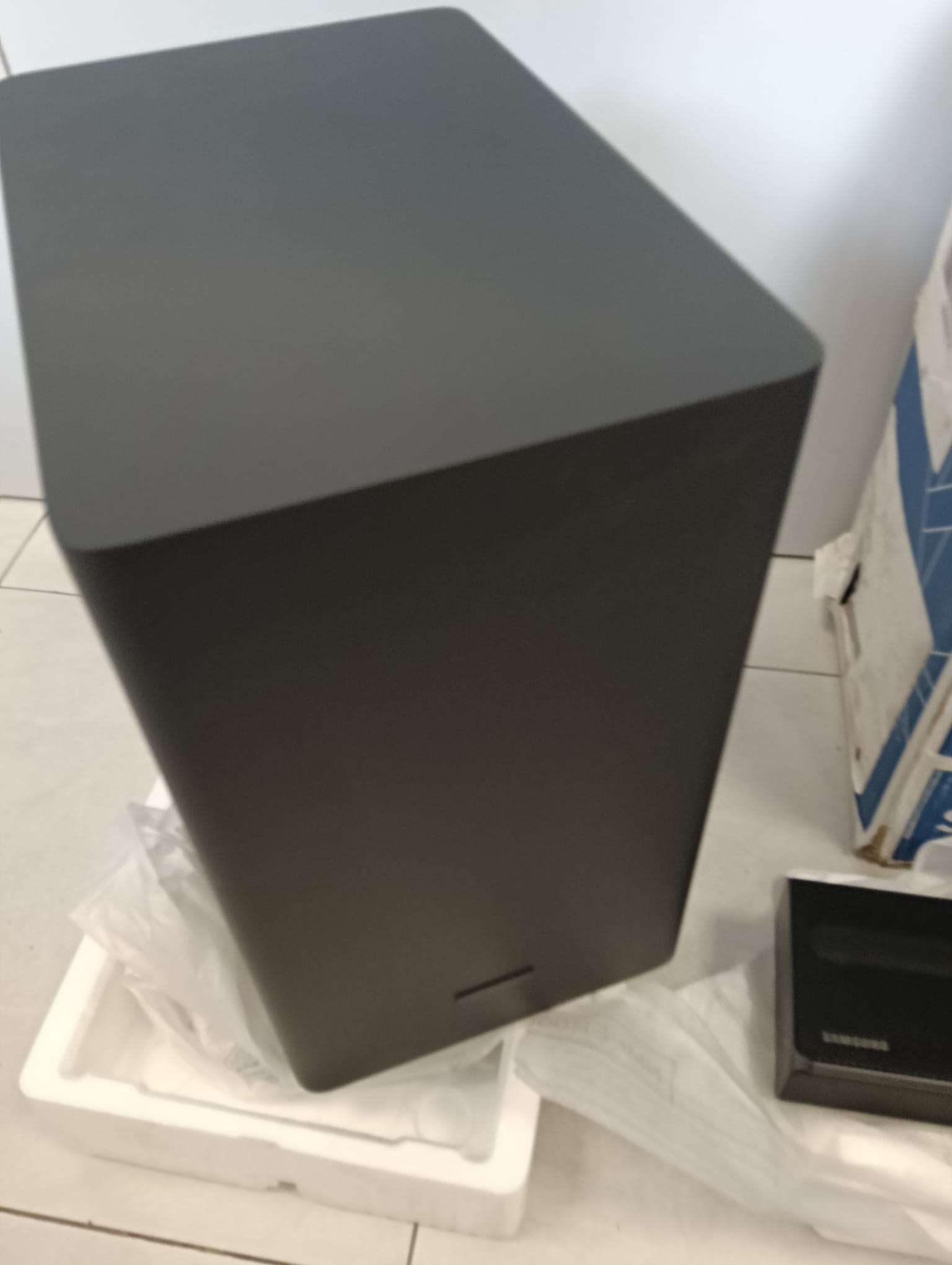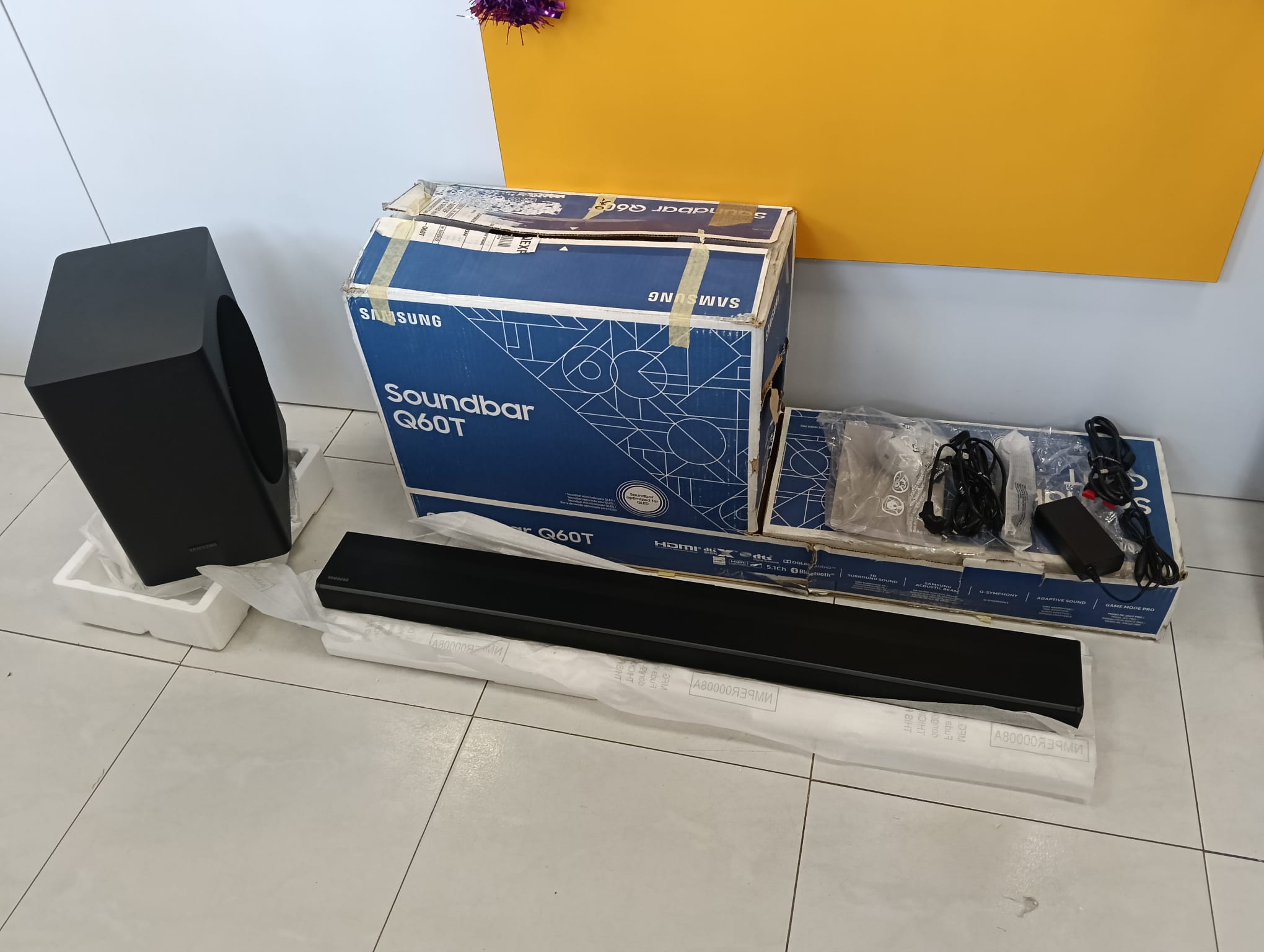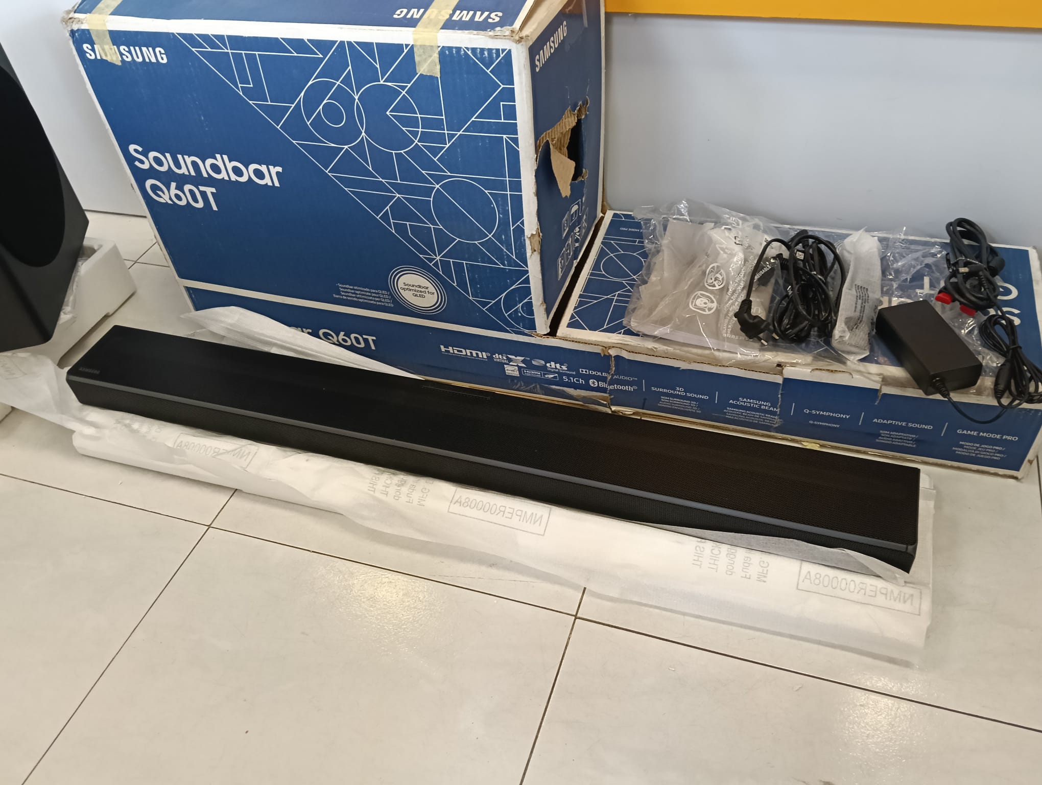 Barra de sonido marca Samsung modelo SOUNDBAR Q60T. Sonido envolvente 3D. Sonido adaptativo. 360W. Dimensiones de 1036.0 x 460.0 x 252.0 mm. 5.1 canales. 9 altavoces. Dolby 5.1. 4K Video Pass. HDR 10+. Bluetooth. HDMI. Bluetooth Multi Connection. Producto reacondicionado. Viene como se aprecia en las imágenes.