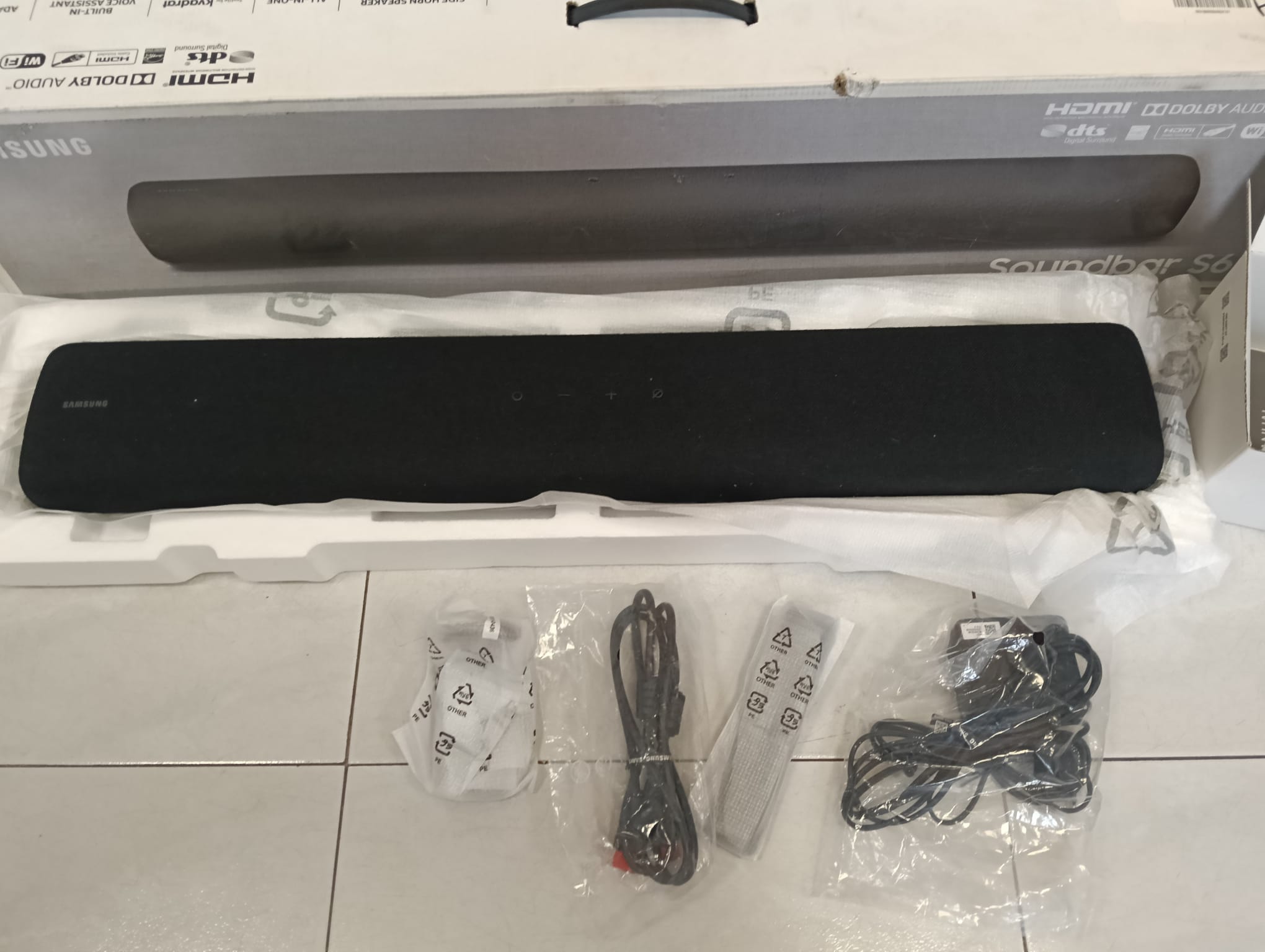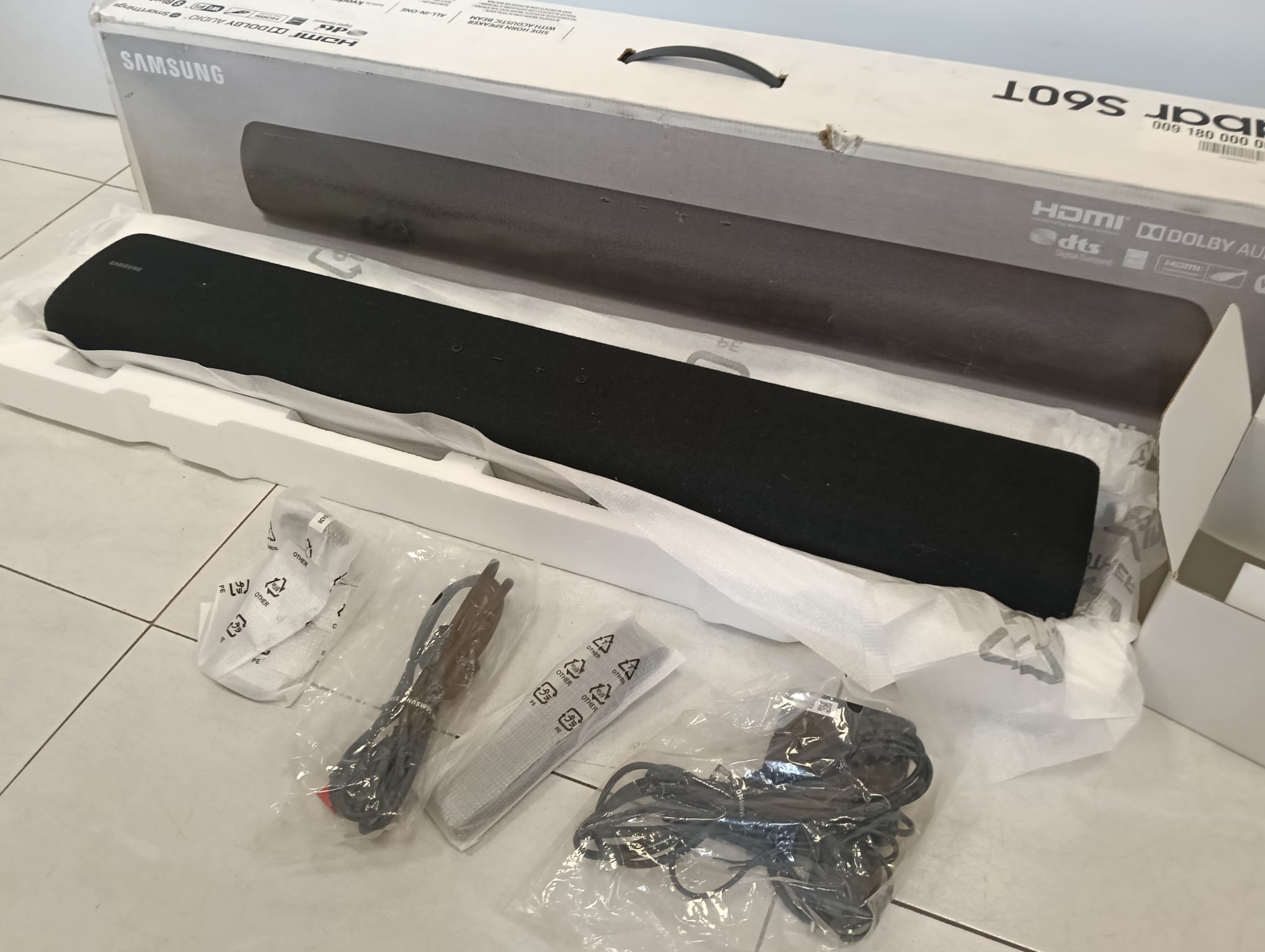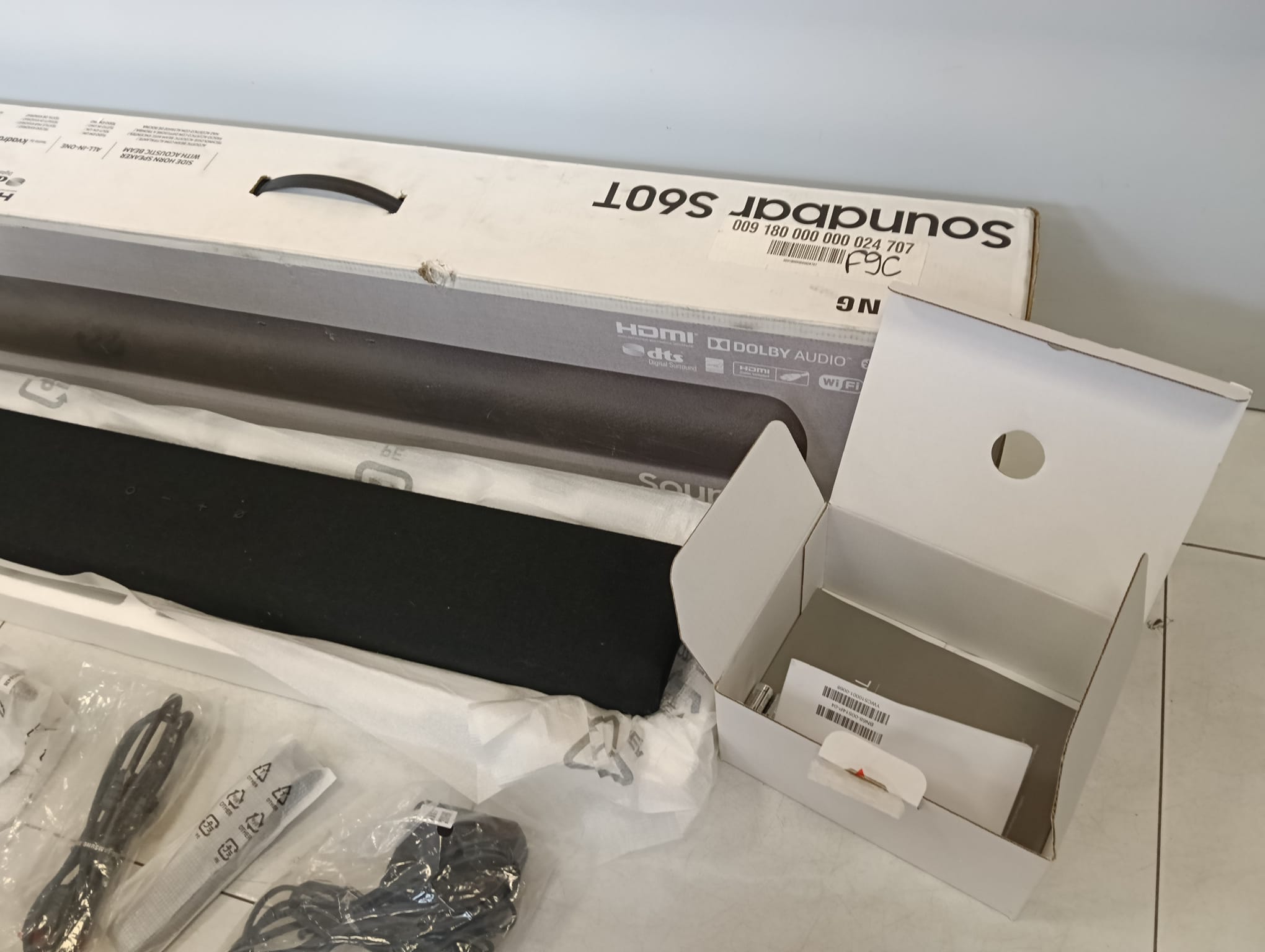 Barra de sonido Samsung S60T en color negro y gris. Ofrece una experiencia de audio inmersiva.Compatible con Dolby Audio y DTS. Conectividad HDMI y Wi-Fi.