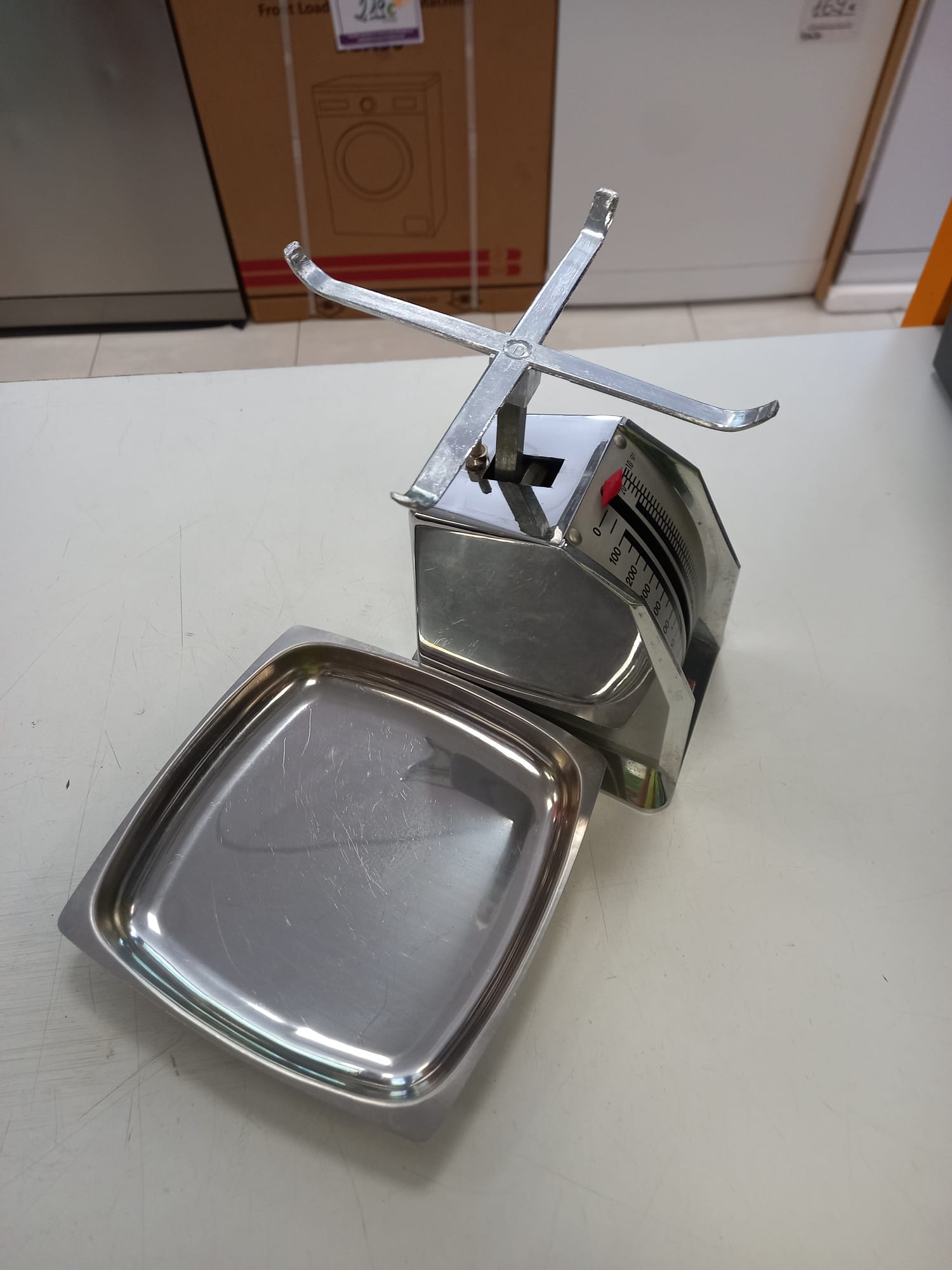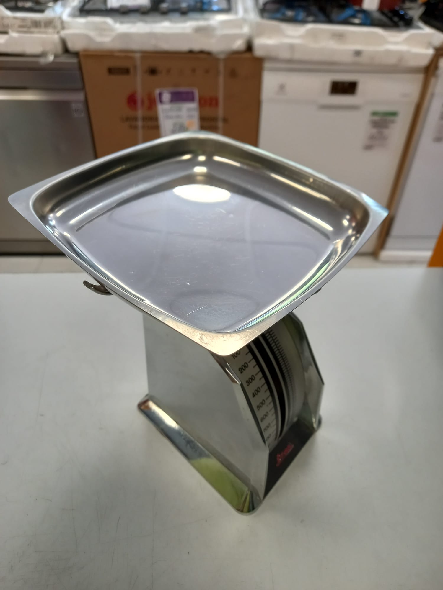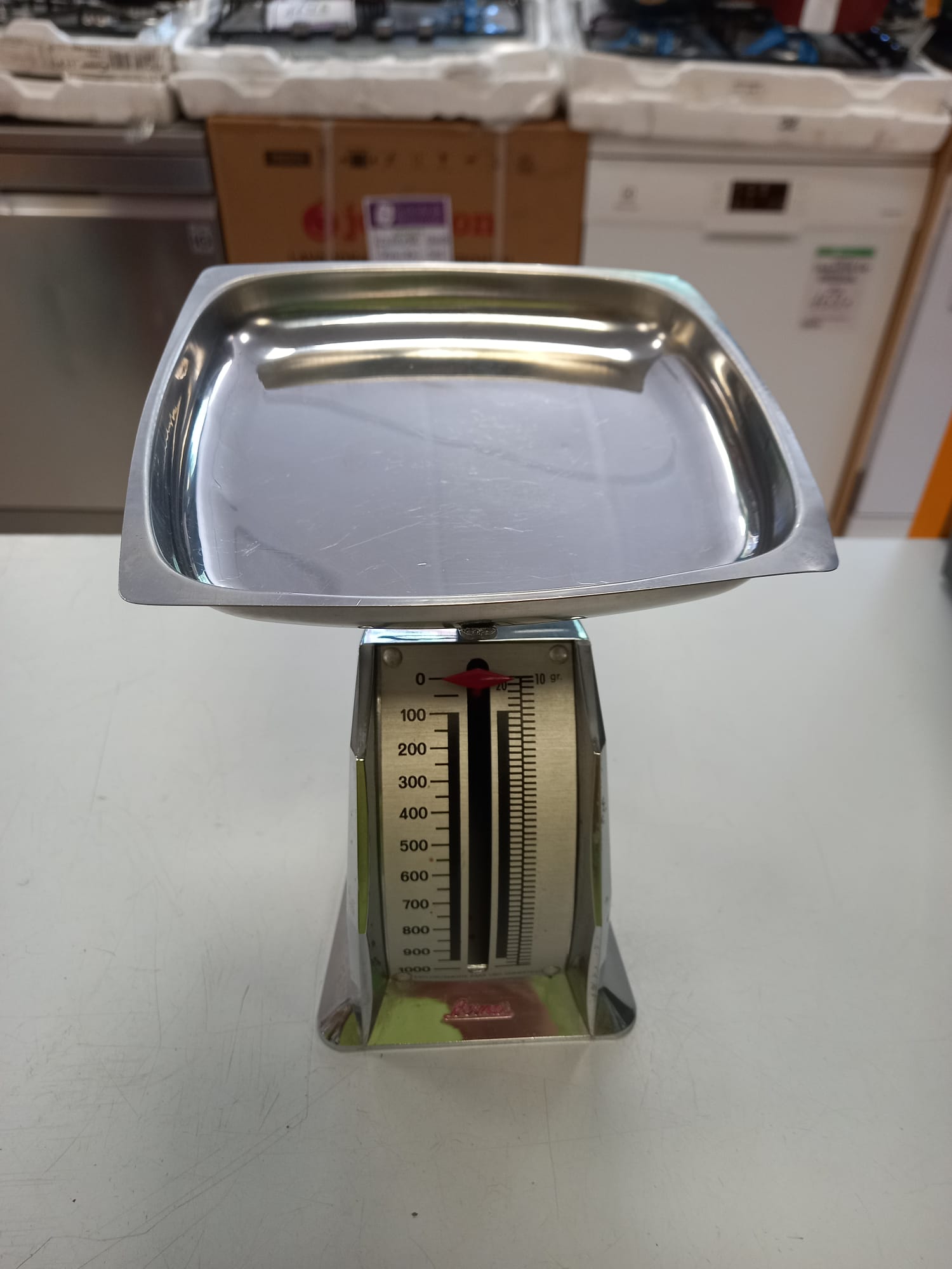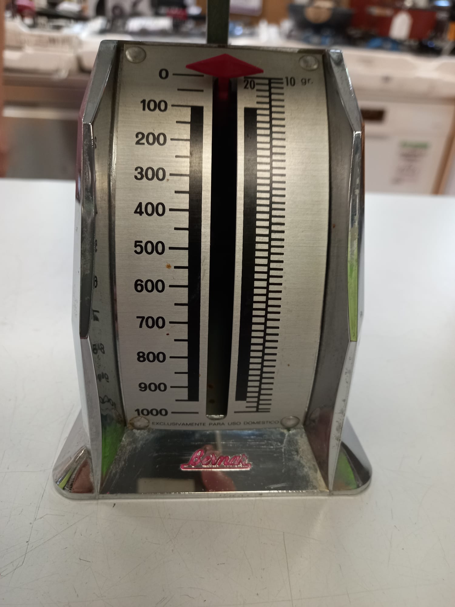 Báscula de cocina clásica de la marca Bernard. Diseño plateado. Bandeja de acero inoxidable. Escala de medición hasta 1000 gramos.