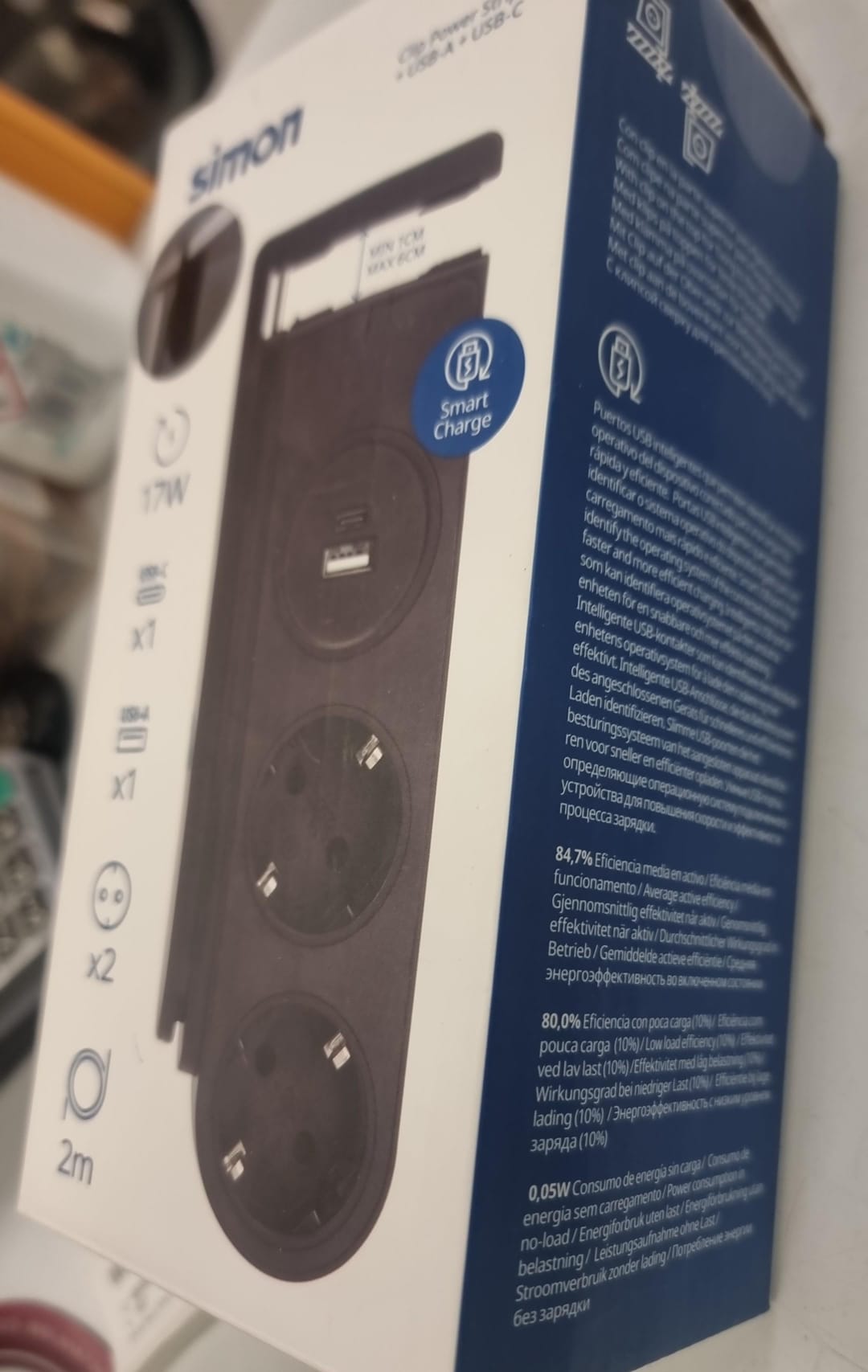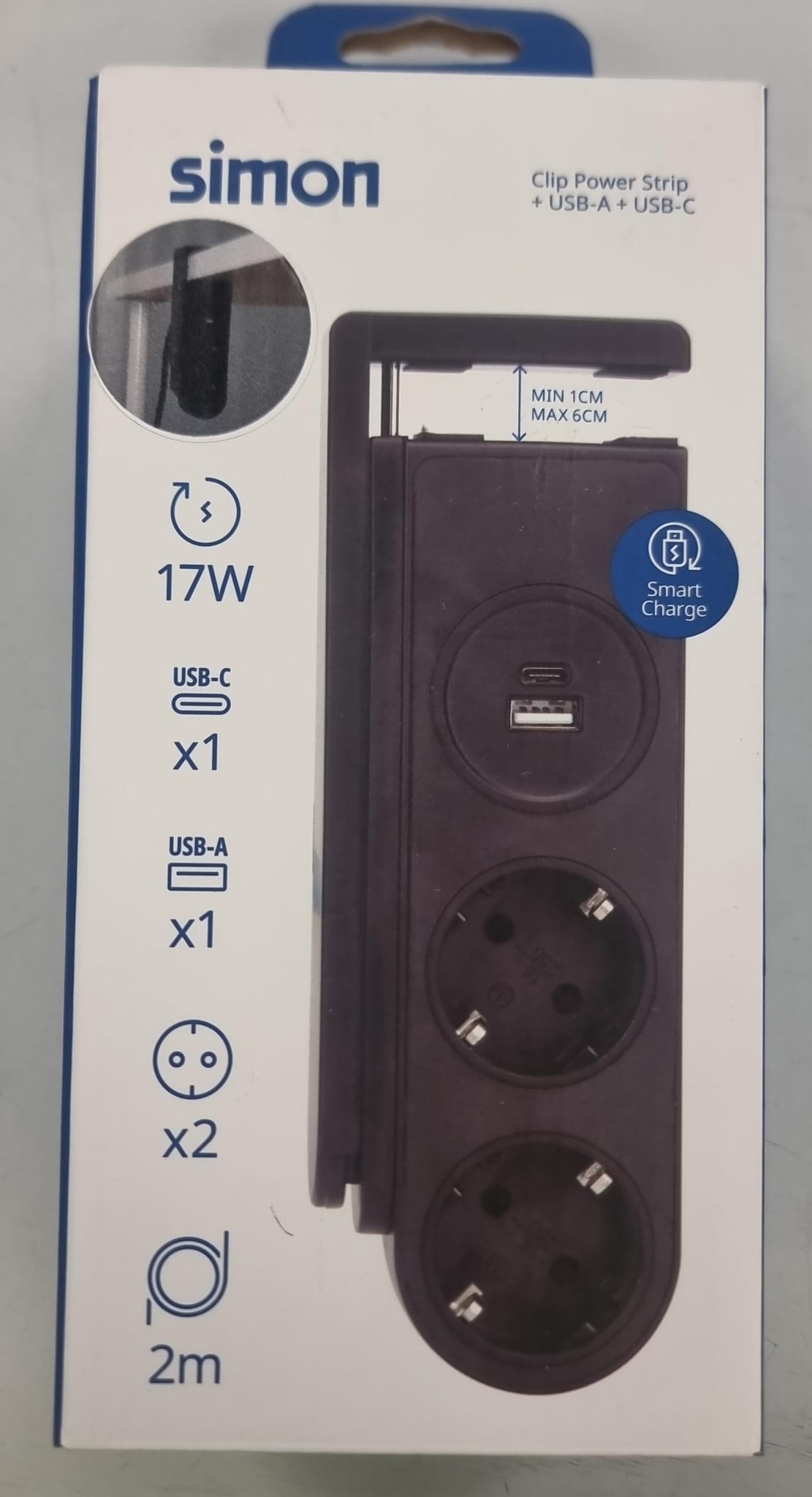 Regleta de corriente Simon con clip para fijación. Permite conectar hasta dos dispositivos con enchufe europeo y dos dispositivos USB. Potencia máxima de 17W. Incluye 1 puerto USB-C. Incluye 1 puerto USB-A. Longitud del cable: 2m.Clip ajustable para grosores de 1cm a 6cm.