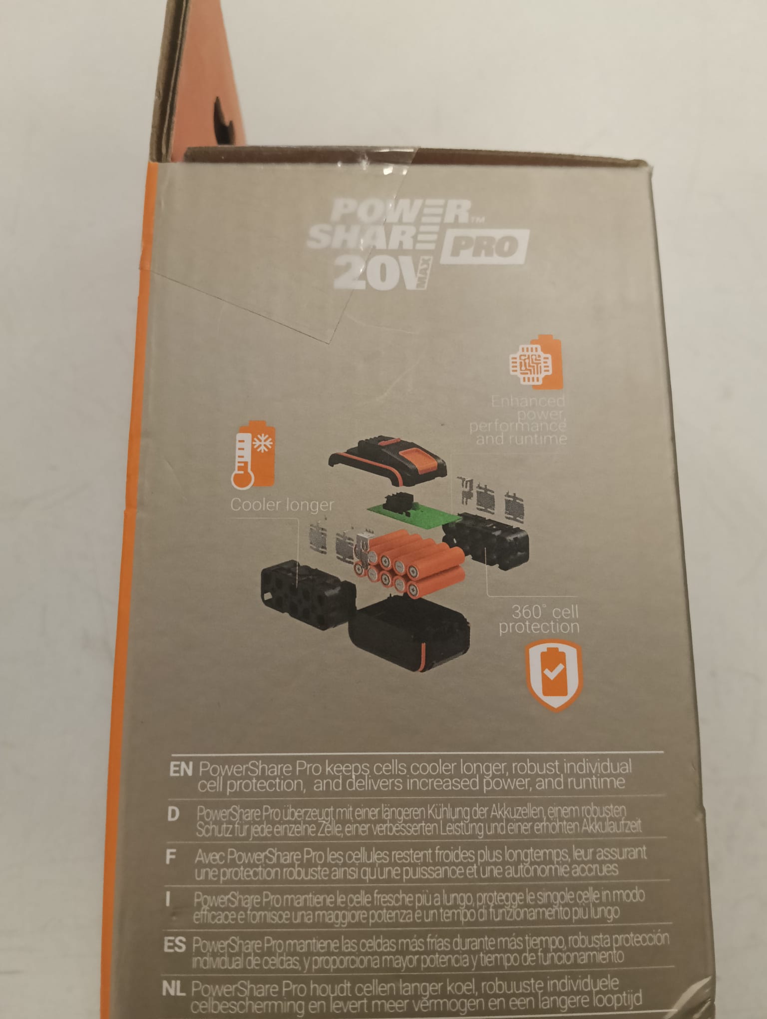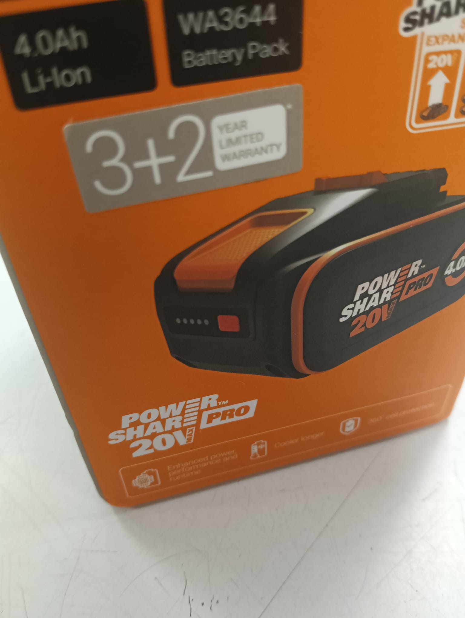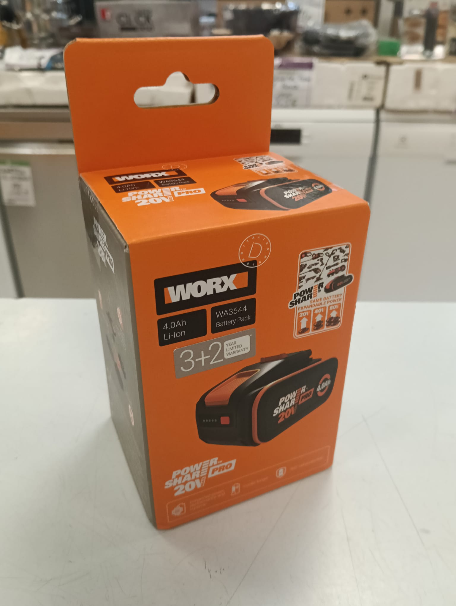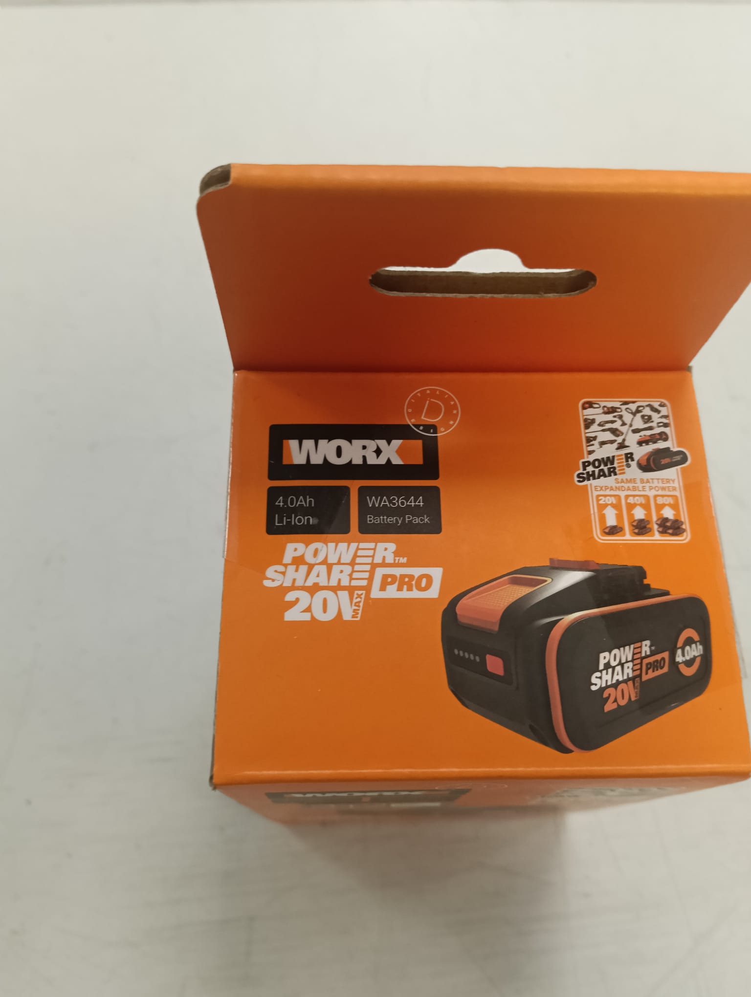 Batería de litio Worx PowerShare Pro de 20V y 4.0Ah. Modelo WA3644. Tecnología Li-ion. Compatible con la plataforma PowerShare. Indicador de carga.