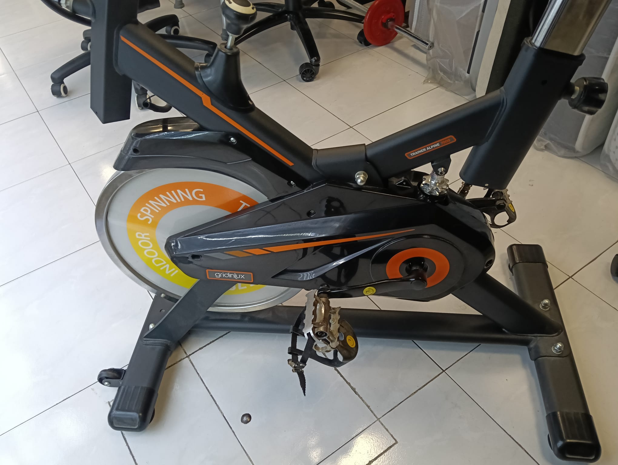Bicicleta de spinning Gridinlux modelo Alpine 7000.Diseño en color negro con detalles naranjas. Volante de inercia para entrenamiento indoor.Sillín ajustable en altura y posición. Pedales con agarre para mayor seguridad.