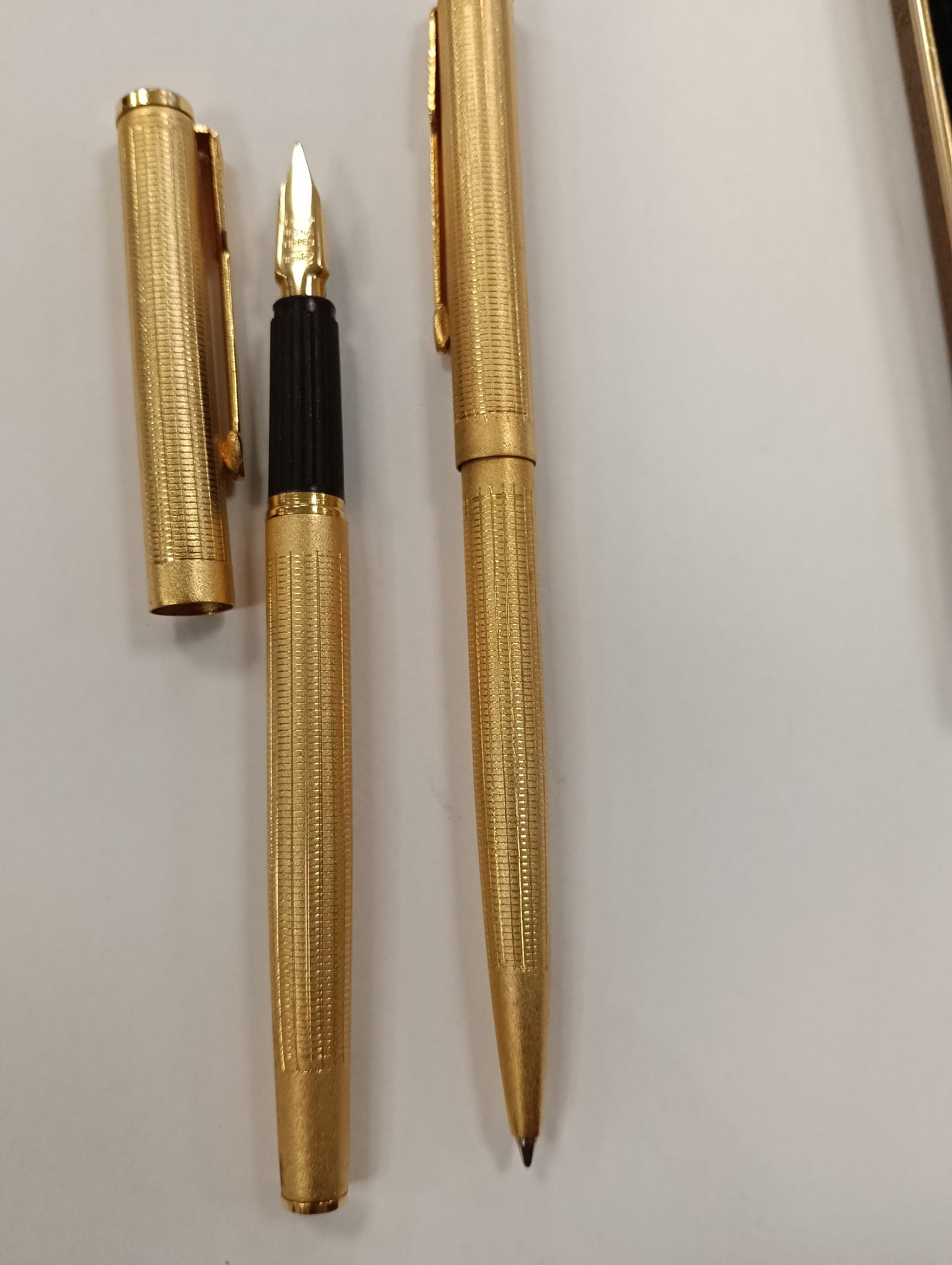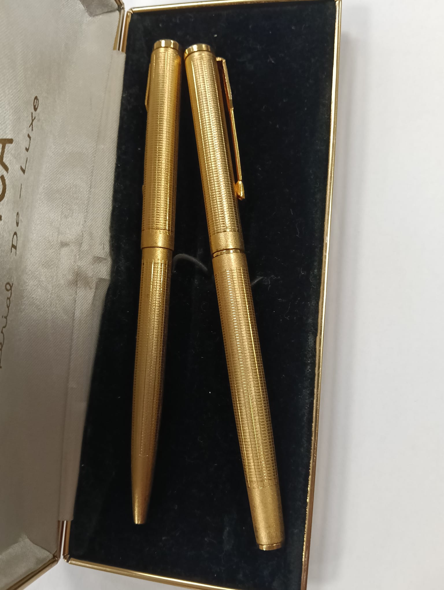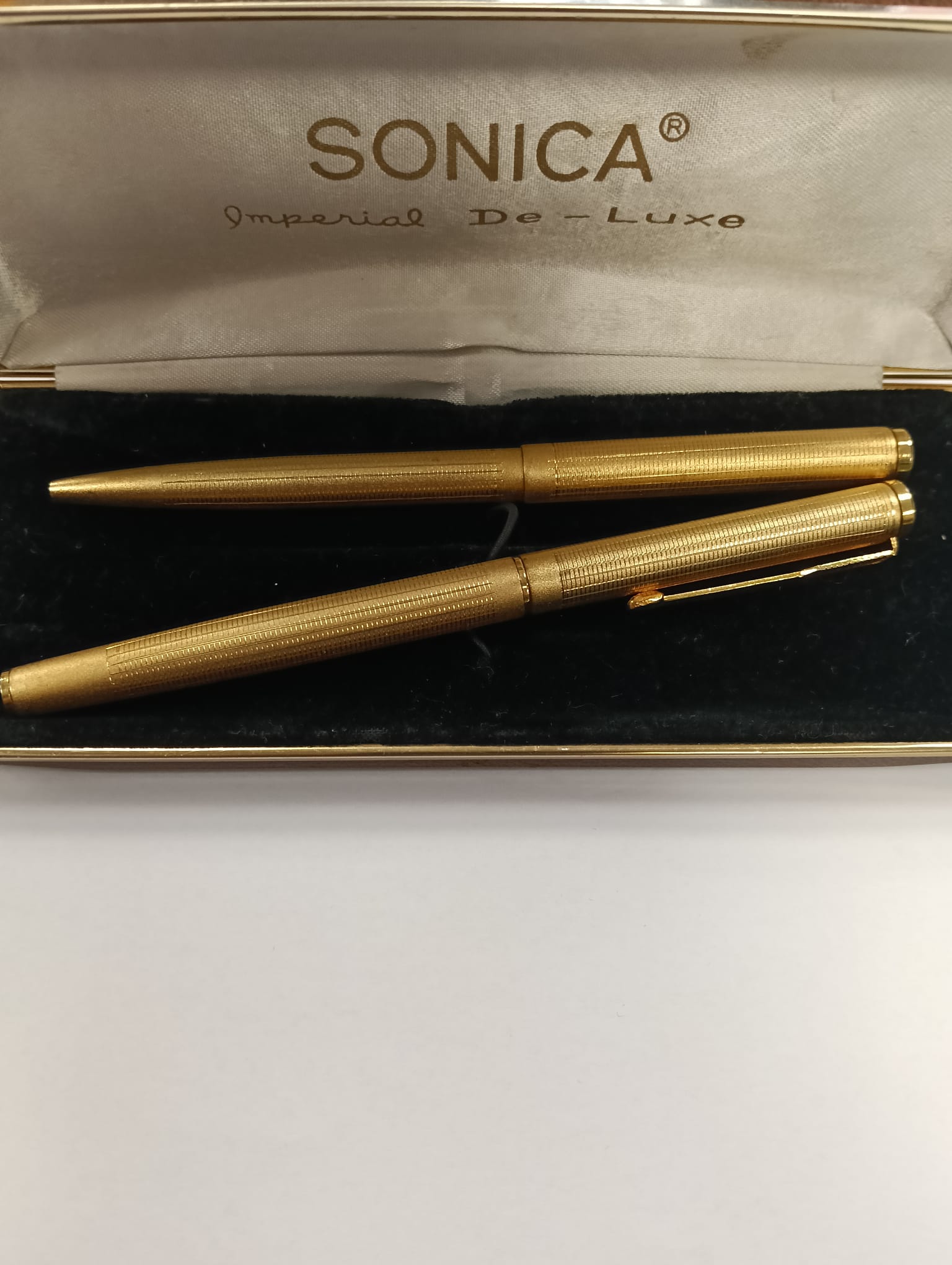 Elegante juego de bolígrafo y pluma de la marca Sonica, modelo Imperial De Luxe. Acabado dorado con detalles texturizados. Presentado en su estuche original.
