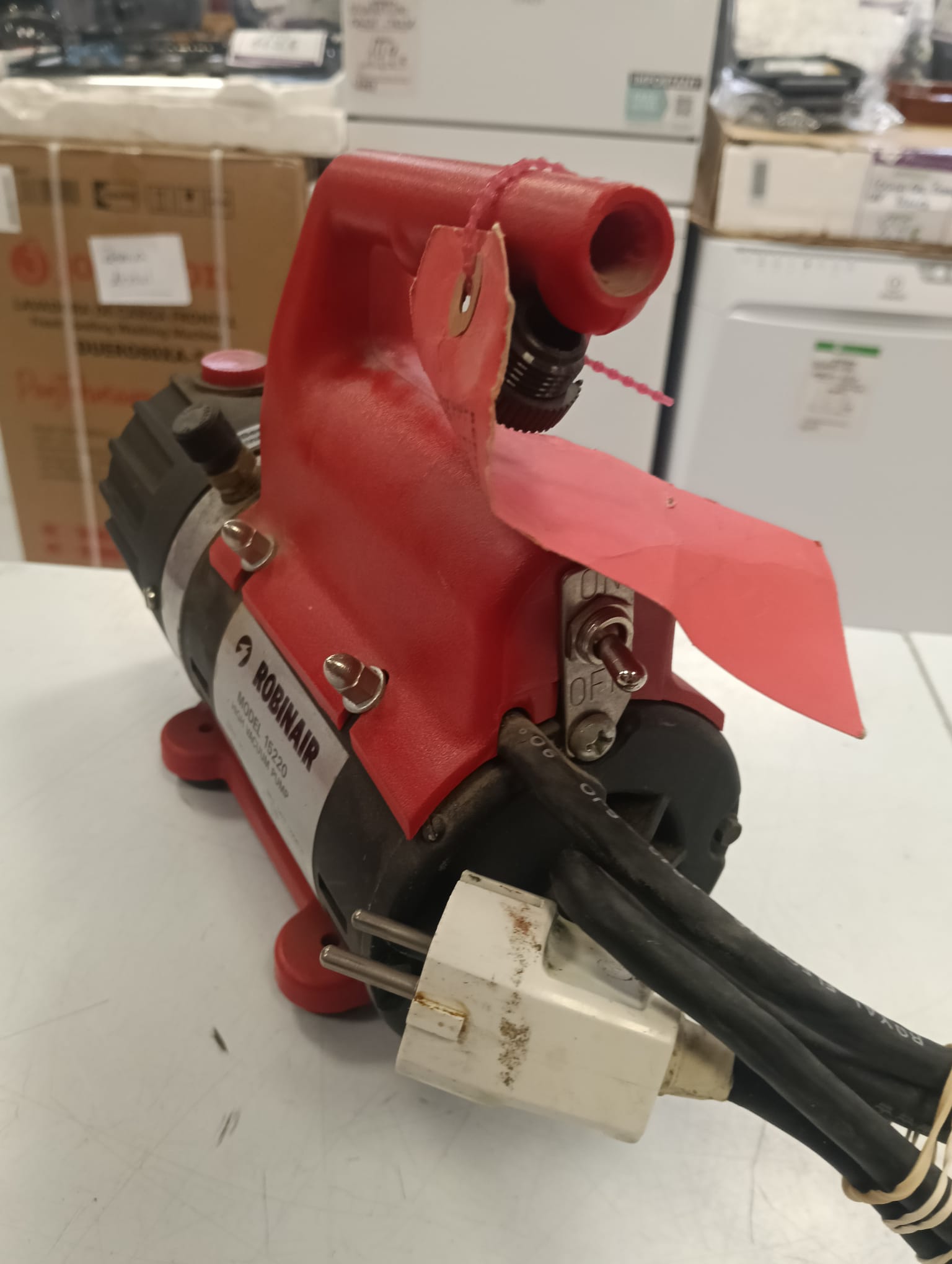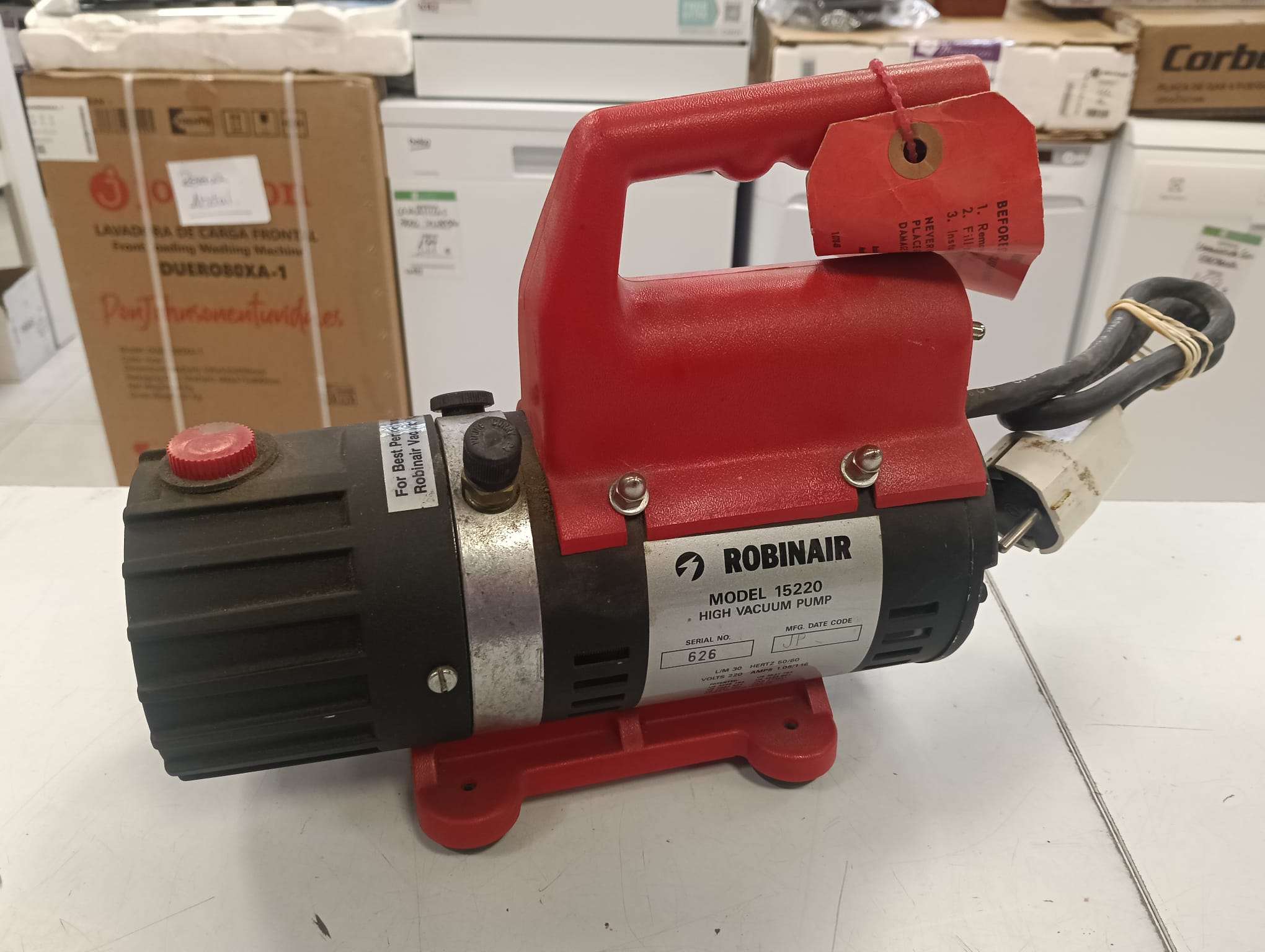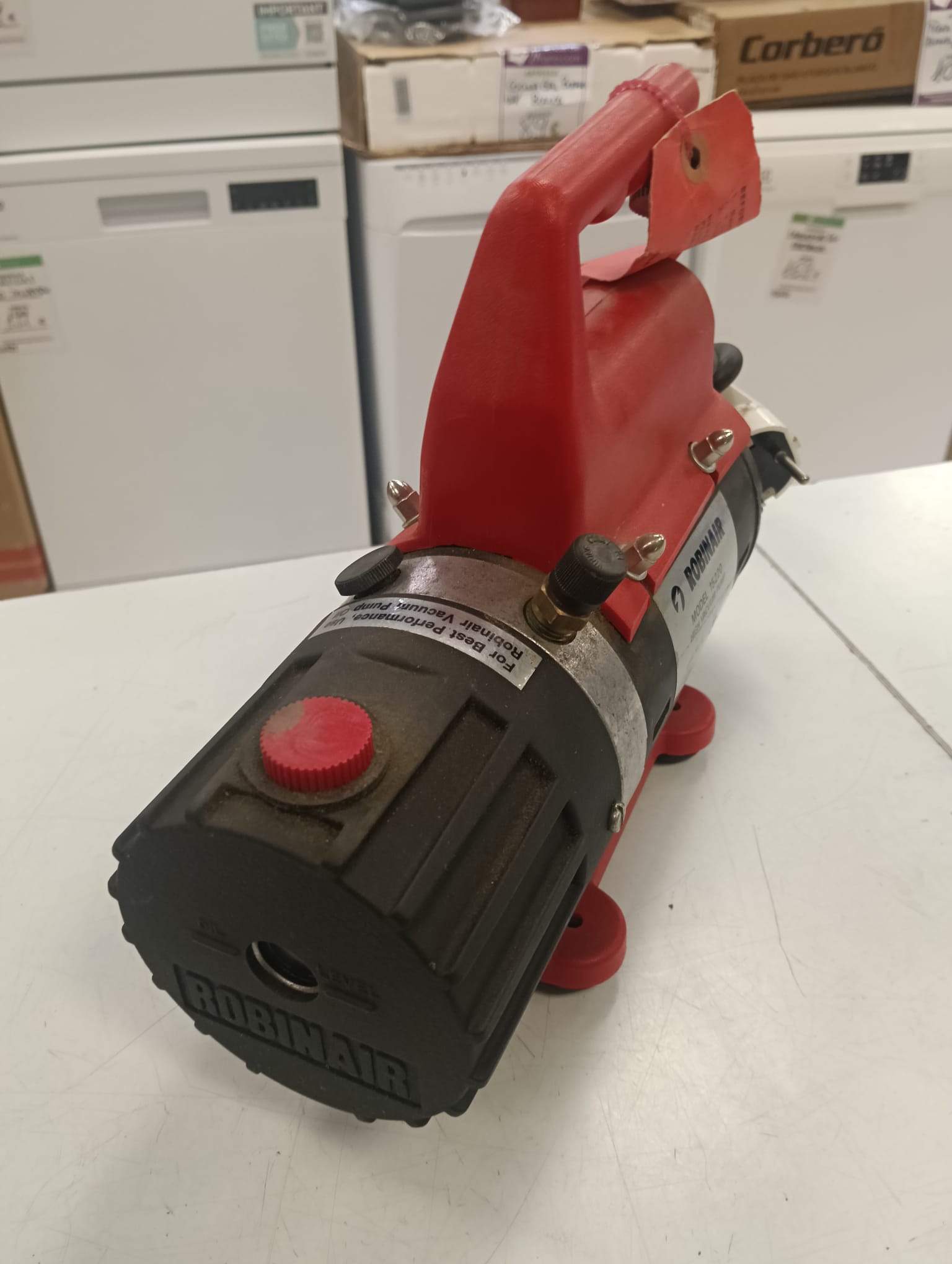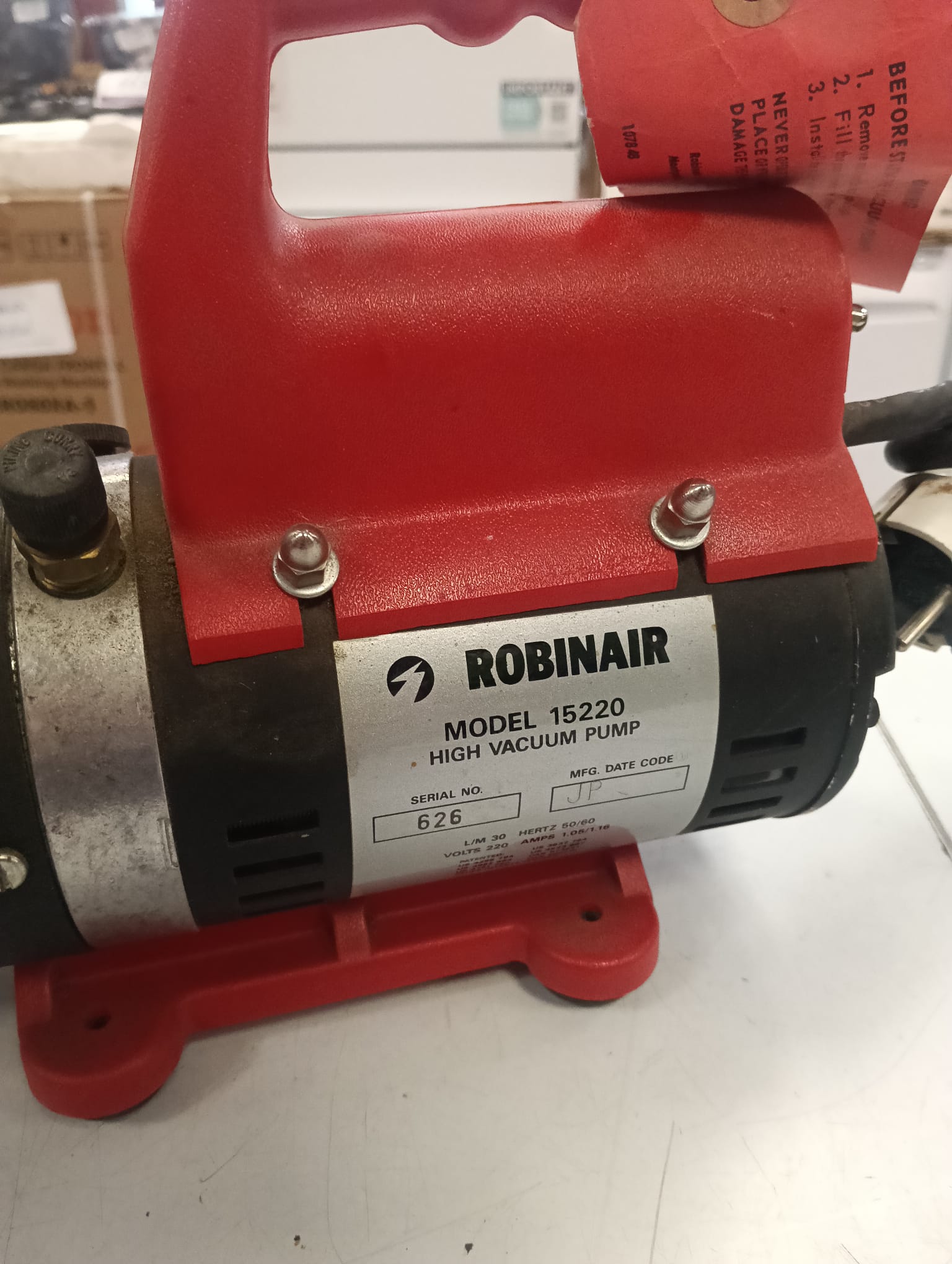 Bomba de vacío Robinair modelo 15220. Color rojo y negro. Asa de transporte. Etiqueta de advertencia. Conexión para manguera. Destinado para aire acondicionado y refrigeración. Diseño Robusto: Cuentan con un cuerpo de aluminio fundido a presión para mayor ligereza y durabilidad.