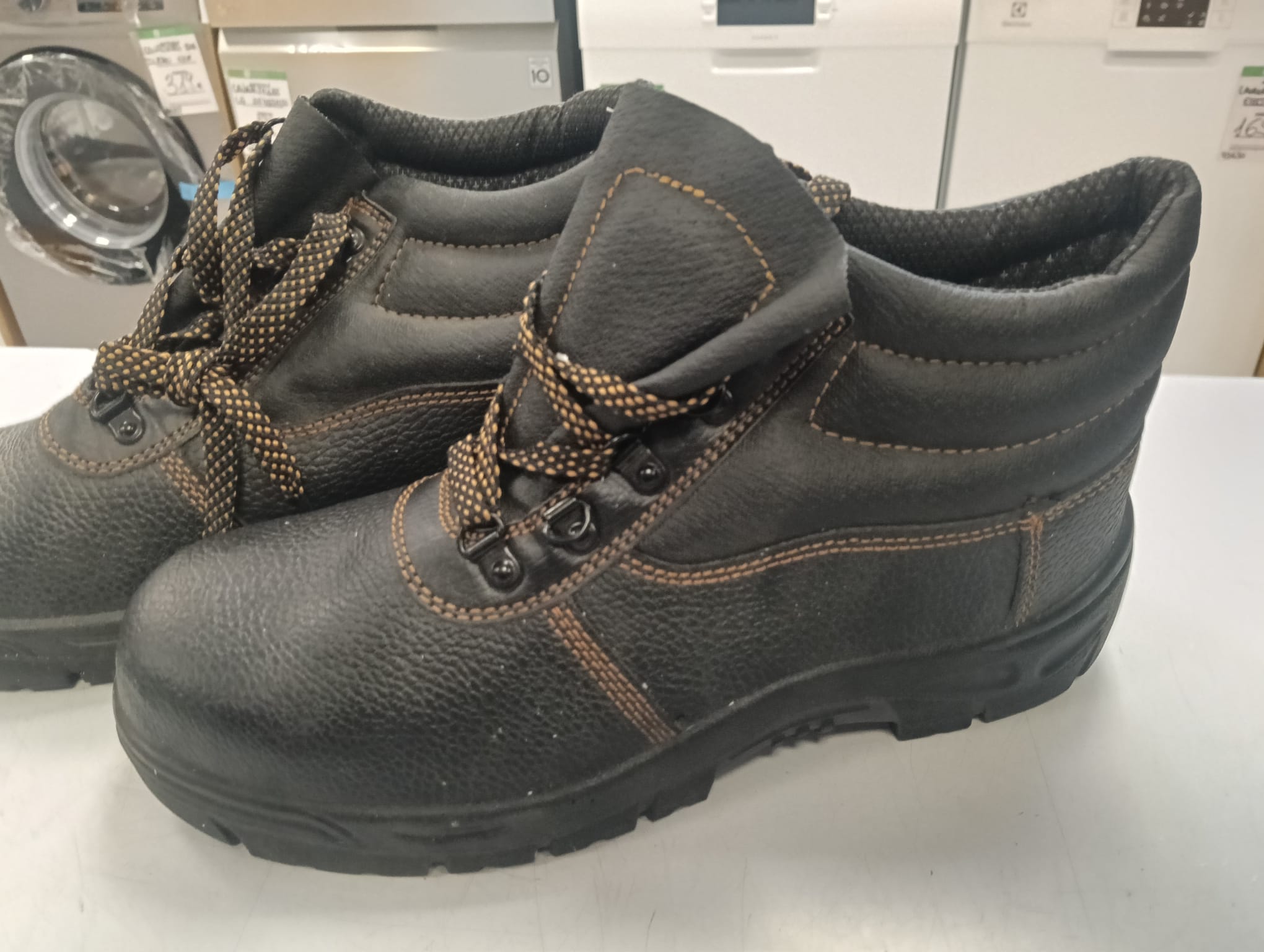 Botas de seguridad de cuero negro. Cierre con cordones. Suela de goma resistente. Diseño robusto. Talla 42.