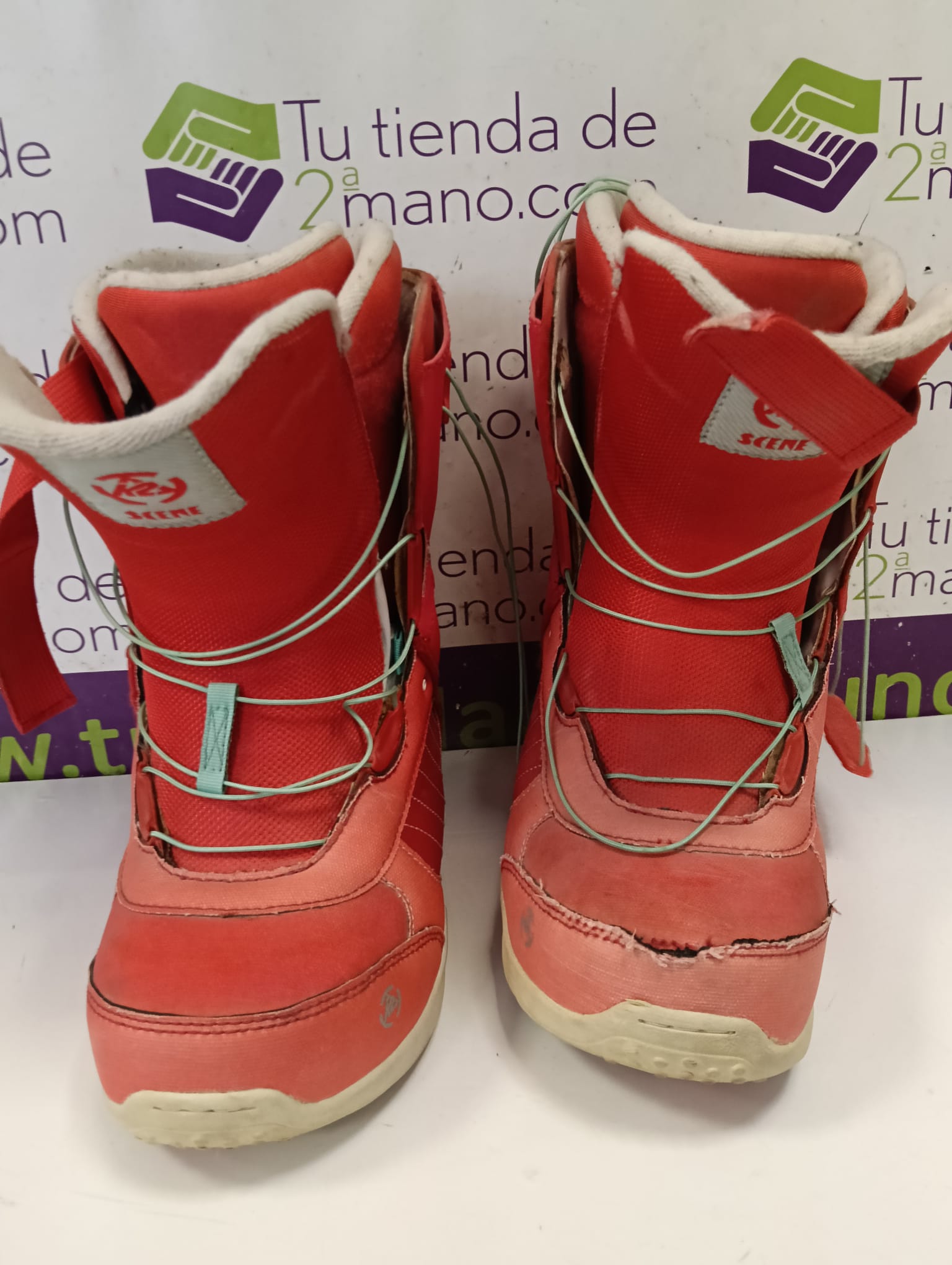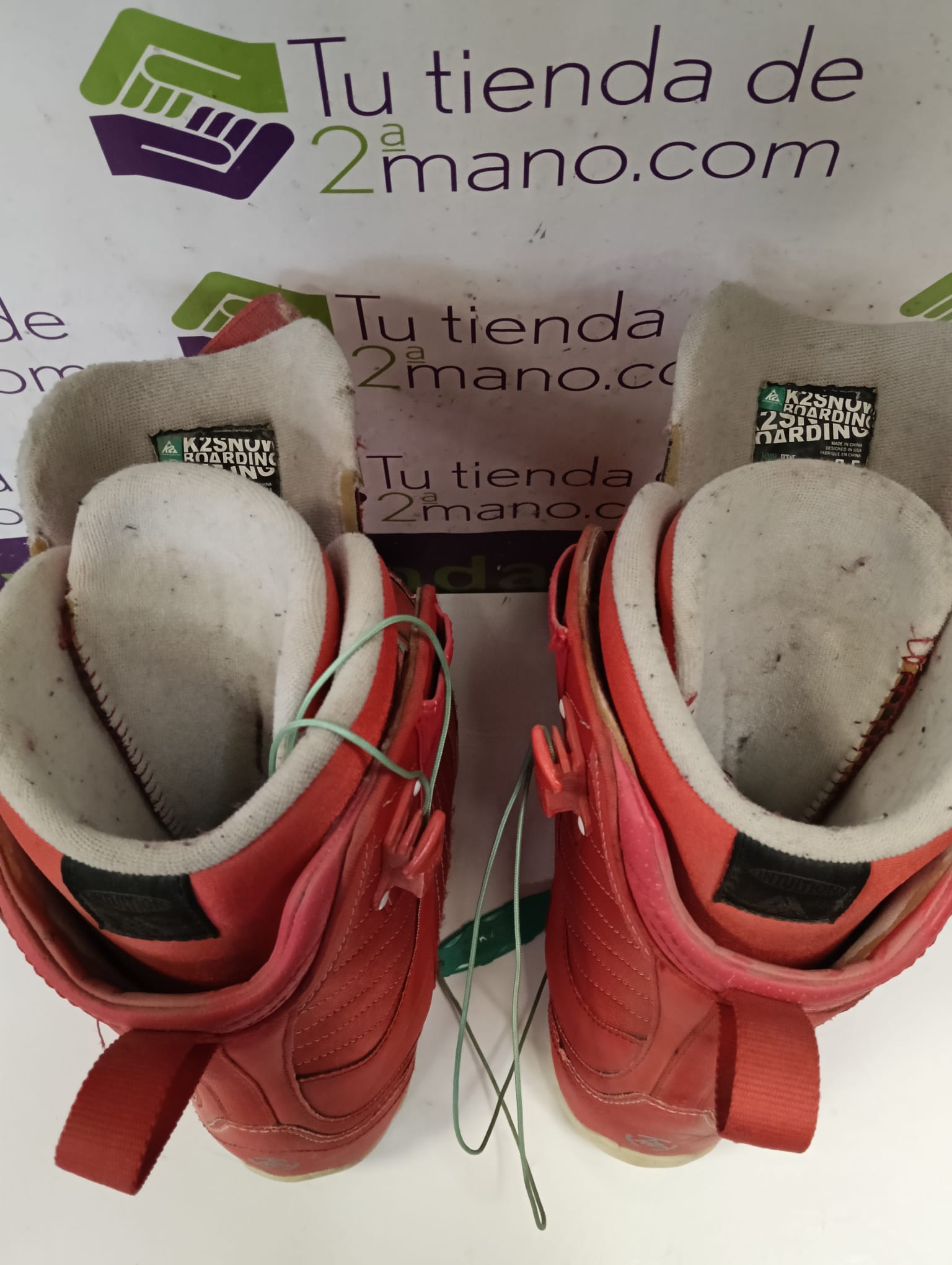 Botas de snowboard K2 para niña, en tonos rojos y rosas. Perfectas para iniciarse en el deporte. Cierre rápido. Interior acolchado para mayor comodidad. Suela adherente. Talla 39.5.
