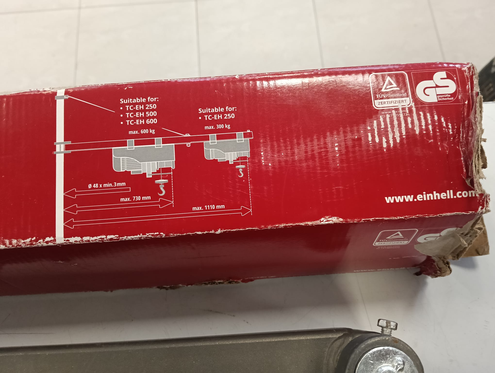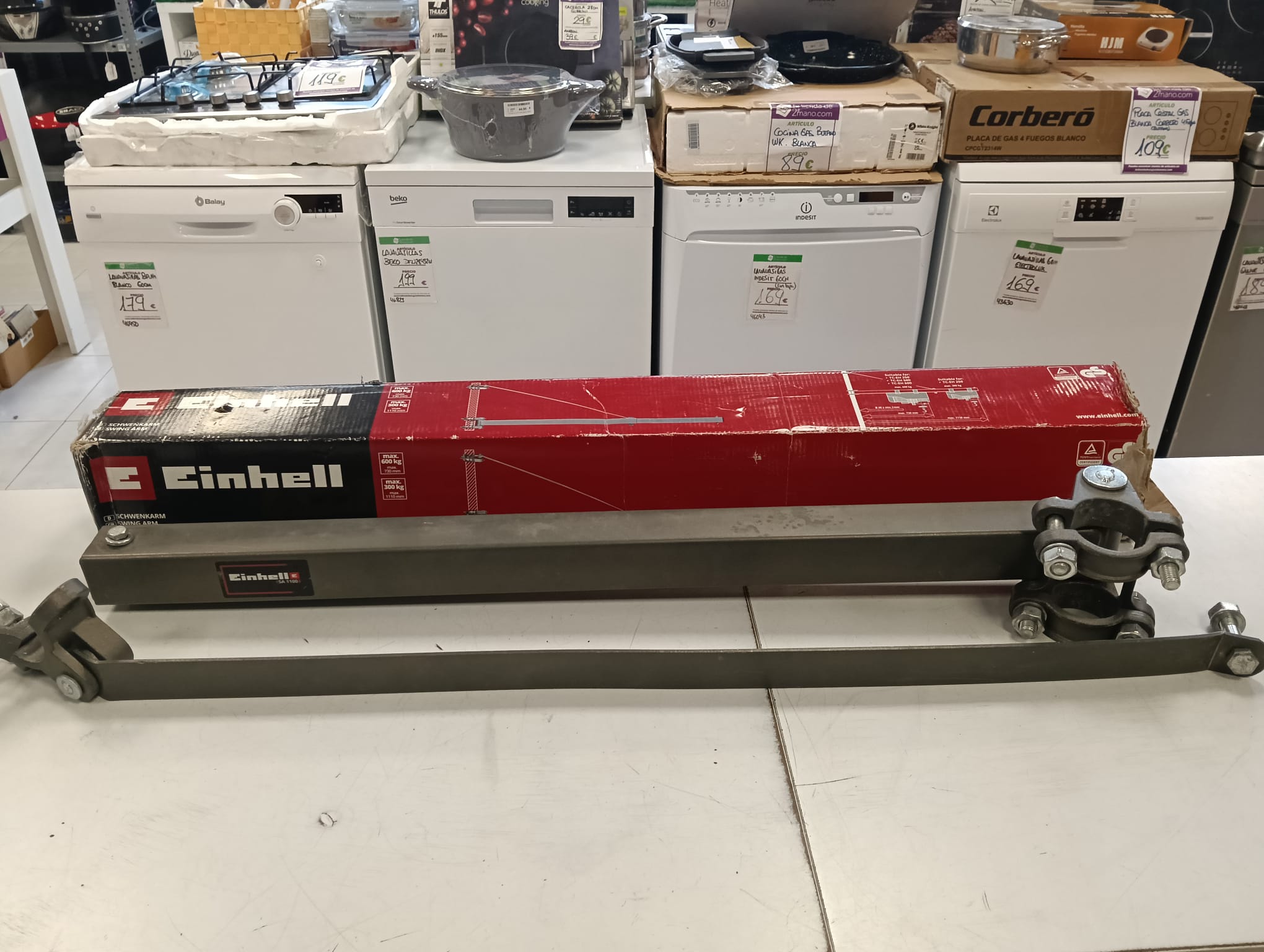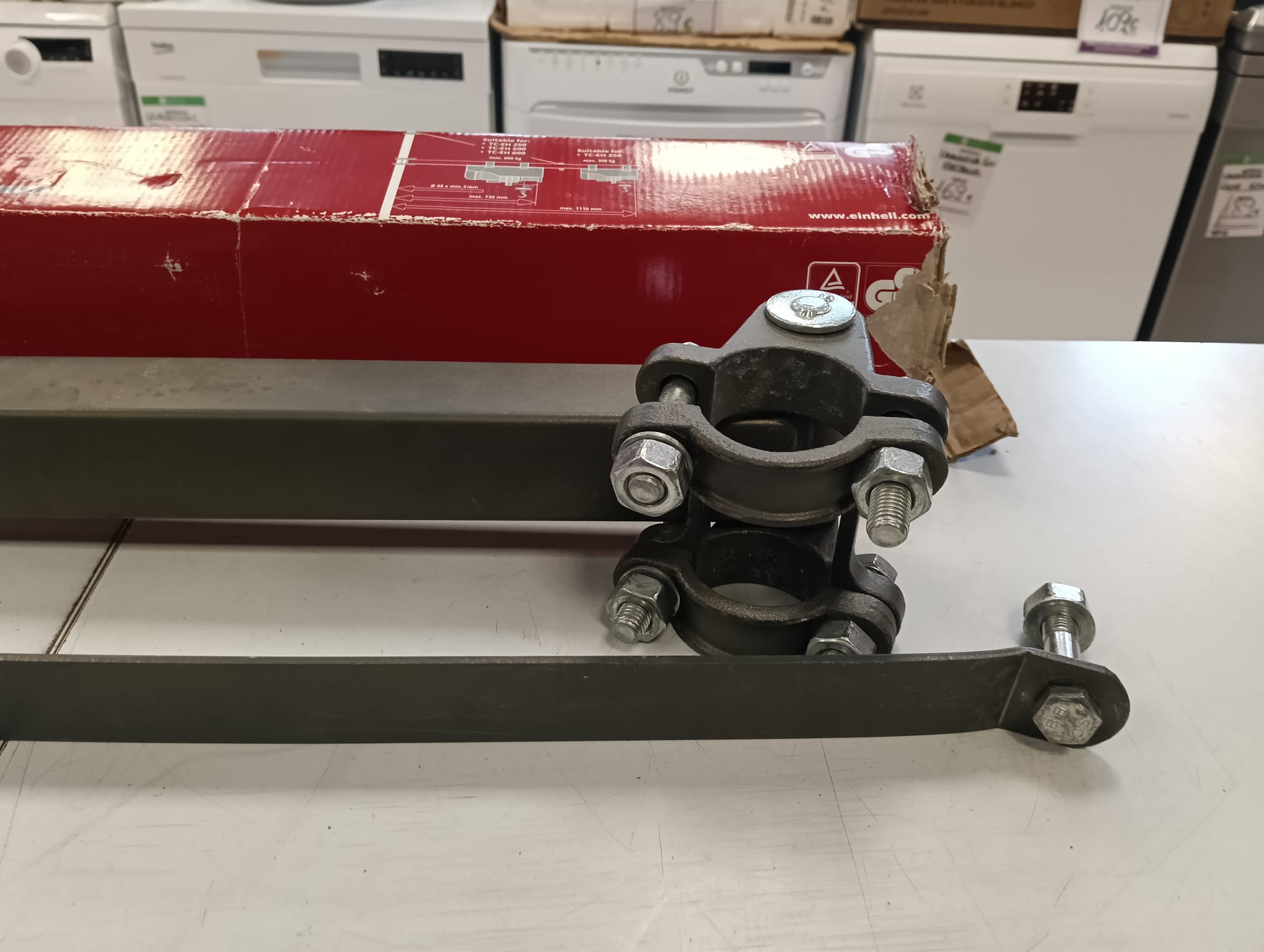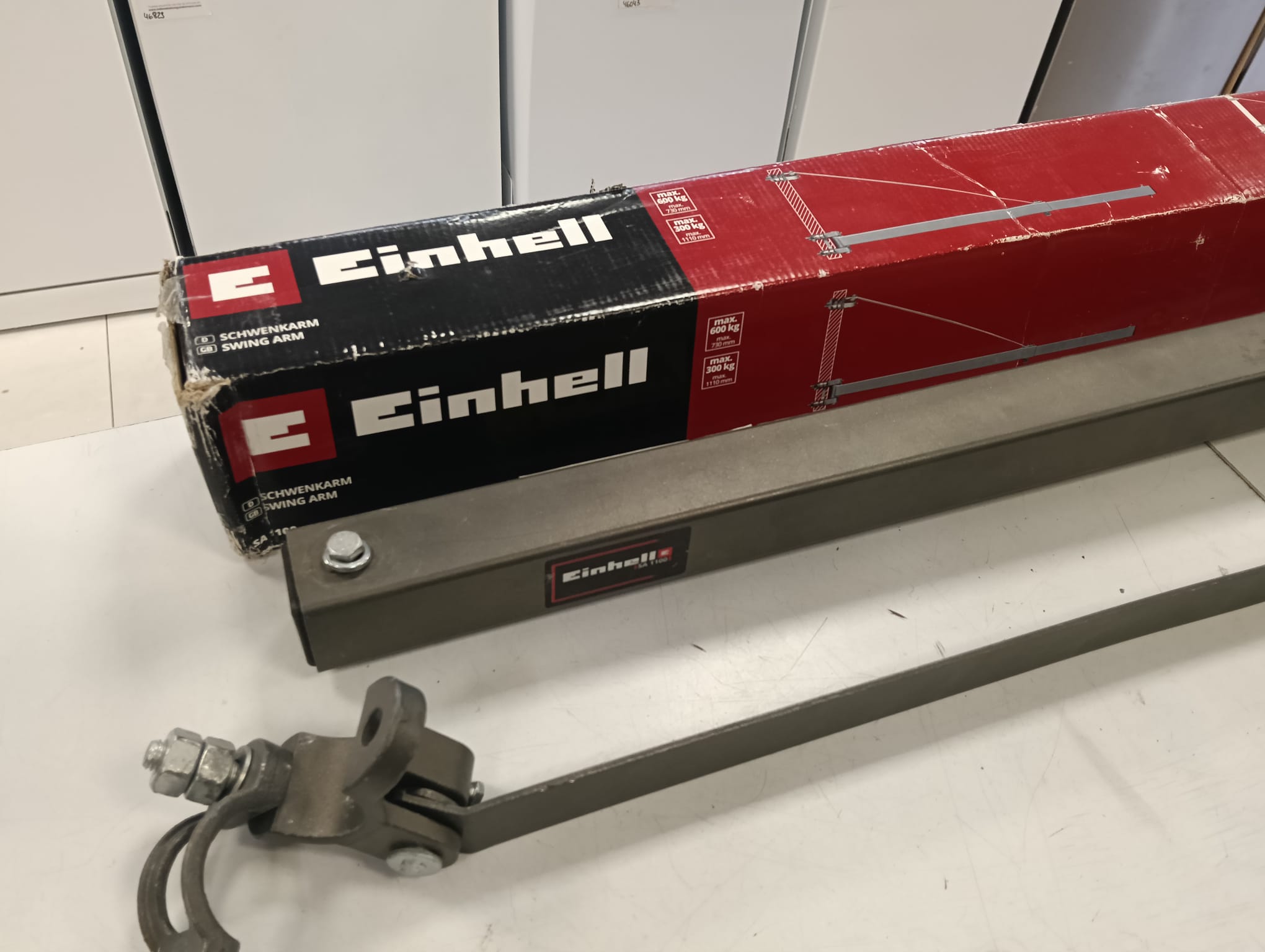 Brazo para elevador, modelo EINHELL SA1100. Alcance variable de 750 mm a 1100 mm. Carga máxima 600 kg (para un alcance de 750 mm) y 300 kg (para 1100 mm). Giro de 180º.