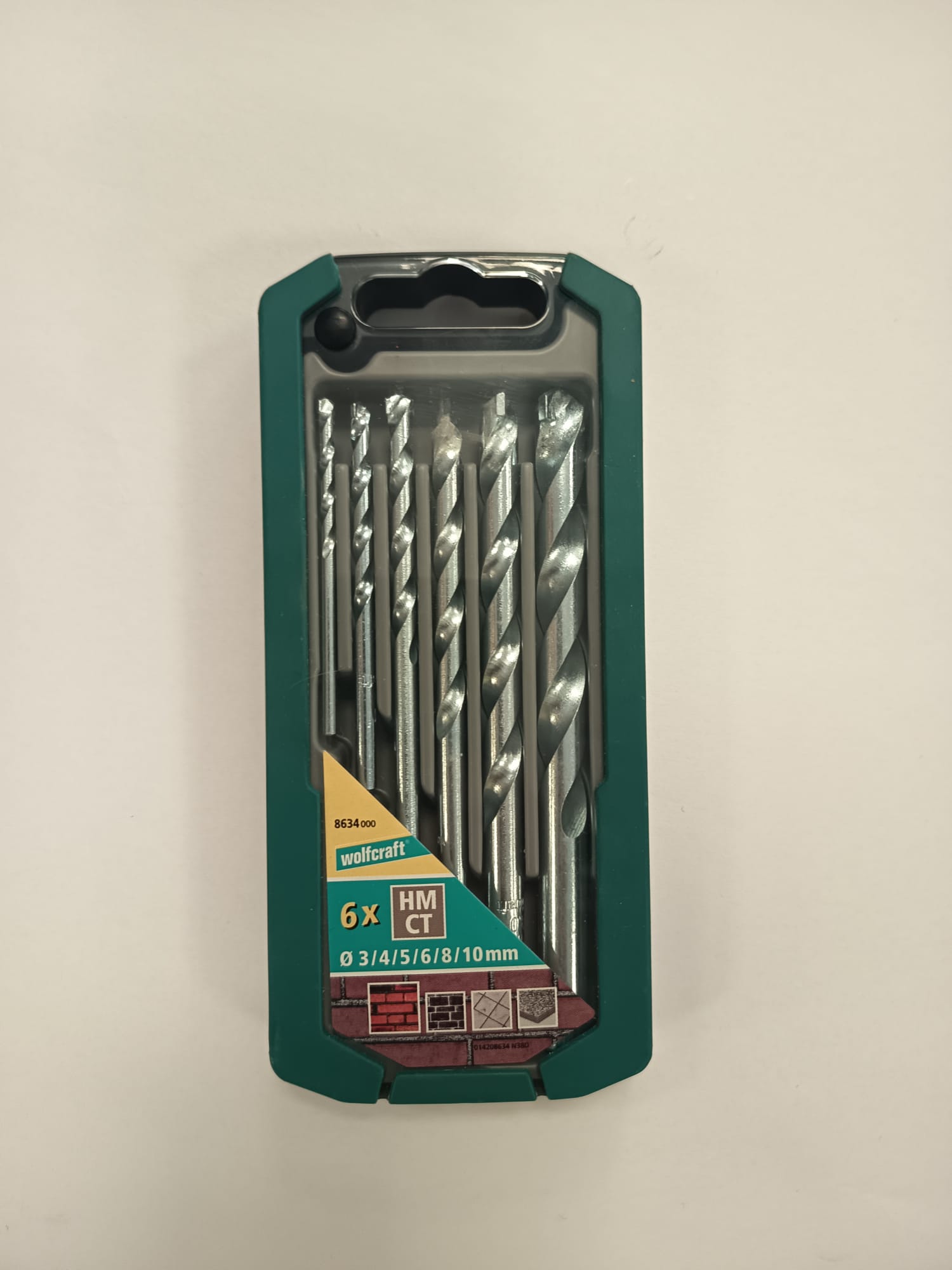 Set de 6 brocas para pared de la marca Wolfcraft. Incluye brocas de 3, 4, 5, 6, 8 y 10 mm. Material: HM CT (Carburo de Tungsteno). Referencia: 8634000.