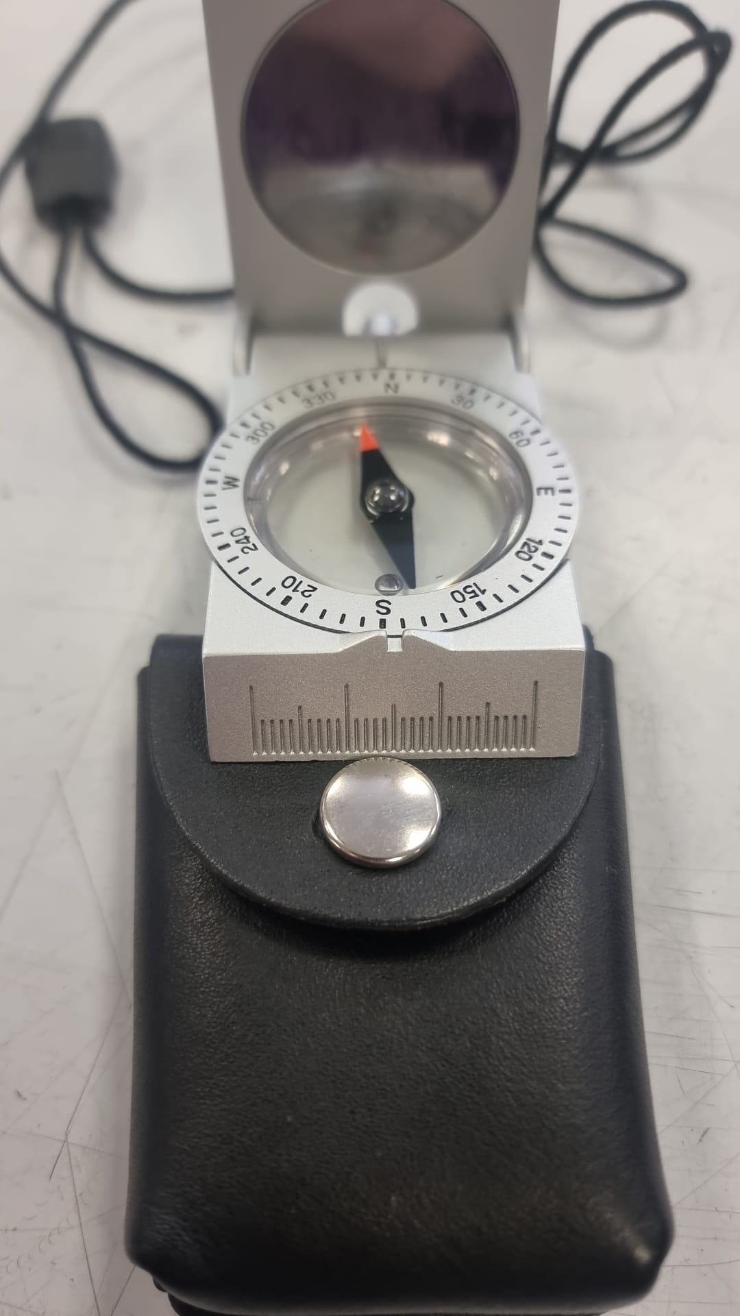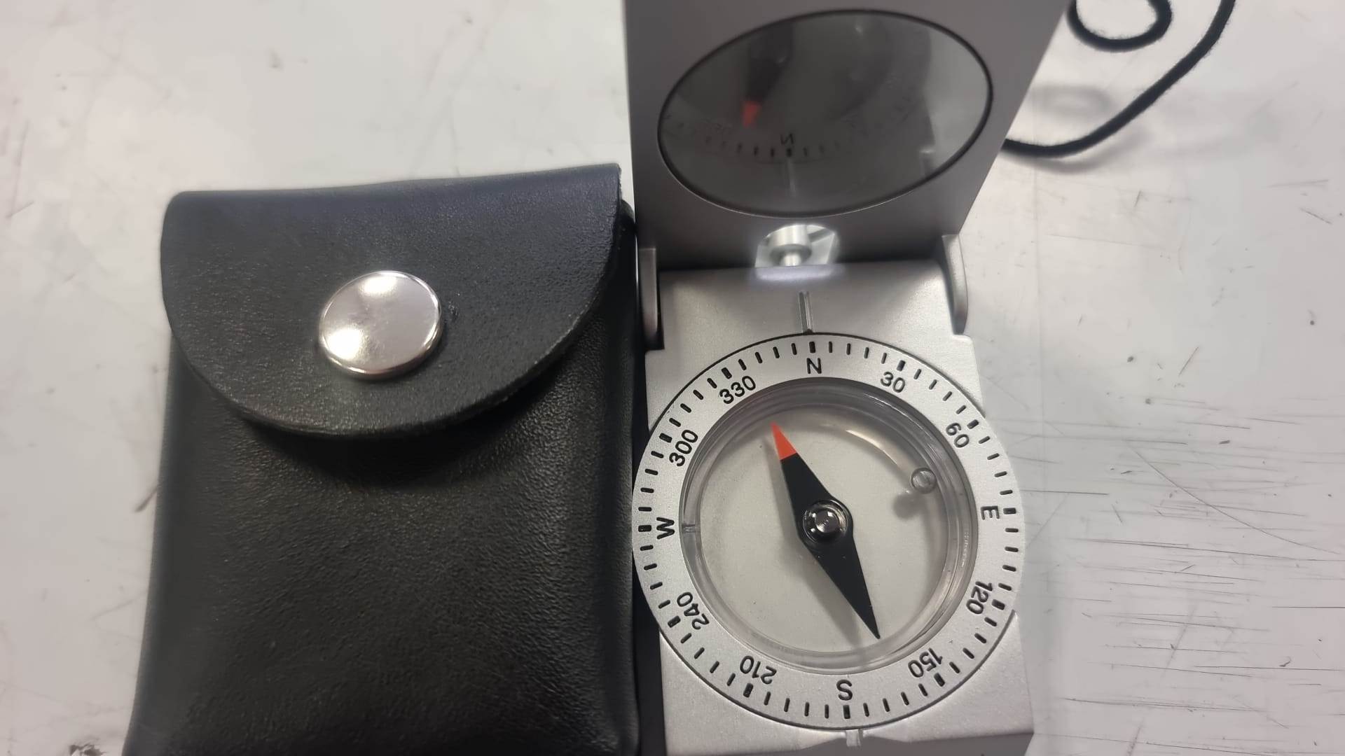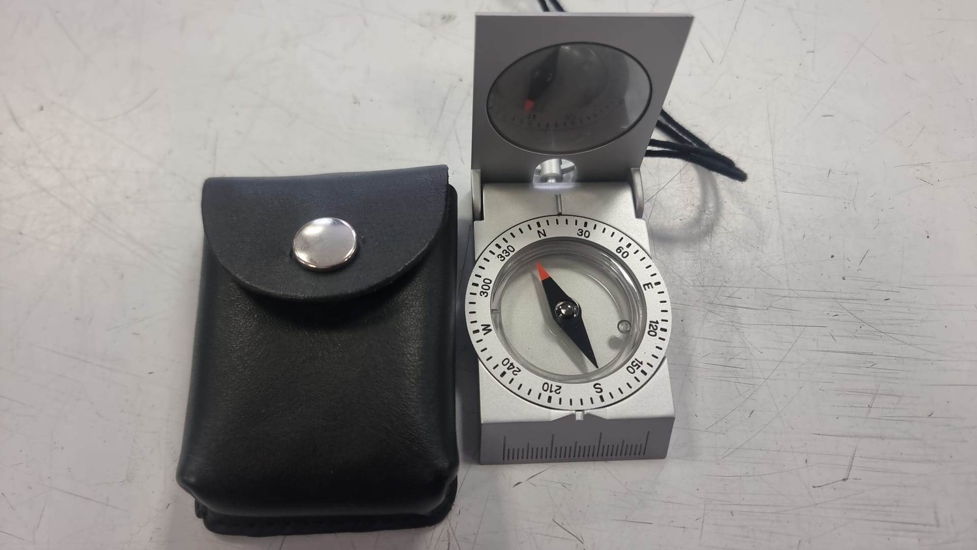 Brújula de color gris, ideal para actividades al aire libre. Incluye una funda protectora.Brújula con escala en grados. Funda de cuero sintético negro.Cierre a presión en la funda.