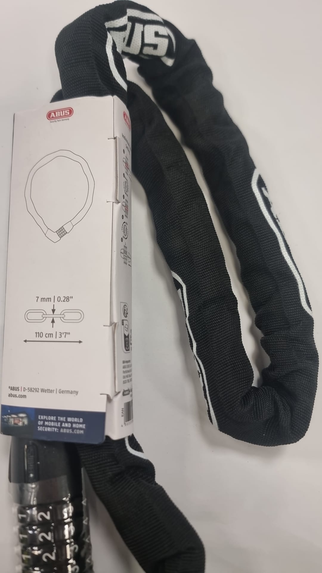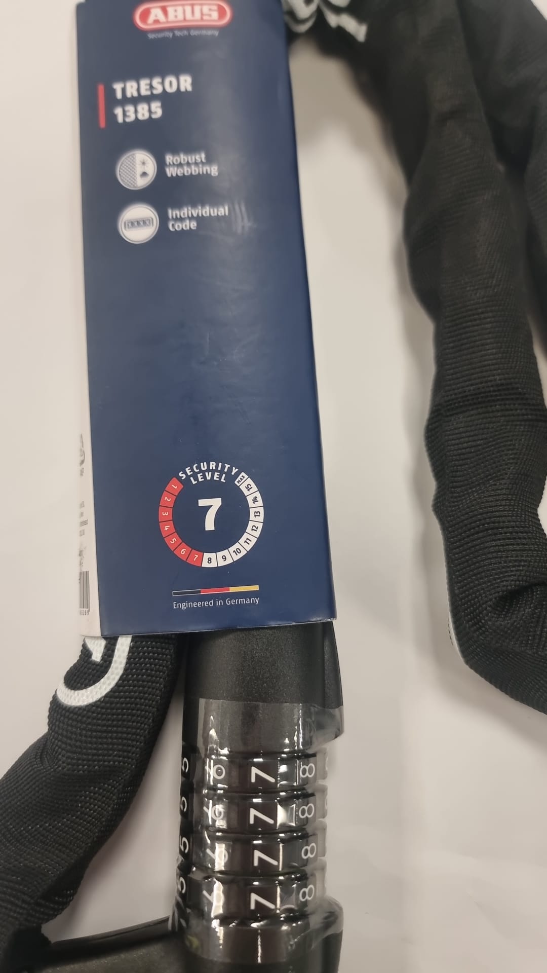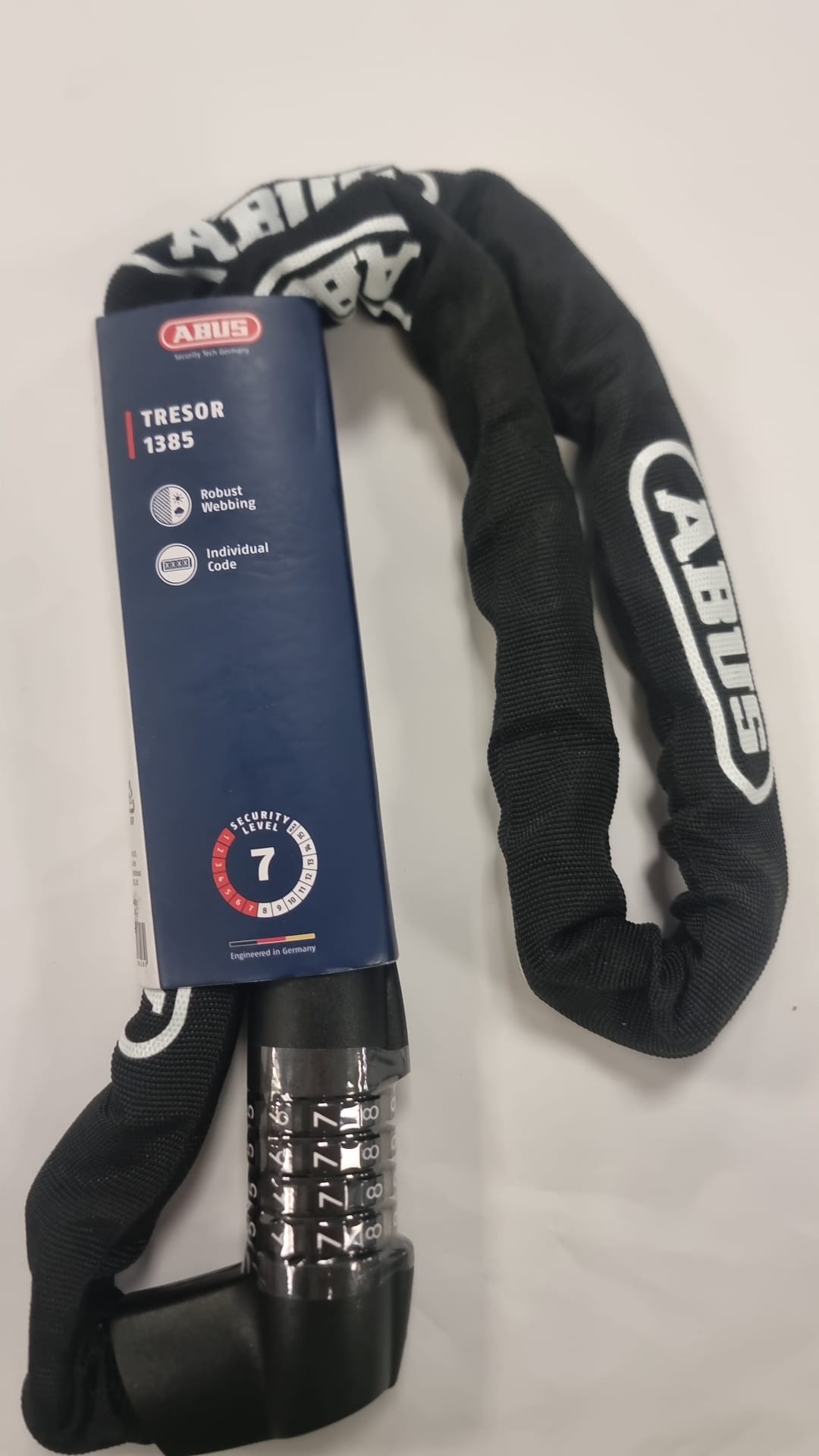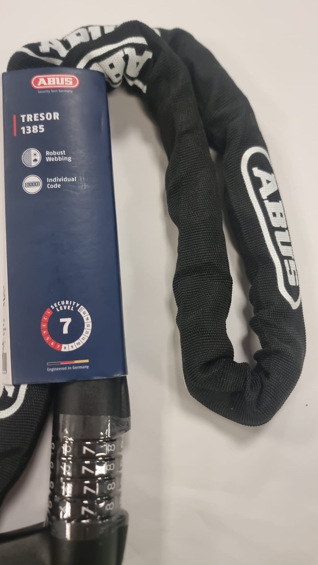 Cadena de seguridad ABUS TRESOR 1385 con combinación.Nivel de seguridad 7. Combinación de 4 dígitos. Funda textil para proteger la bicicleta.