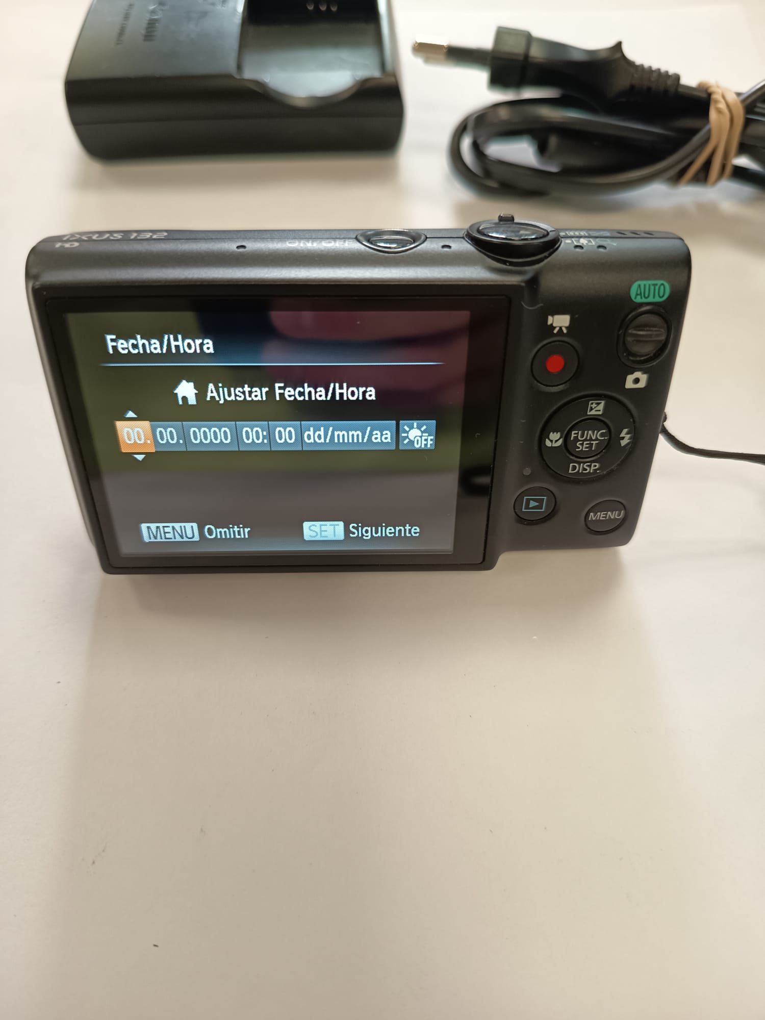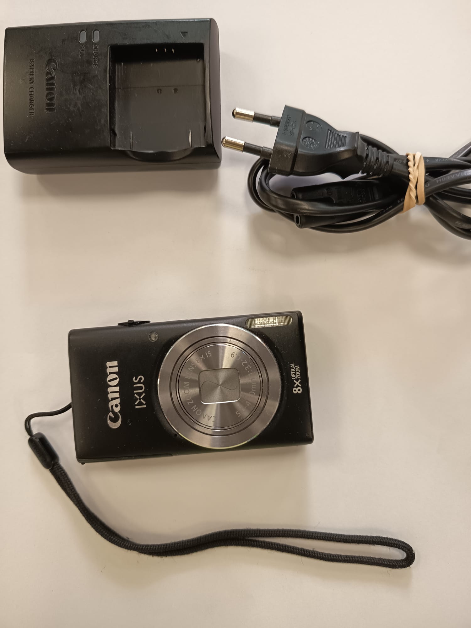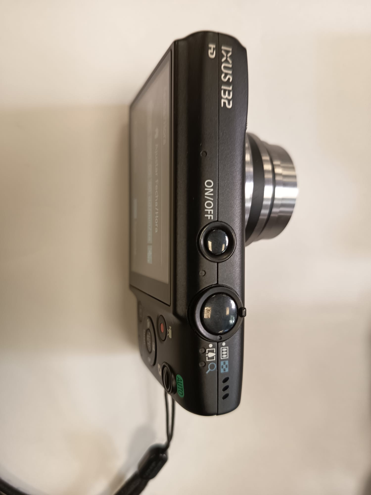Cámara digital Canon IXUS 132 en color negro. Incluye cargador de batería y cable de alimentación.