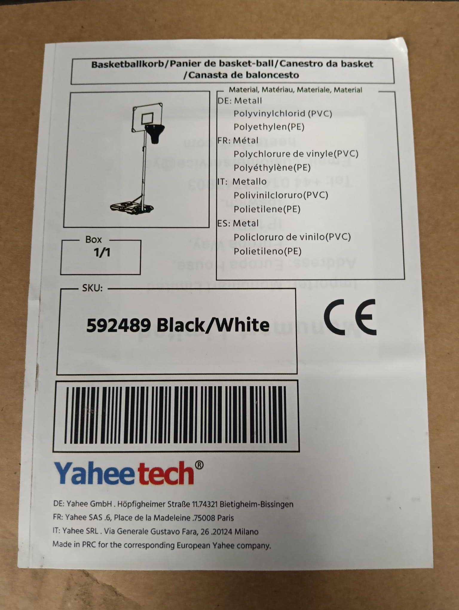 Canasta de baloncesto portátil marca Yaheetech, modelo 592489.Material: Metal. Color: Negro/Blanco. Incluye base para mayor estabilidad.