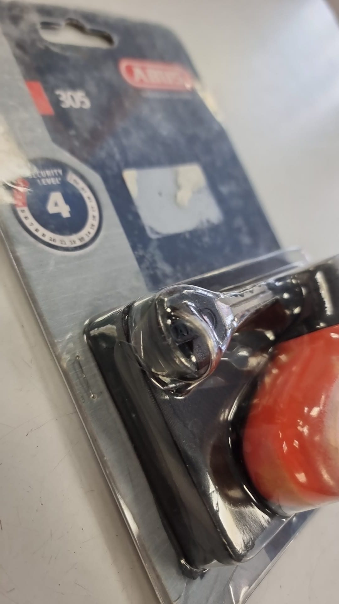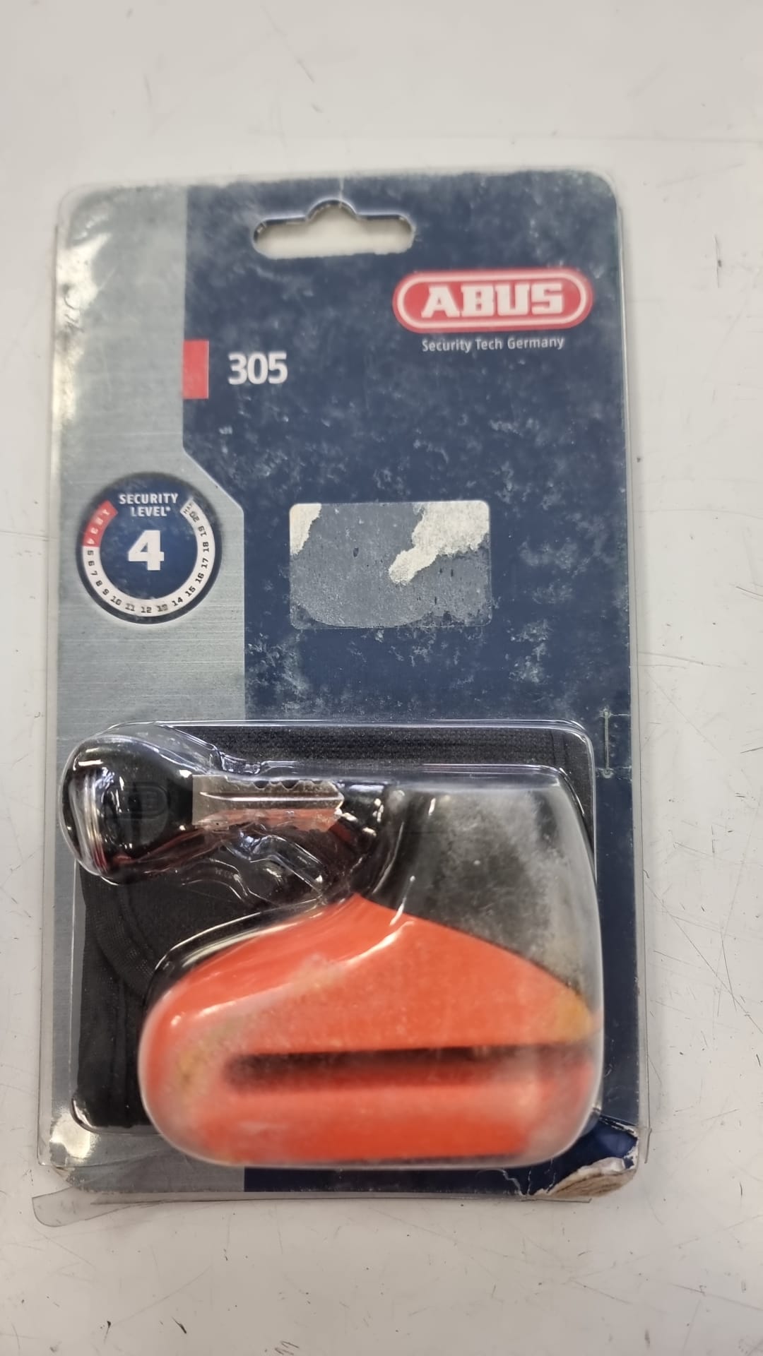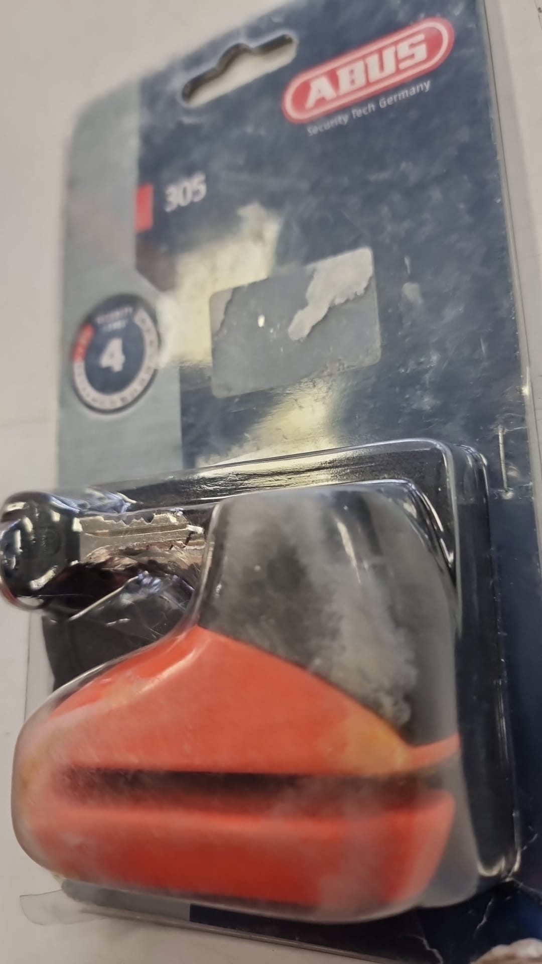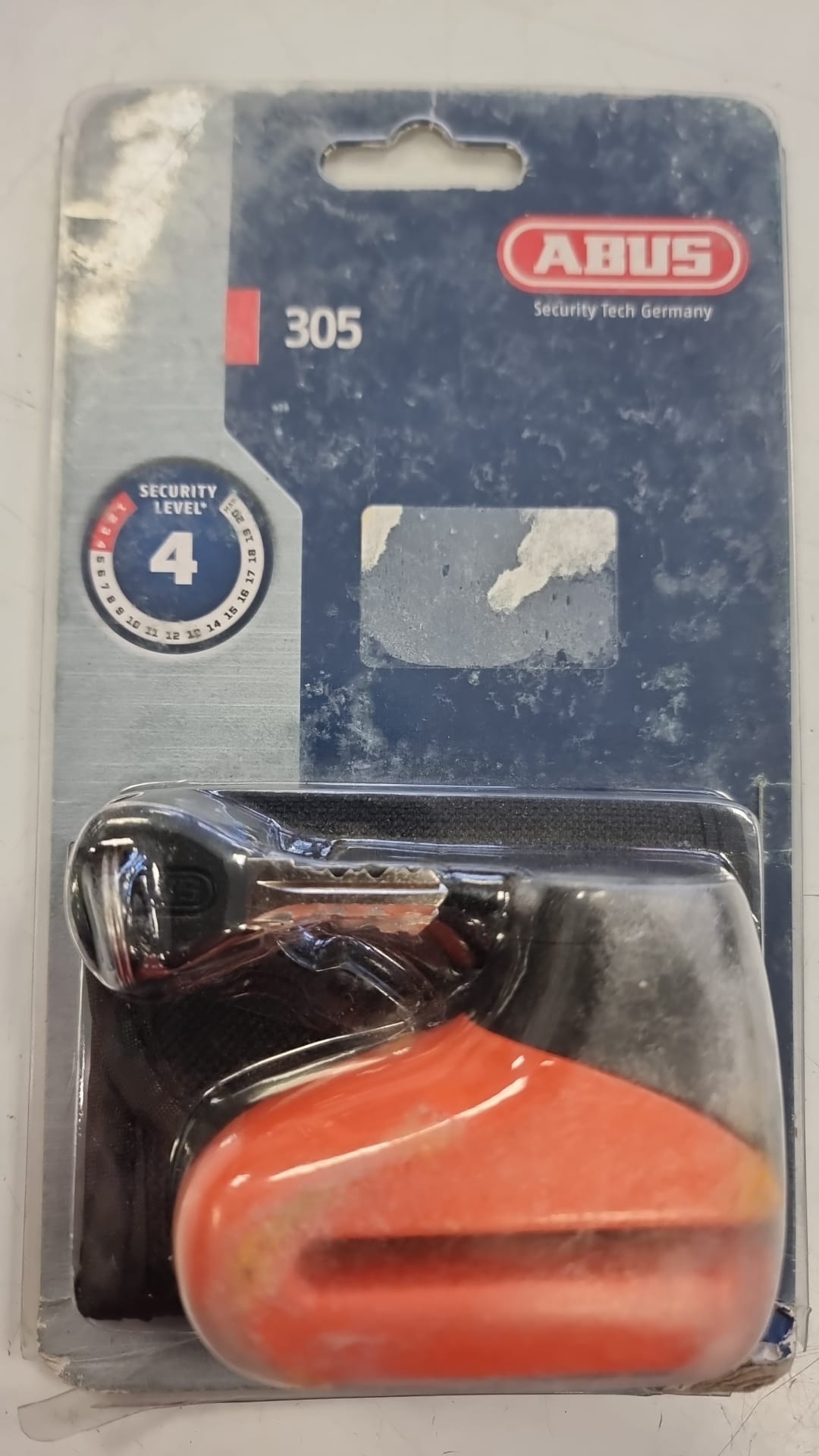 Candado de disco para moto de la marca ABUS, modelo 305. Nivel de seguridad 4. Color naranja y negro. Incluye llaves.