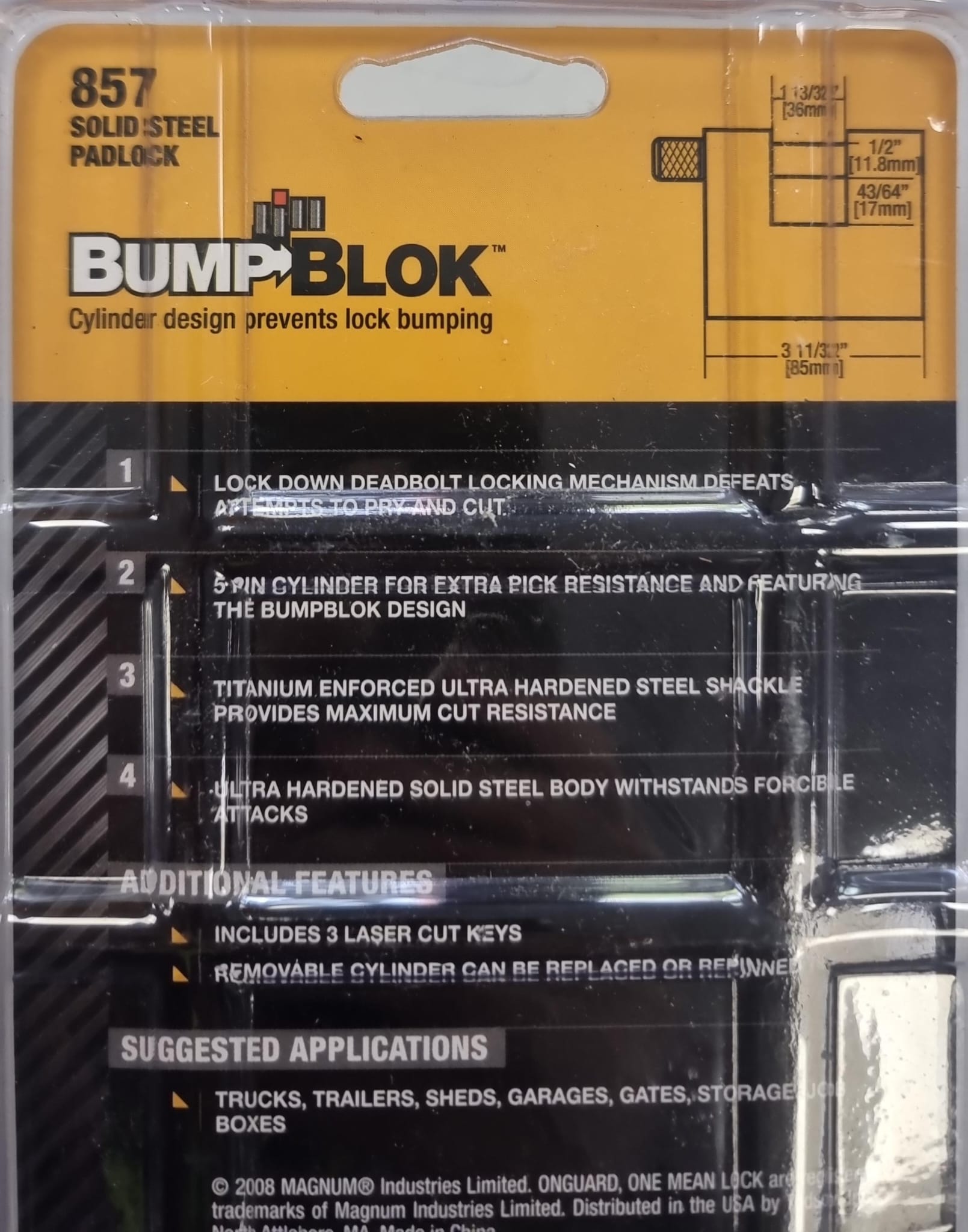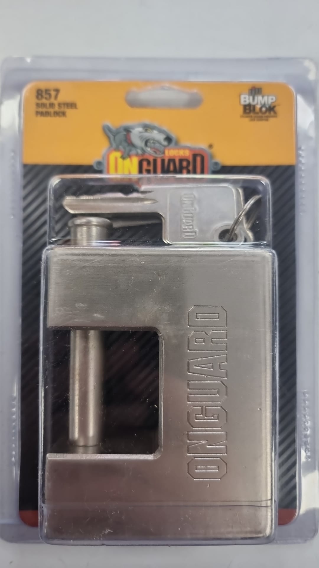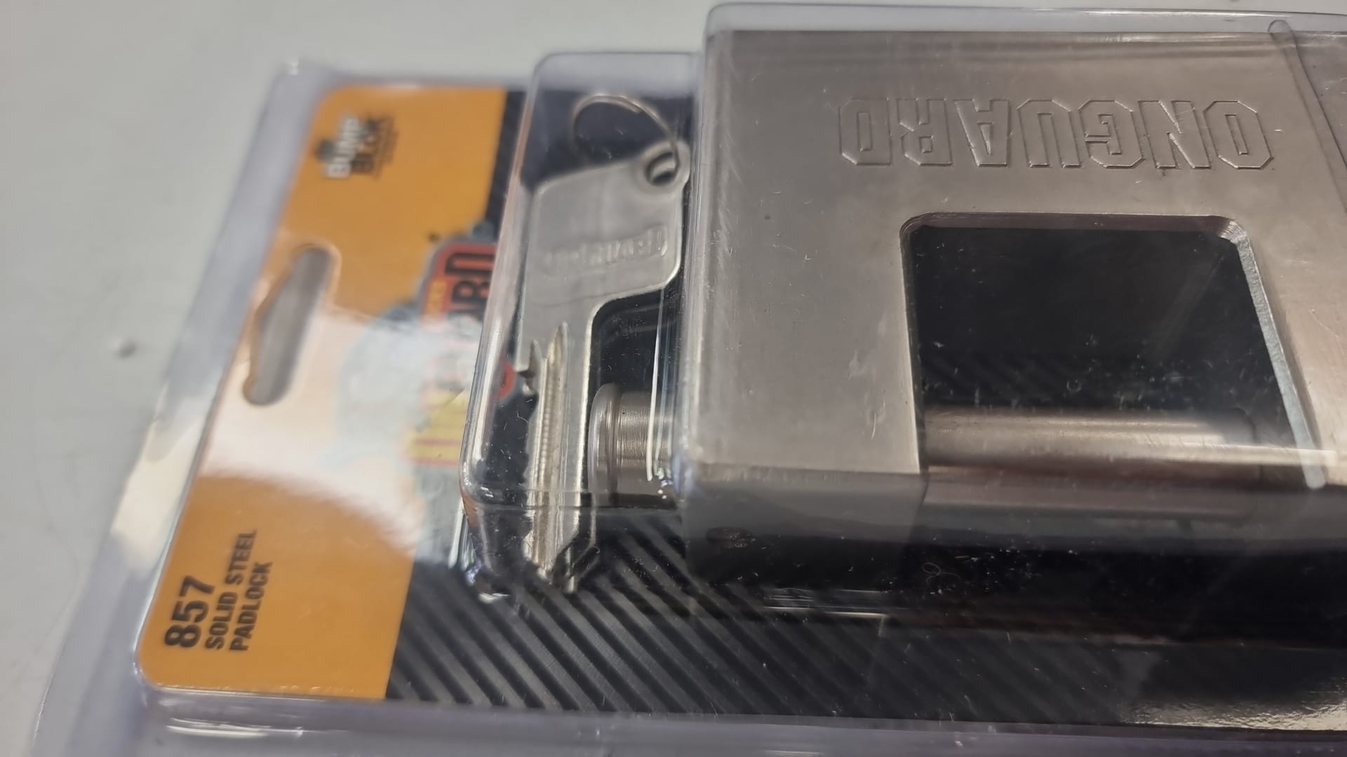 Candado de acero sólido ONGUARD modelo 857. Cuerpo de acero sólido. Incluye dos llaves. Diseño resistente. Alta seguridad para puertas de furgoneta. Acero reforzado.