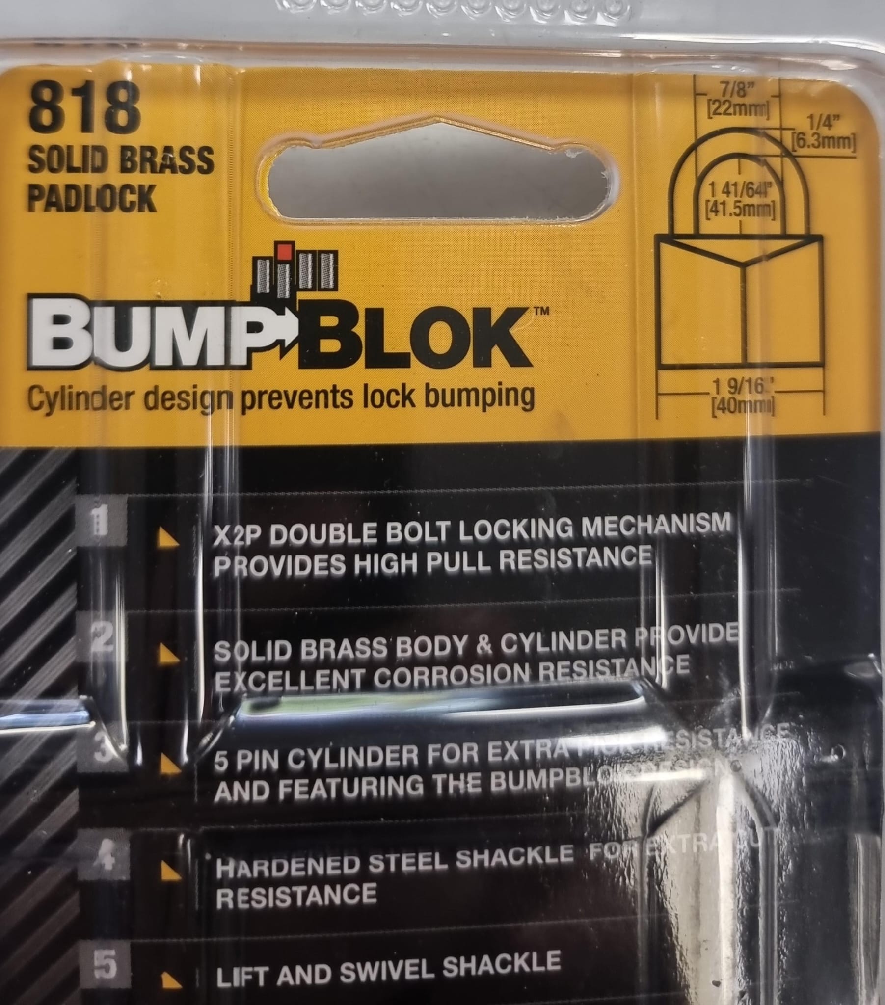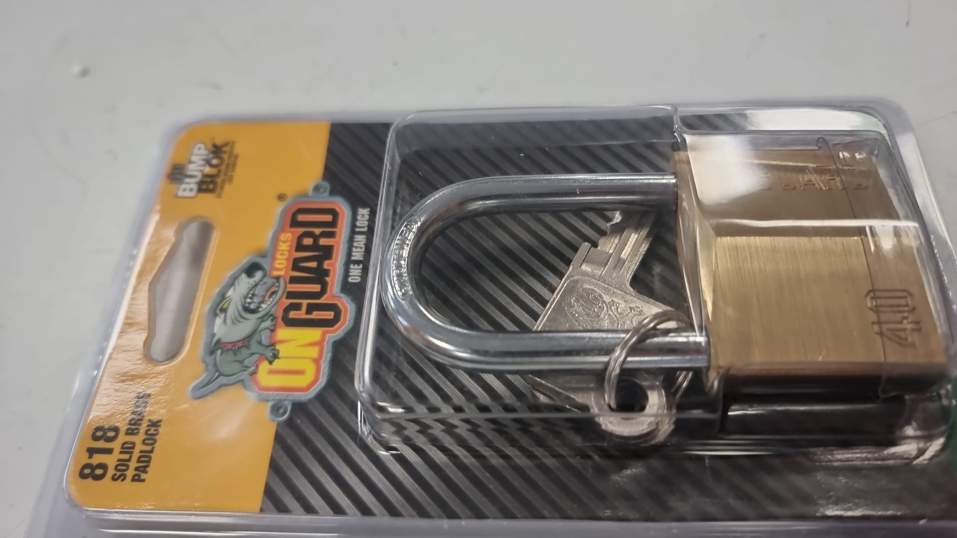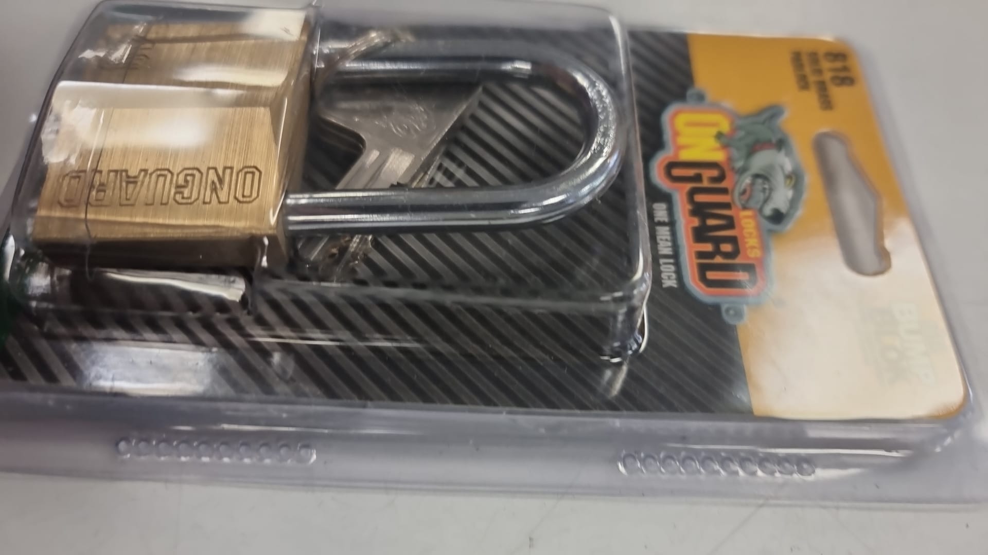 Candado de latón macizo de 40mm con arco largo de la marca Onguard, modelo 818. Fabricado en latón macizo. Arco largo. Incluye dos llaves.