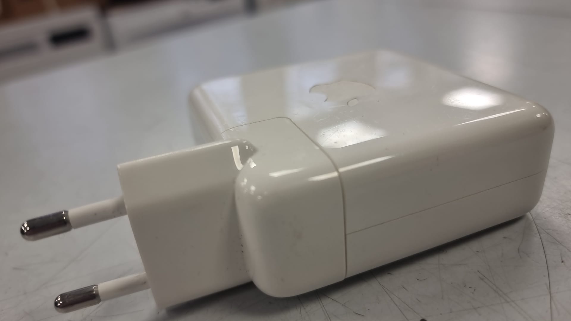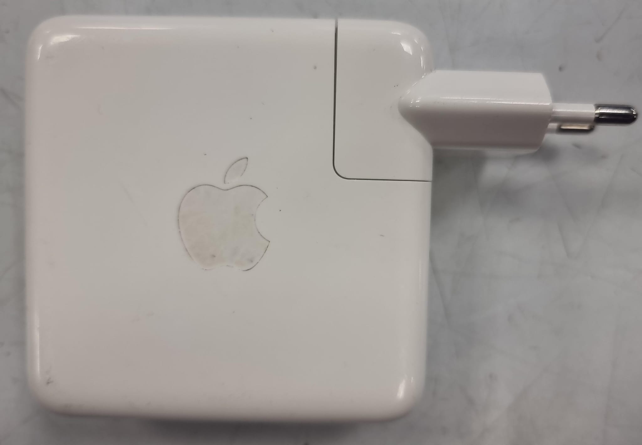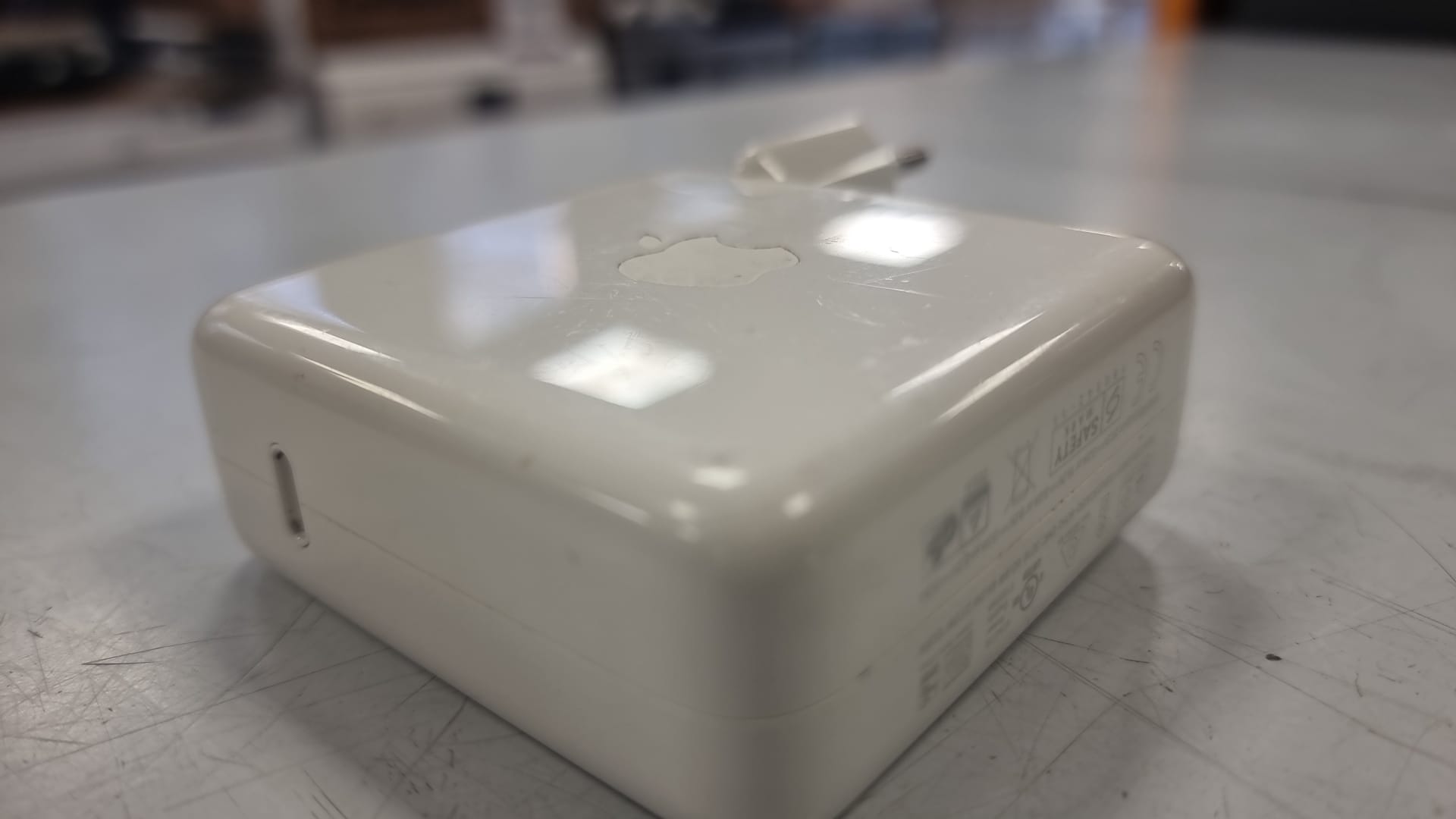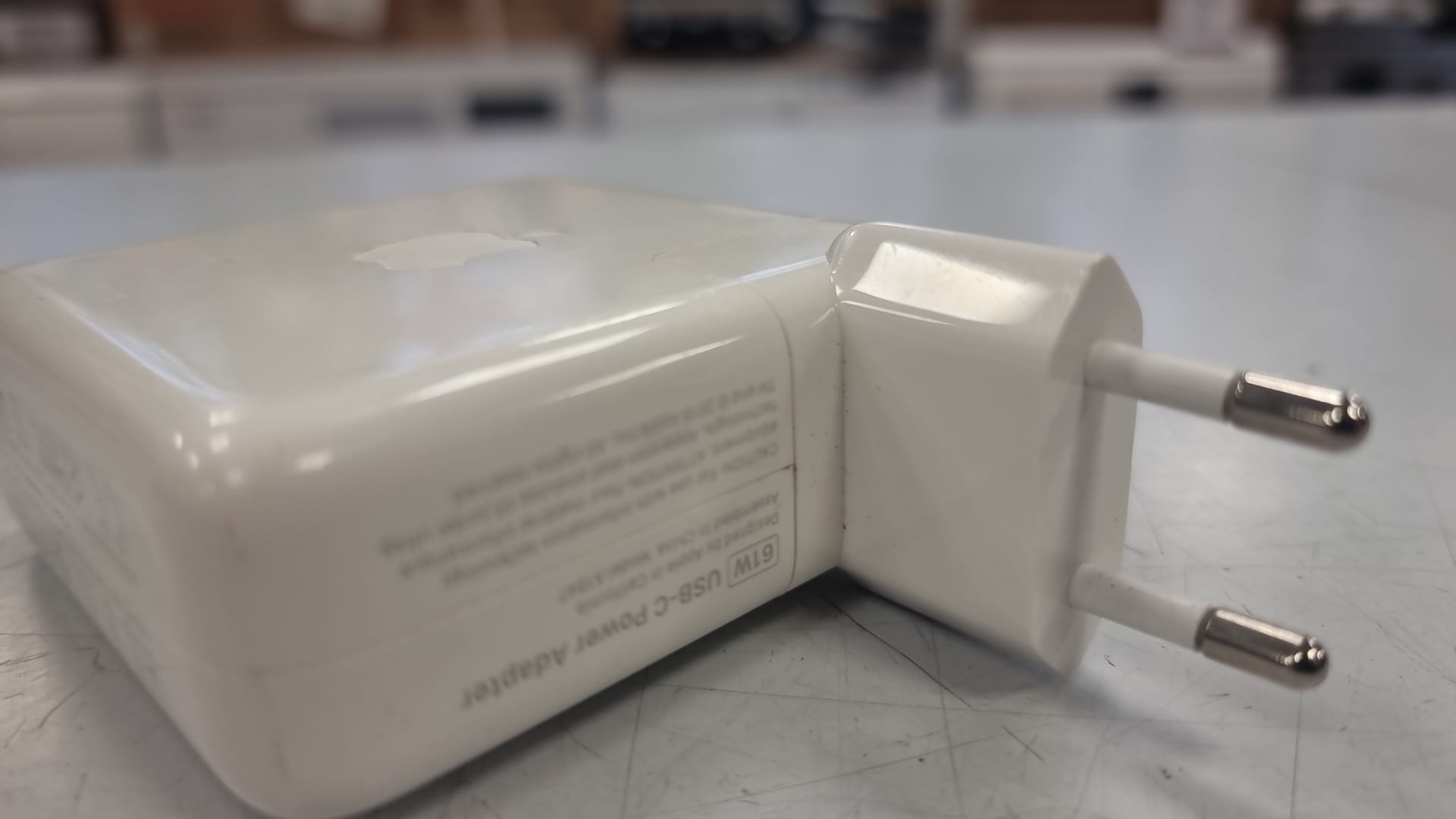 Adaptador de corriente Apple USB-C de 61W. Modelo A1947. Diseño compacto y blanco.