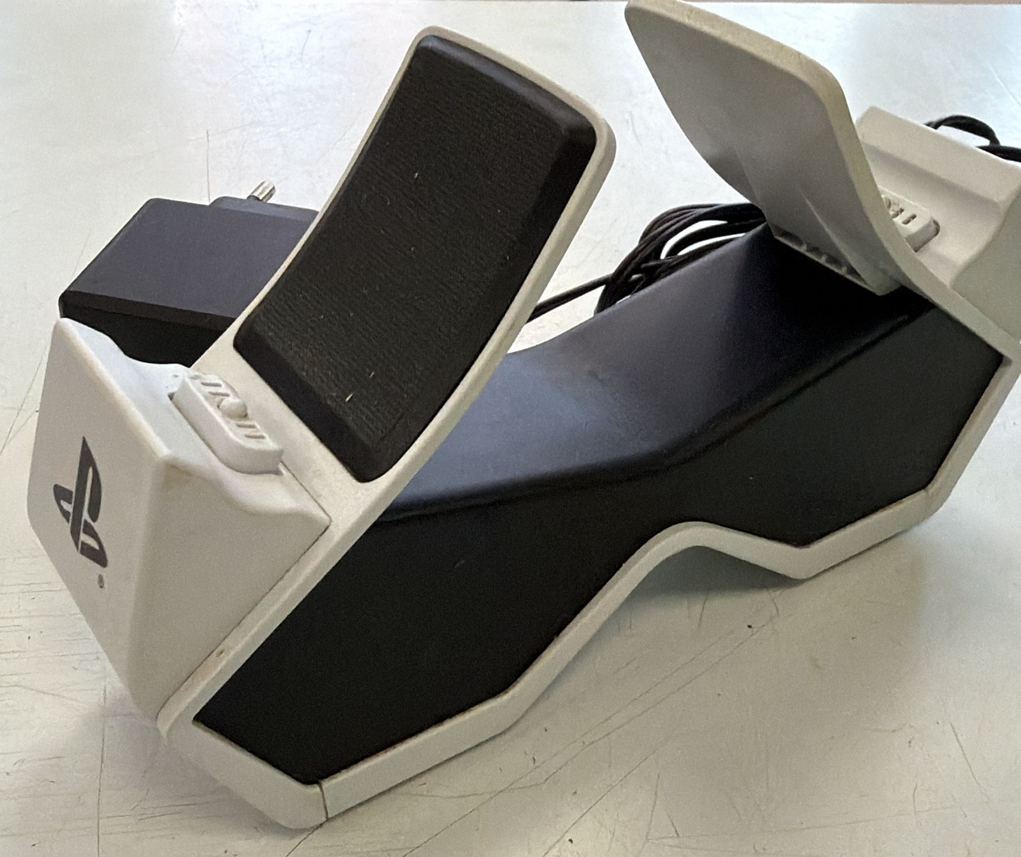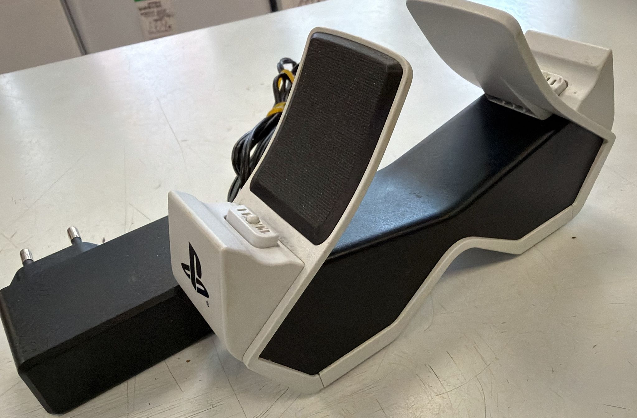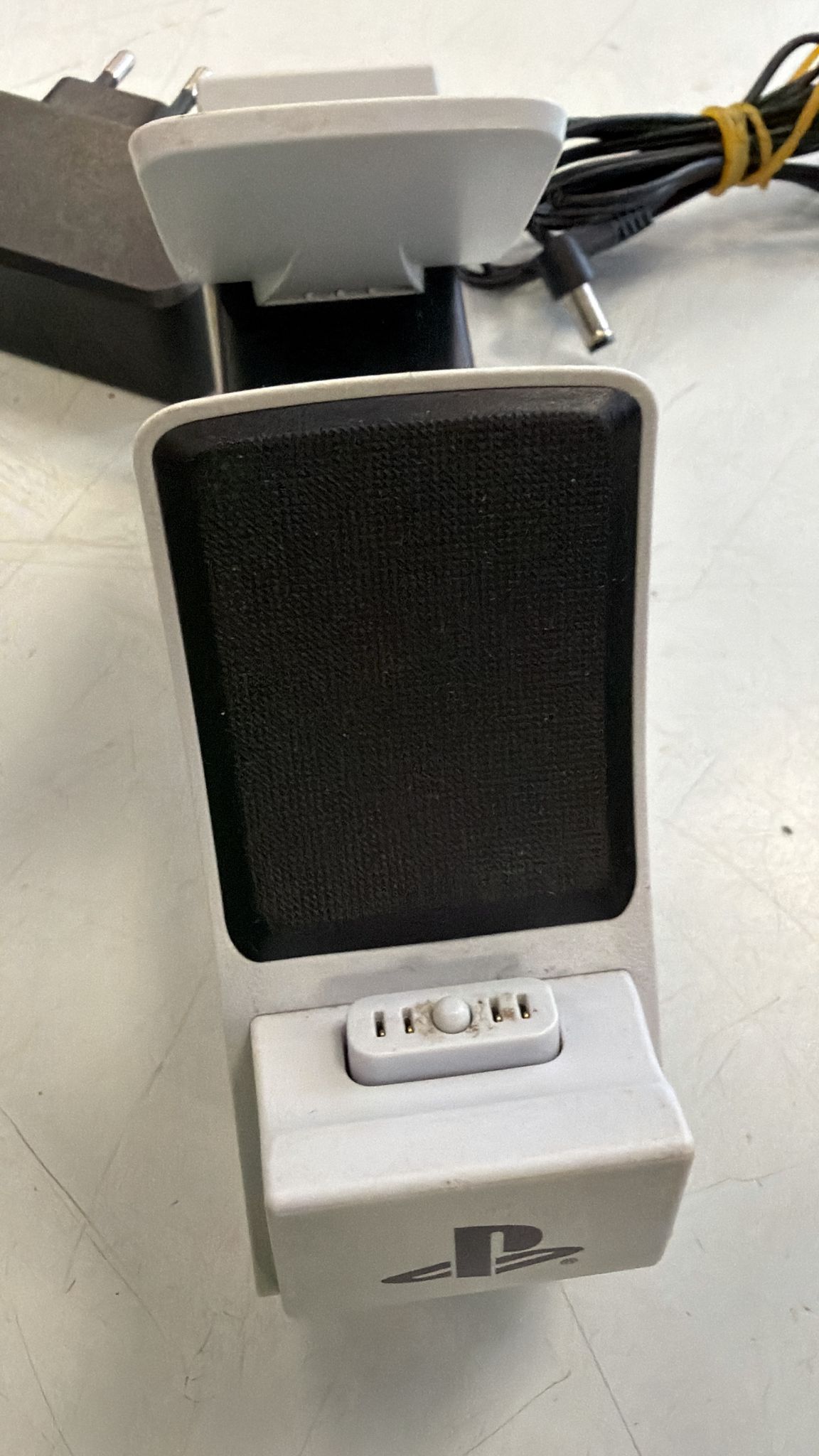Base de carga para mandos de PlayStation 5.Diseño blanco. Conexión para periféricos.