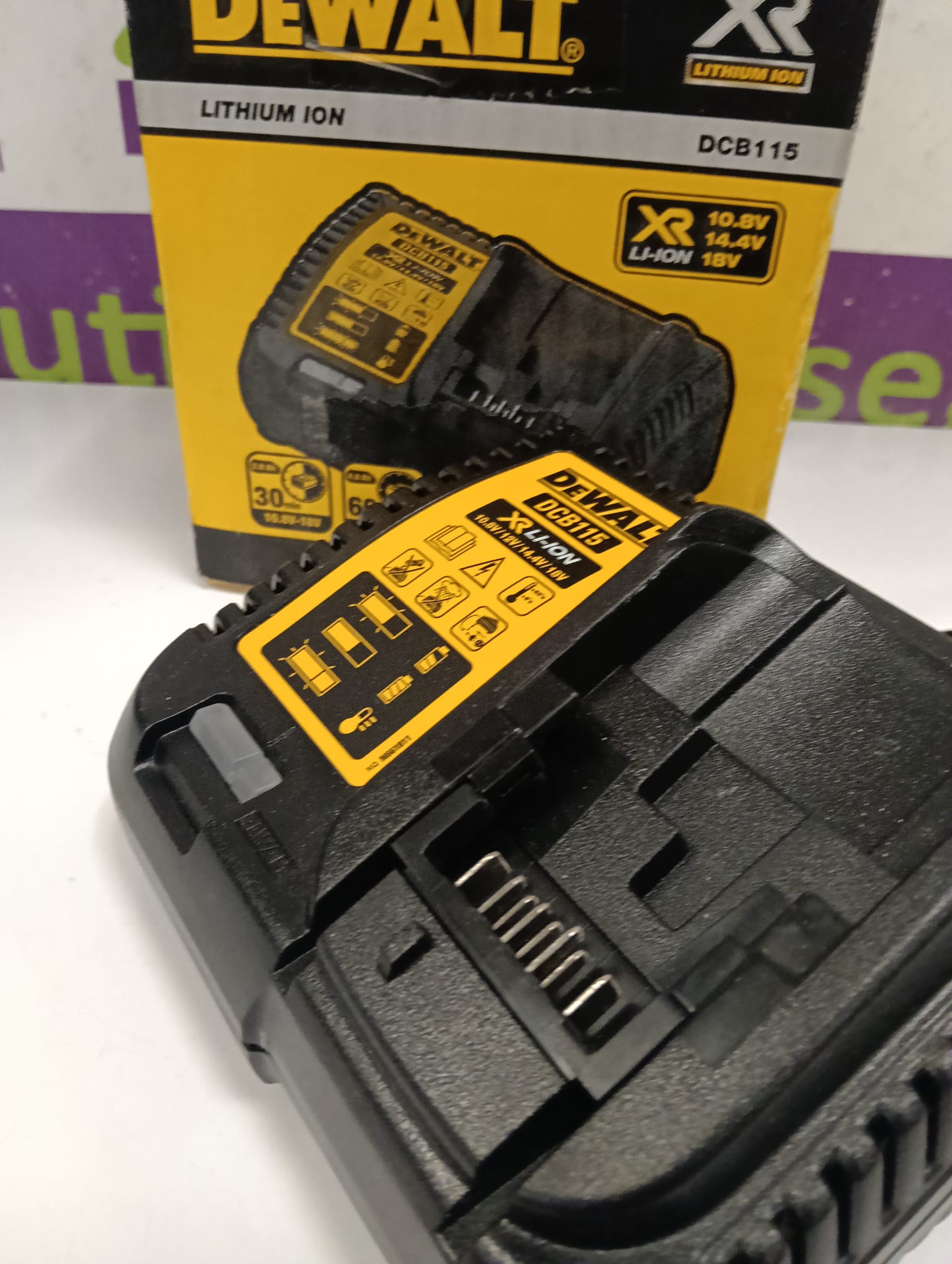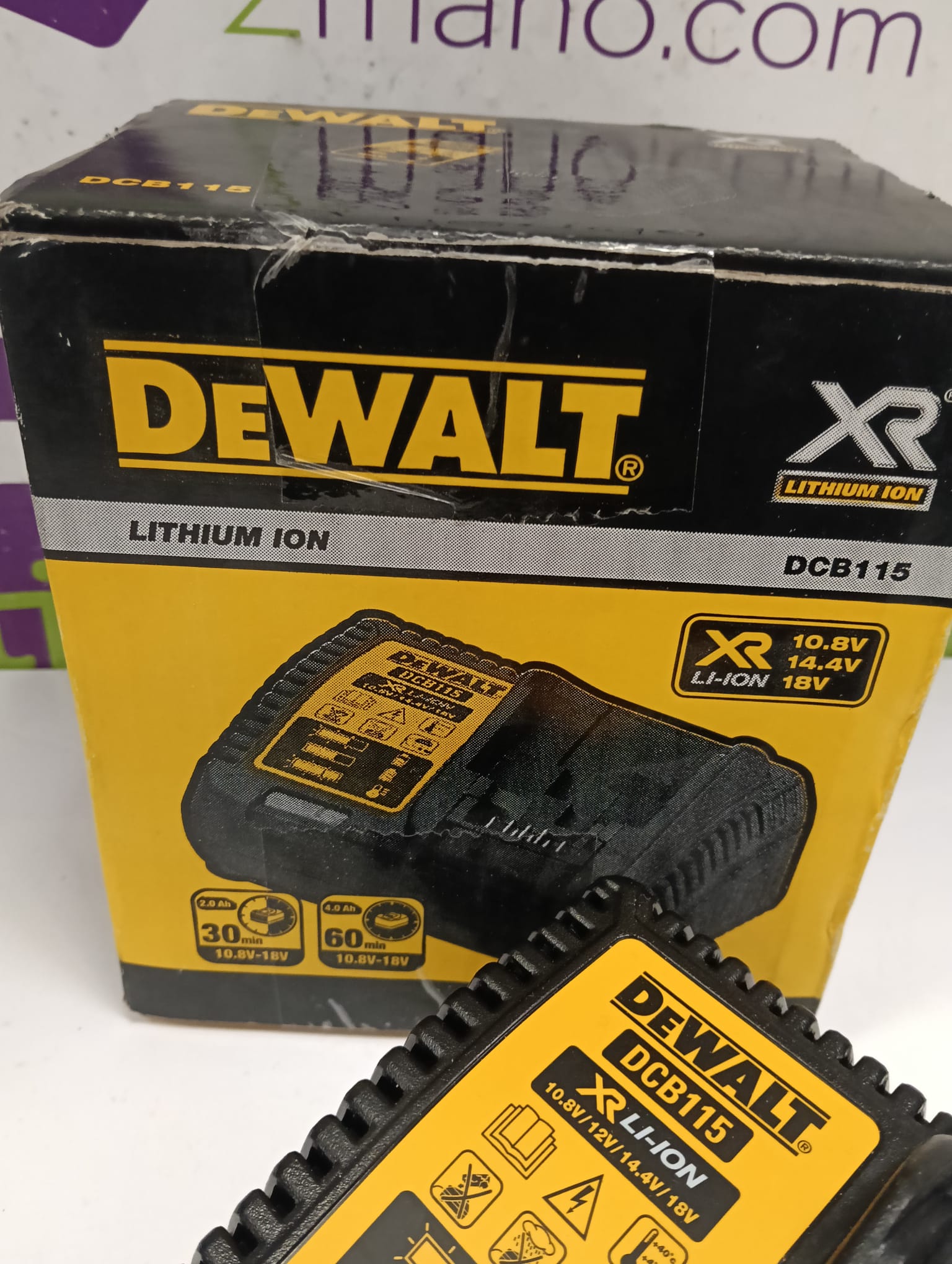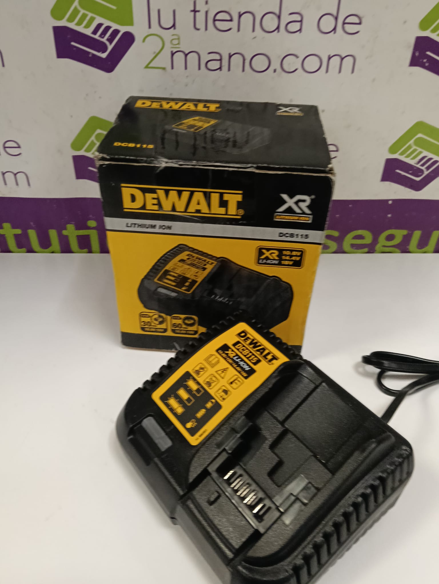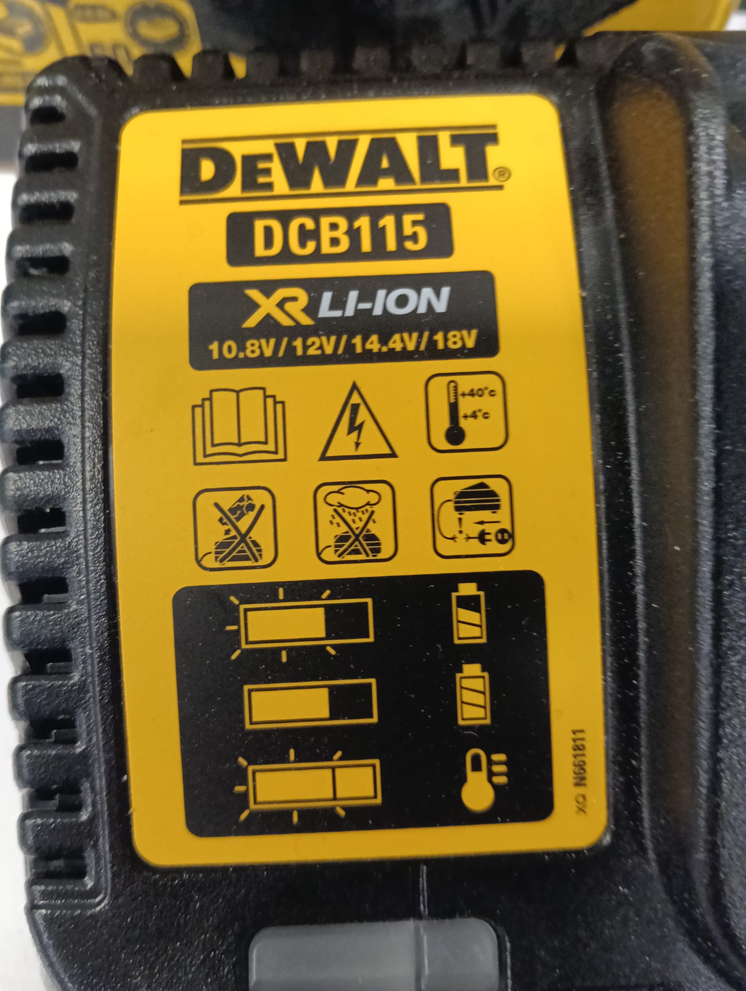 Cargador DeWalt DCB115 para baterías de litio. Compatible con voltajes de 10.8V, 14.4V y 18V. Indicador LED de carga.