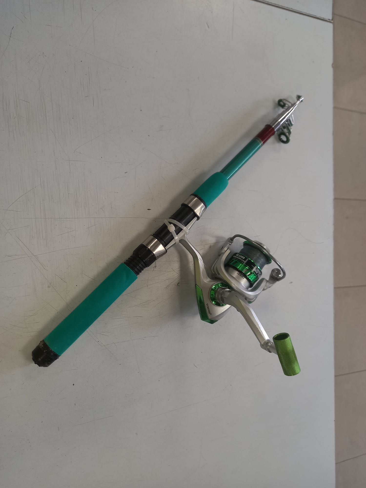 Conjunto de pesca con carrete Yumoshi GL1000 y caña.Carrete de pesca GL1000. Caña de pescar. Mango del carrete en color verde. Bobina del carrete con hilo verde.