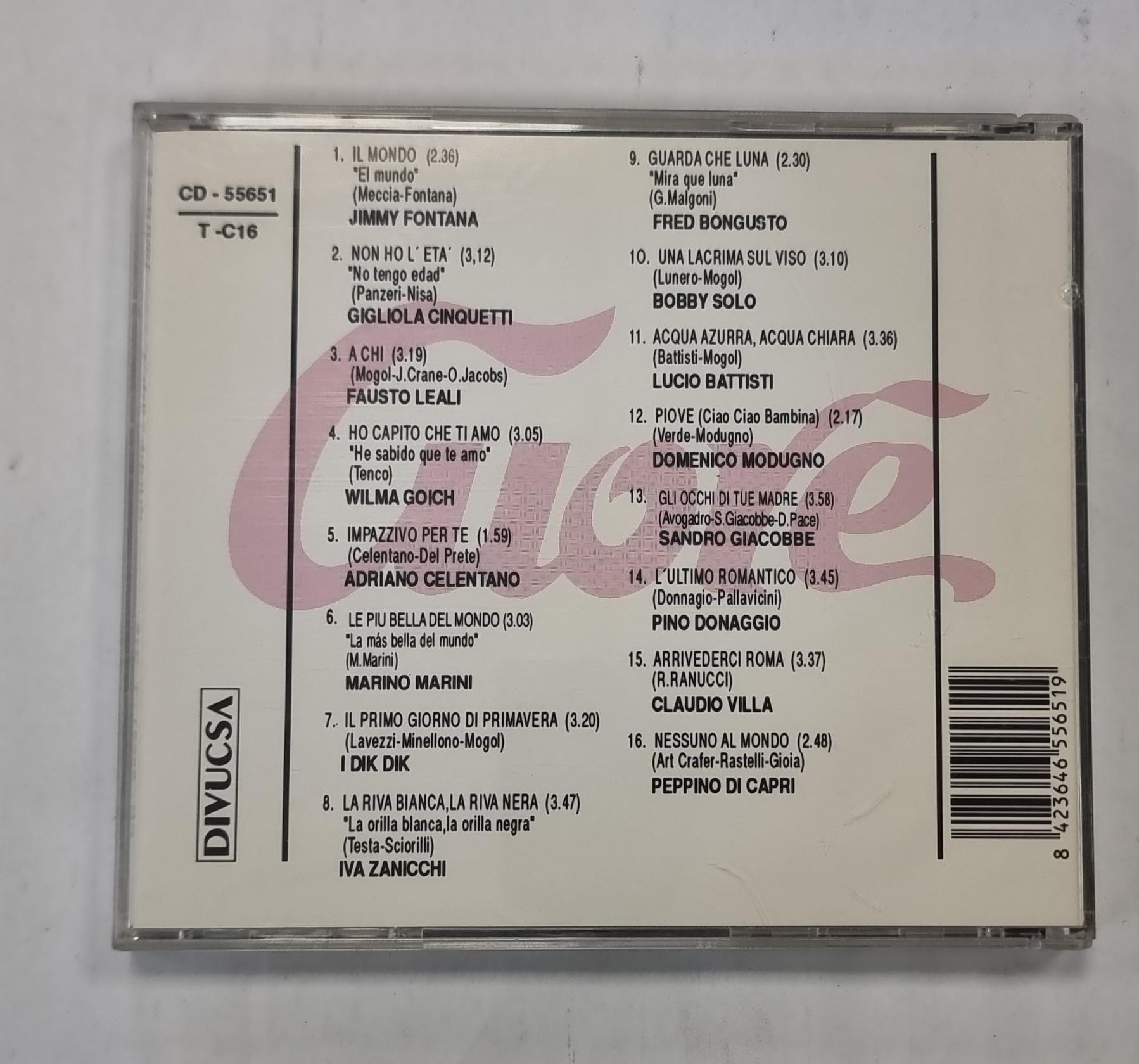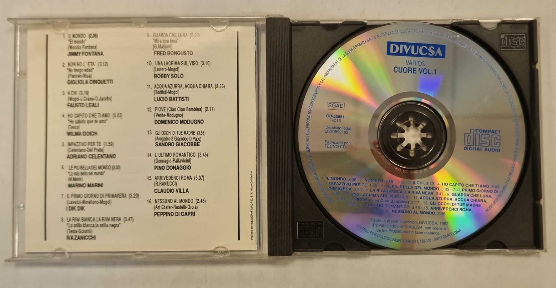 Compilación de música italiana. Cuore Vol. 1Las 50 canciones italianas más románticasIncluye títulos como 'Il Mondo', 'Che Ti Amo', 'La Riva Bianca', 'Acqua Píove', 'Arrivederci Roma', entre otros.