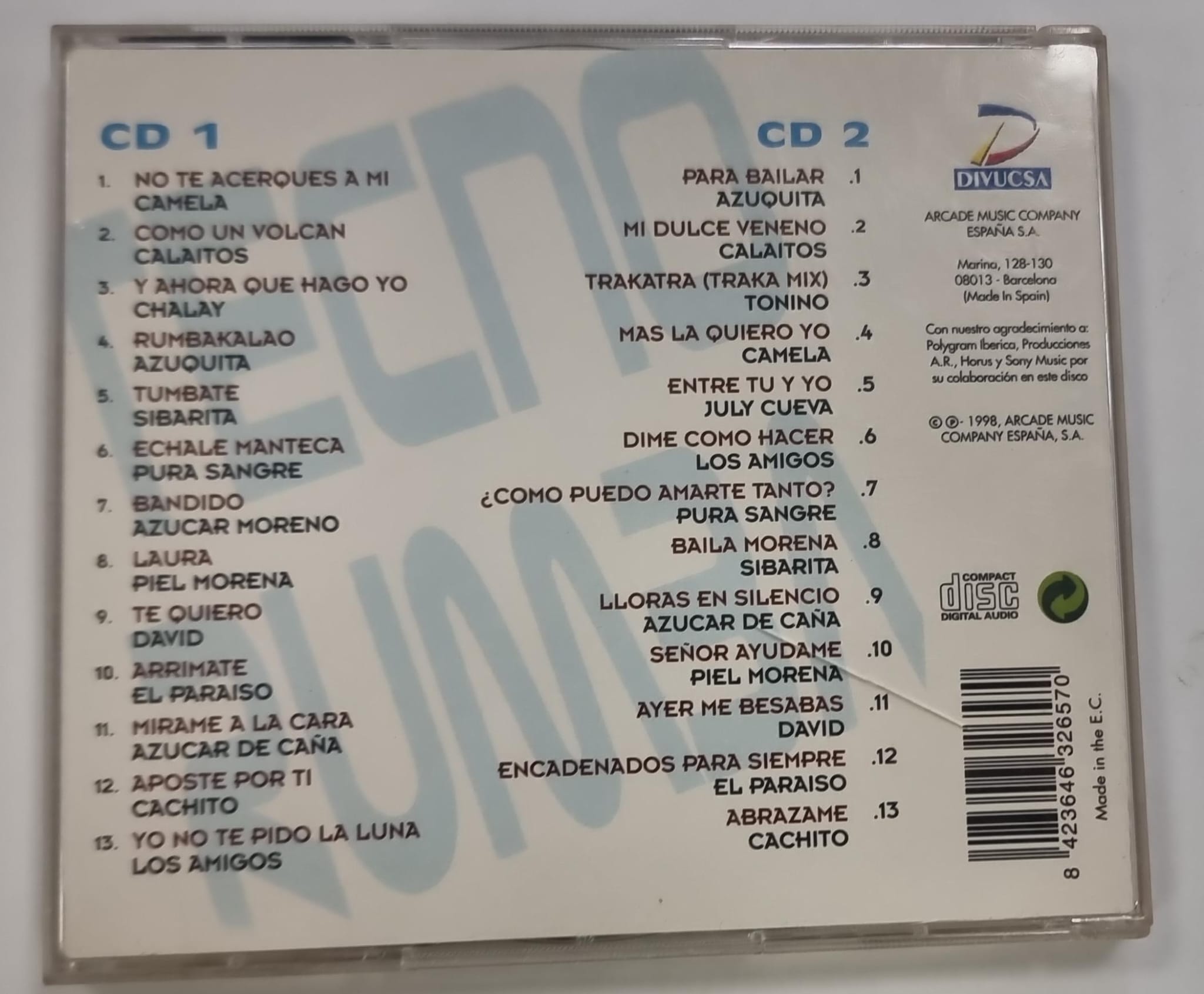 Recopilatorio de música Tecno Rumba con grandes éxitos. Incluye temas de Camela, Calaitos, Chalay, David, Cachito, Azuquita, Azucar Moreno, Pura Sangre, Los Amigos y Piel Morena. Portada con rostros y diseño llamativo. Formato CD.