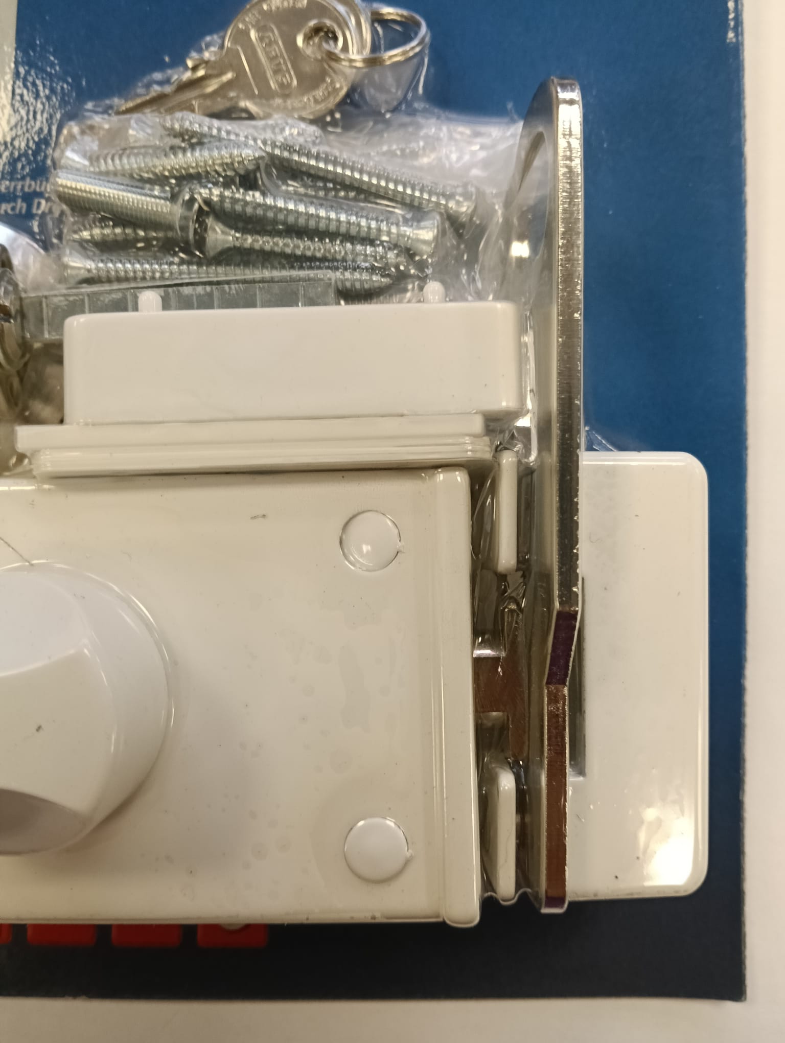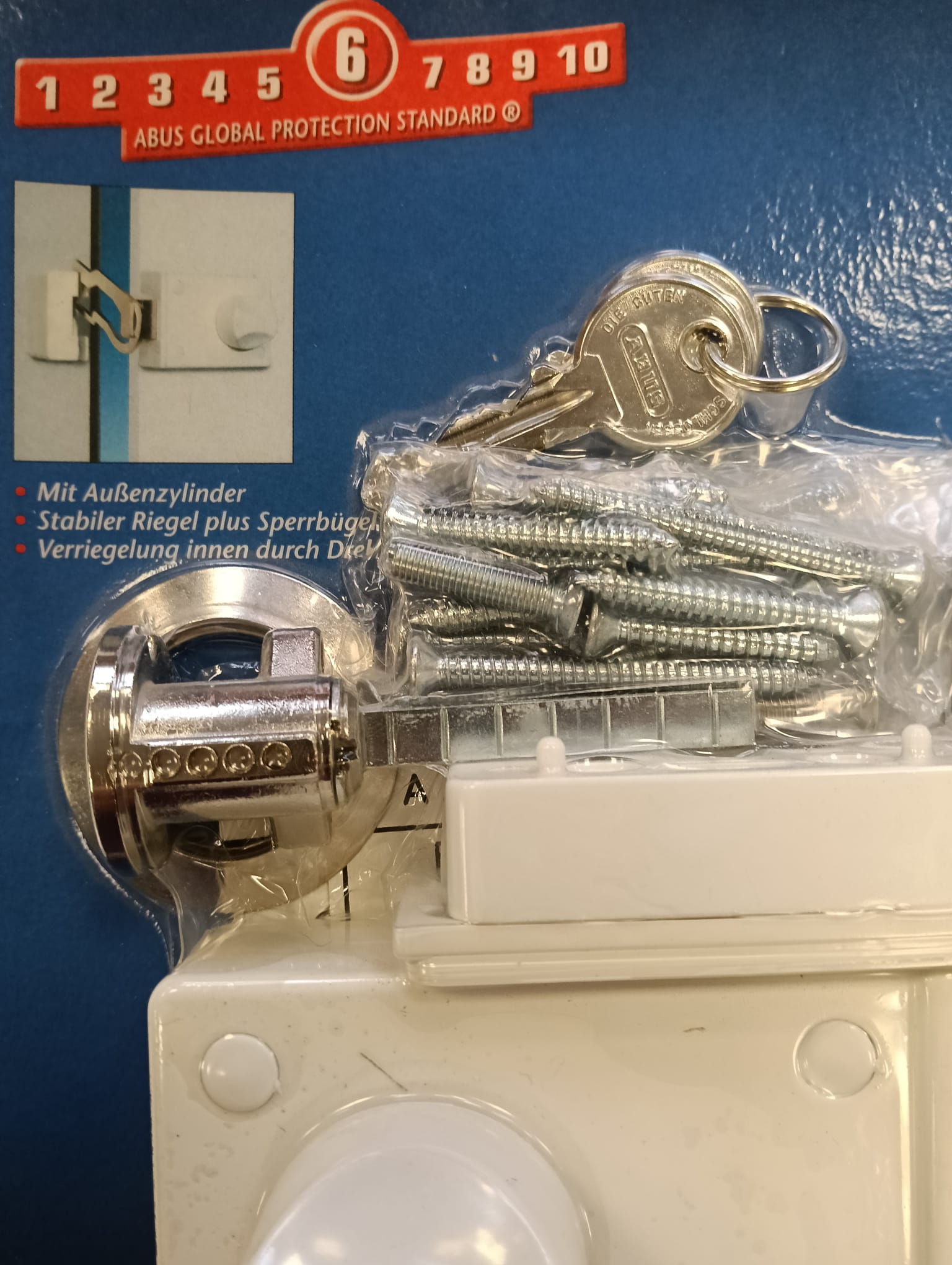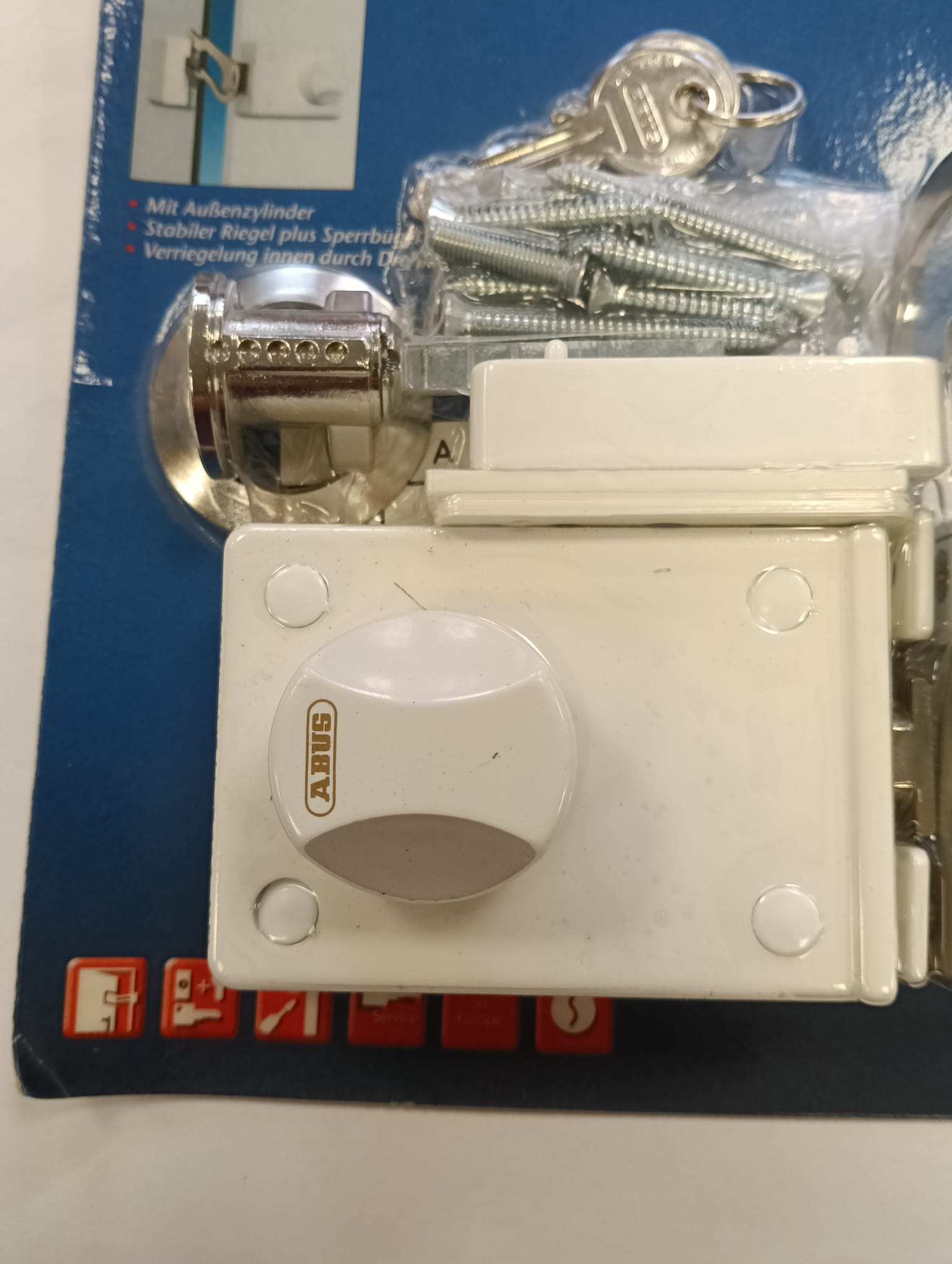 Cerradura de alta seguridad ABUS 2030 en color blanco. Incluye cilindro exterior y pestillo. Modelo: Tür-Zusatzschloss 2030. Nivel de seguridad ABUS Global Protection Standard: 6. Incluye dos llaves. Tornillería para montaje. Nuevo a estrenar.