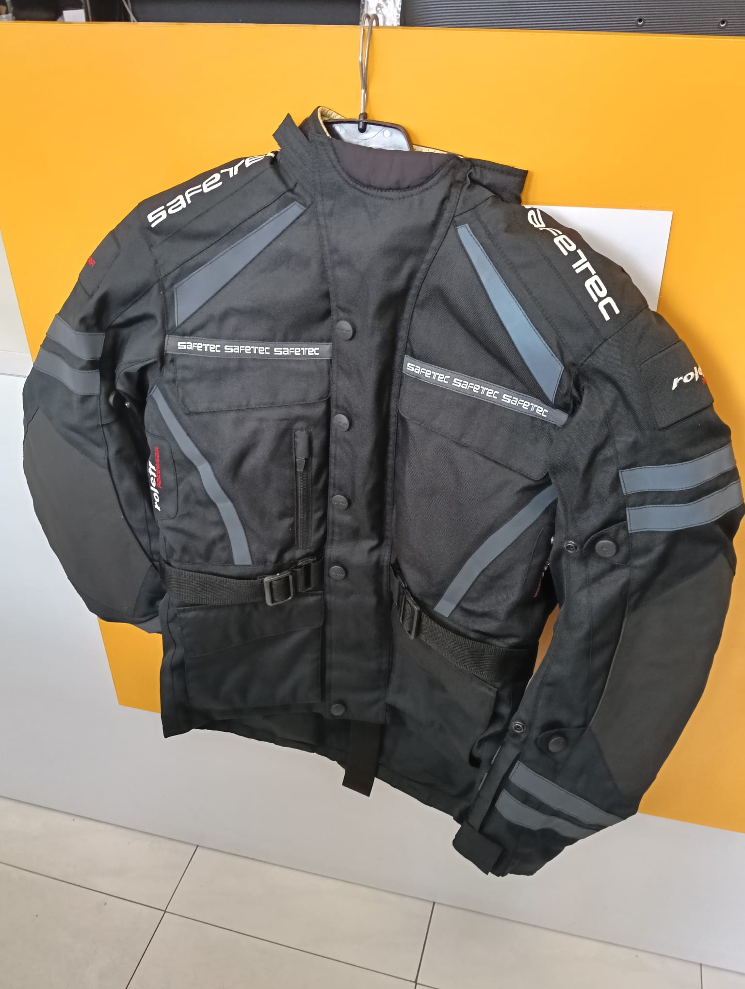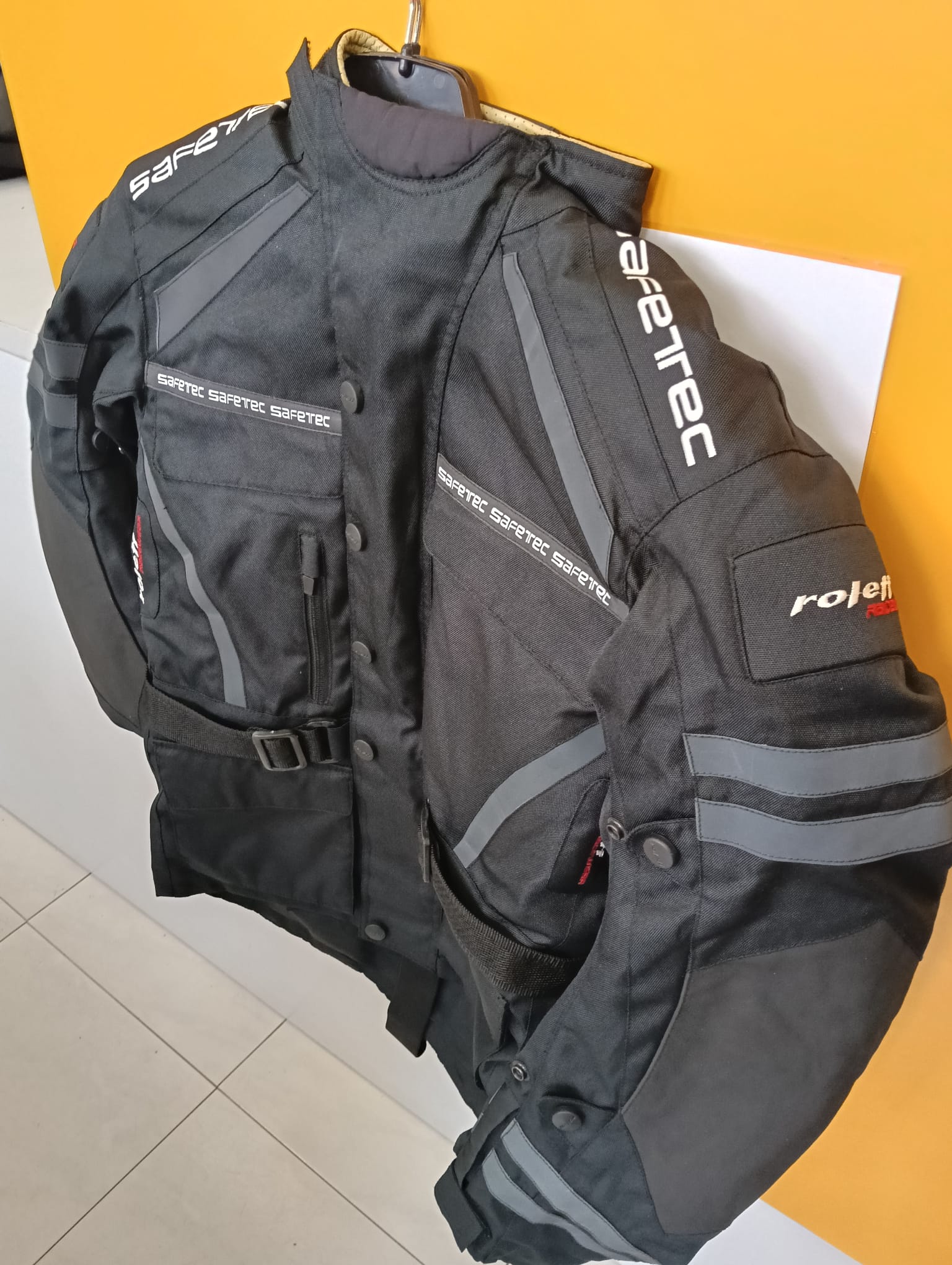 Chaqueta de moto Roleff Racewear en talla X. Incluye protecciones. Diseño en color negro con detalles grises.Sin forro.