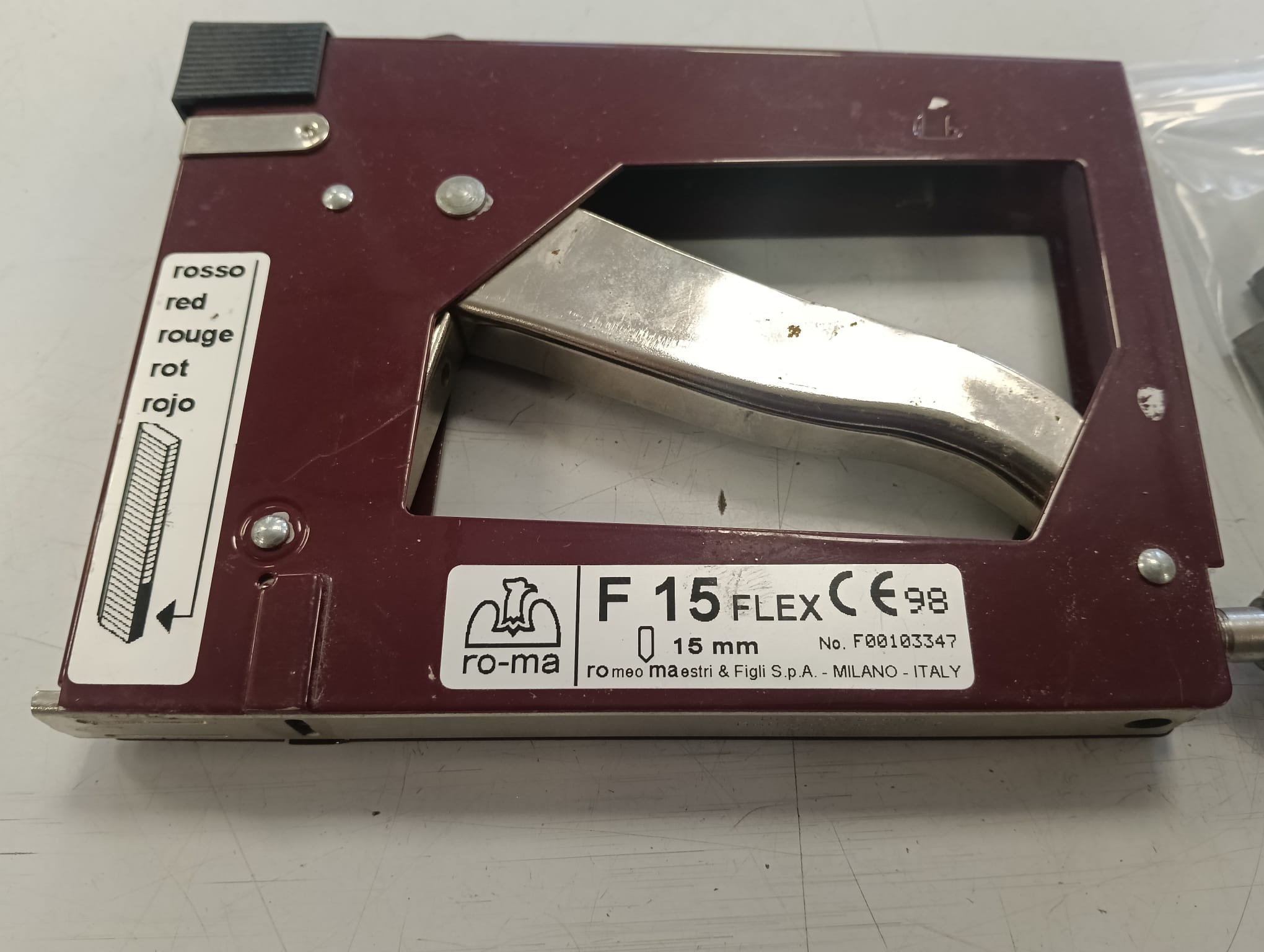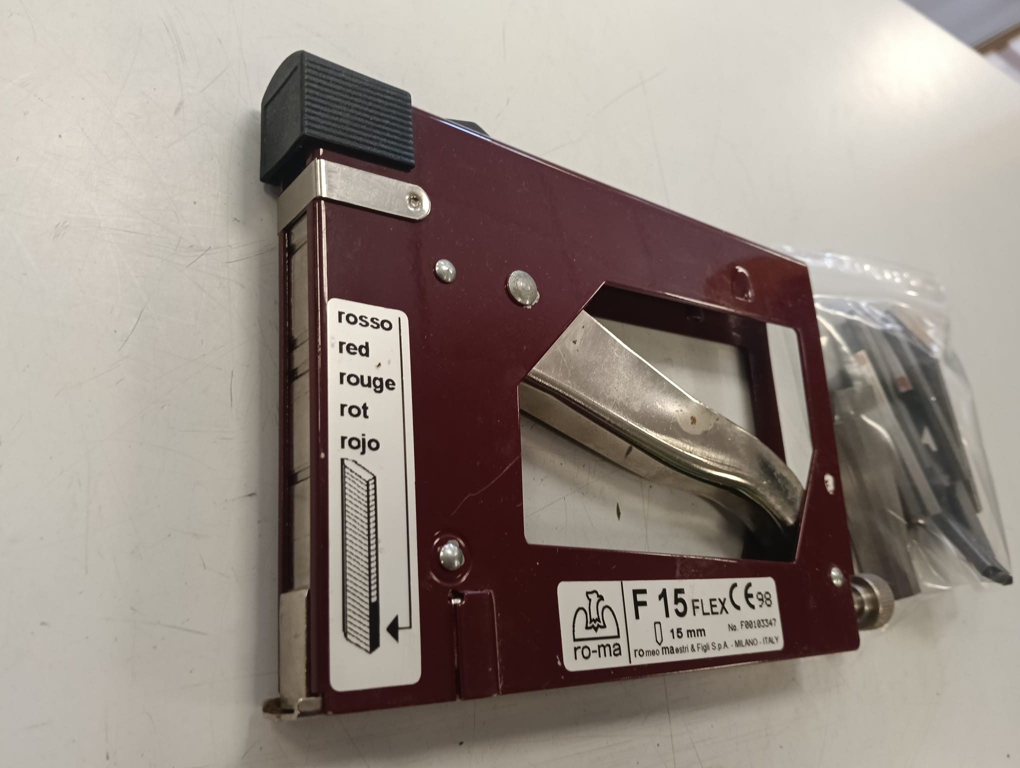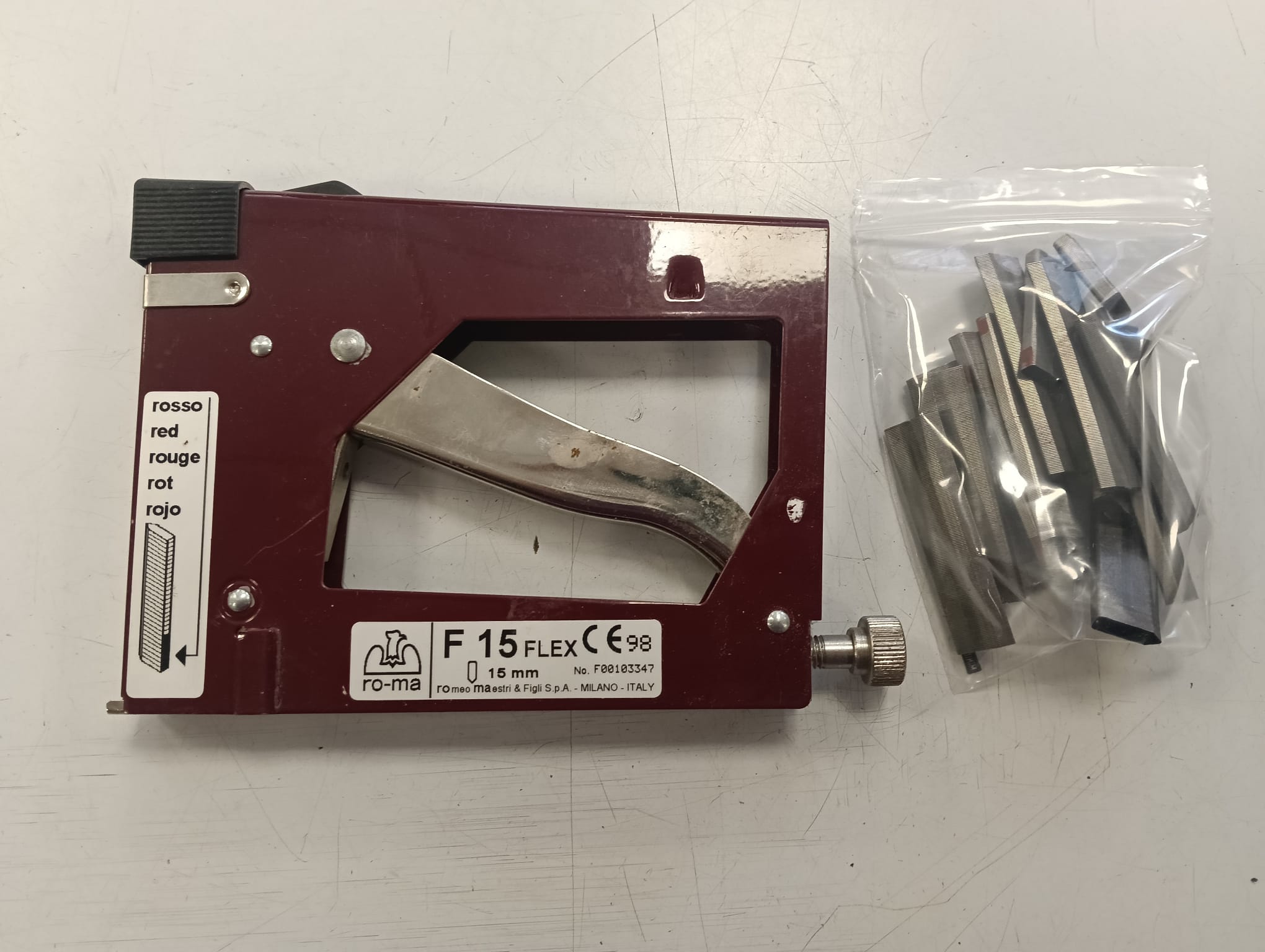 Clavadora flexipuntas, modelo ROMA Flex F15. Añade varias puntas para probar y usar. Muy práctica para la terminación de portafotos o trabajos de enmarcación no definitivos.