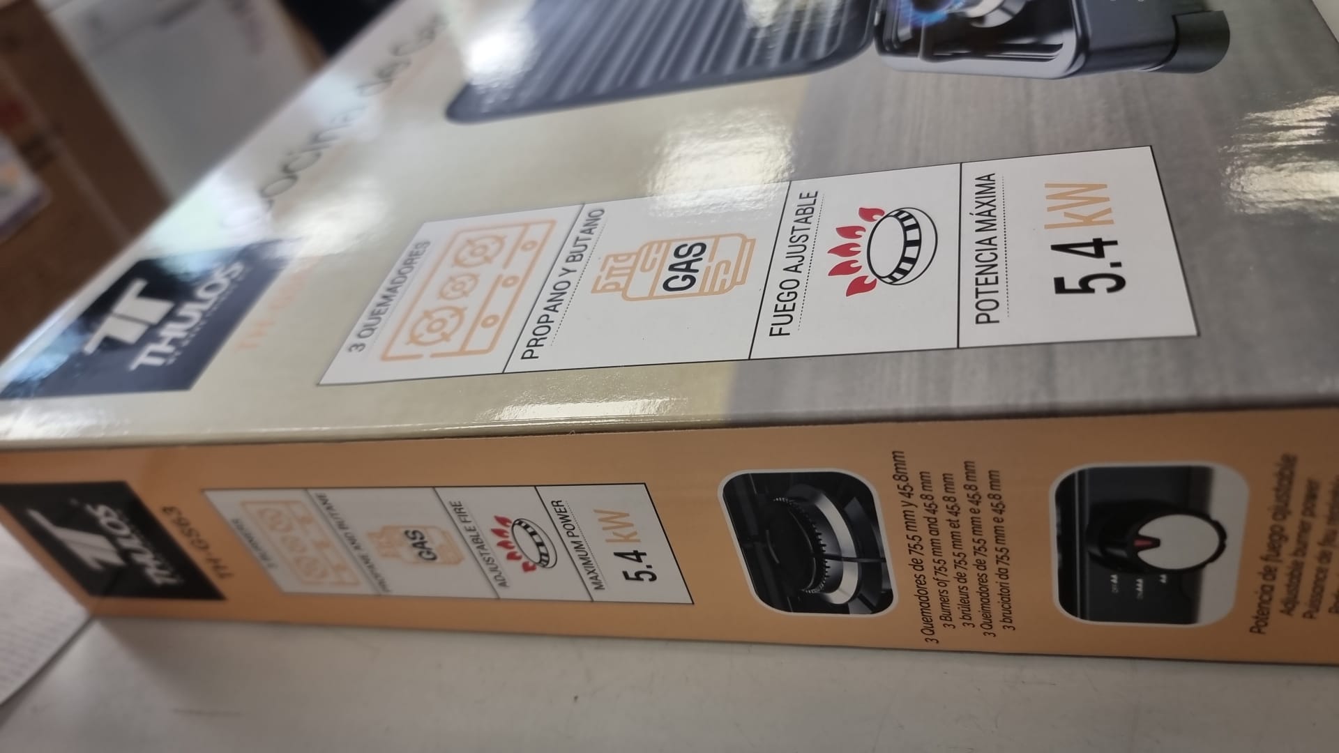 Cocina de gas portátil de la marca Thulos, modelo THGS63, con tres quemadores. Ideal para disfrutar de comidas deliciosas en cualquier lugar.Tres quemadores de 75.5 mm y 45.8 mm.Funciona con propano y butano. Fuego ajustable. Potencia máxima de 5.4 kW.