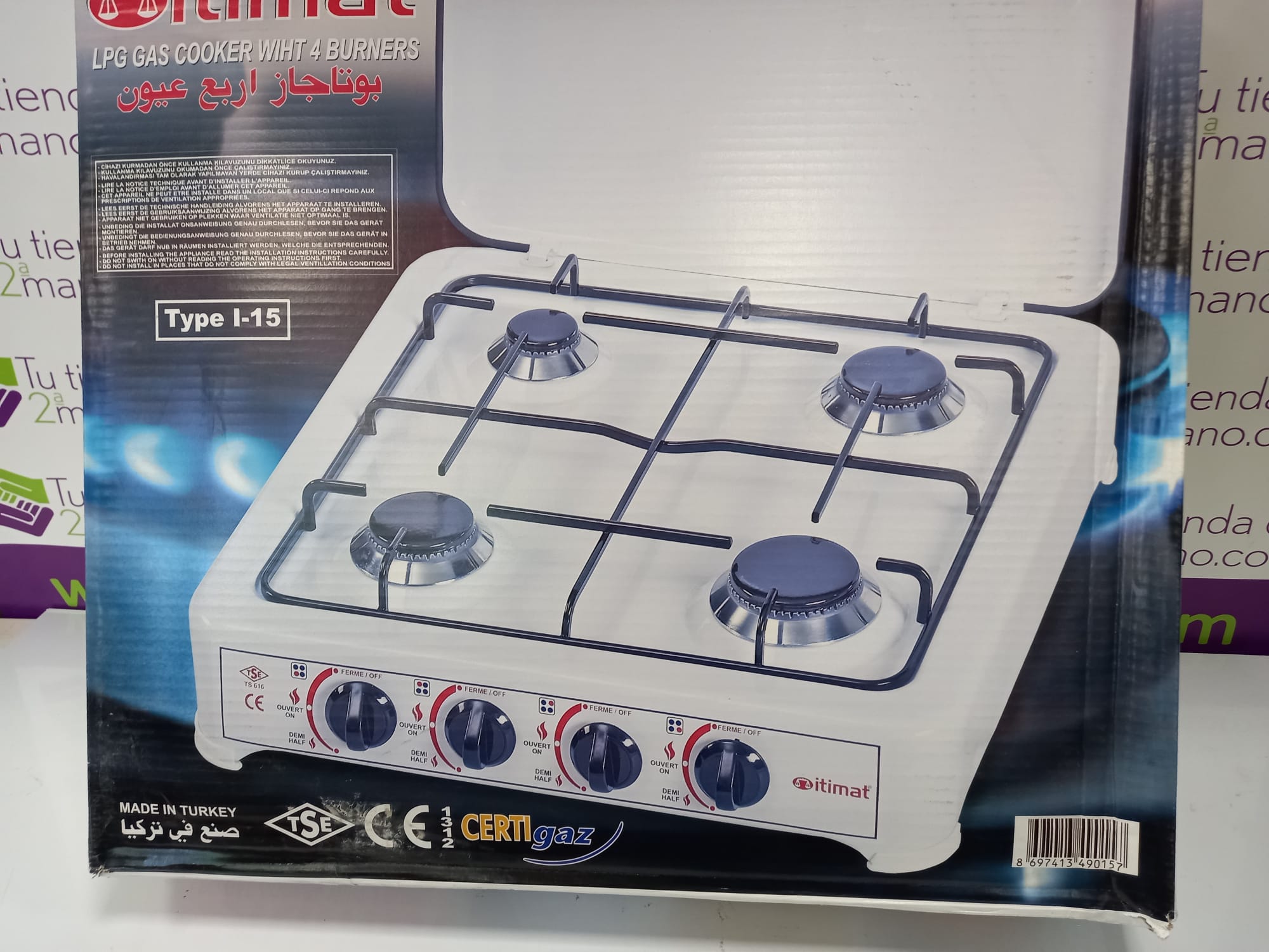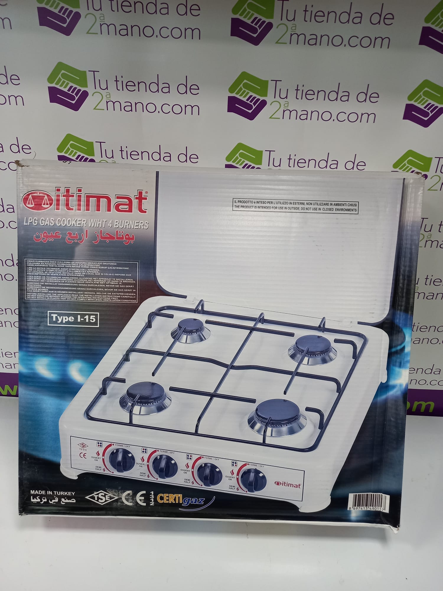 Cocina de gas de sobremesa. Modelo Itimat. Con 4 quemadores. Para gas butano. Con tapa. Nueva a estrenar.