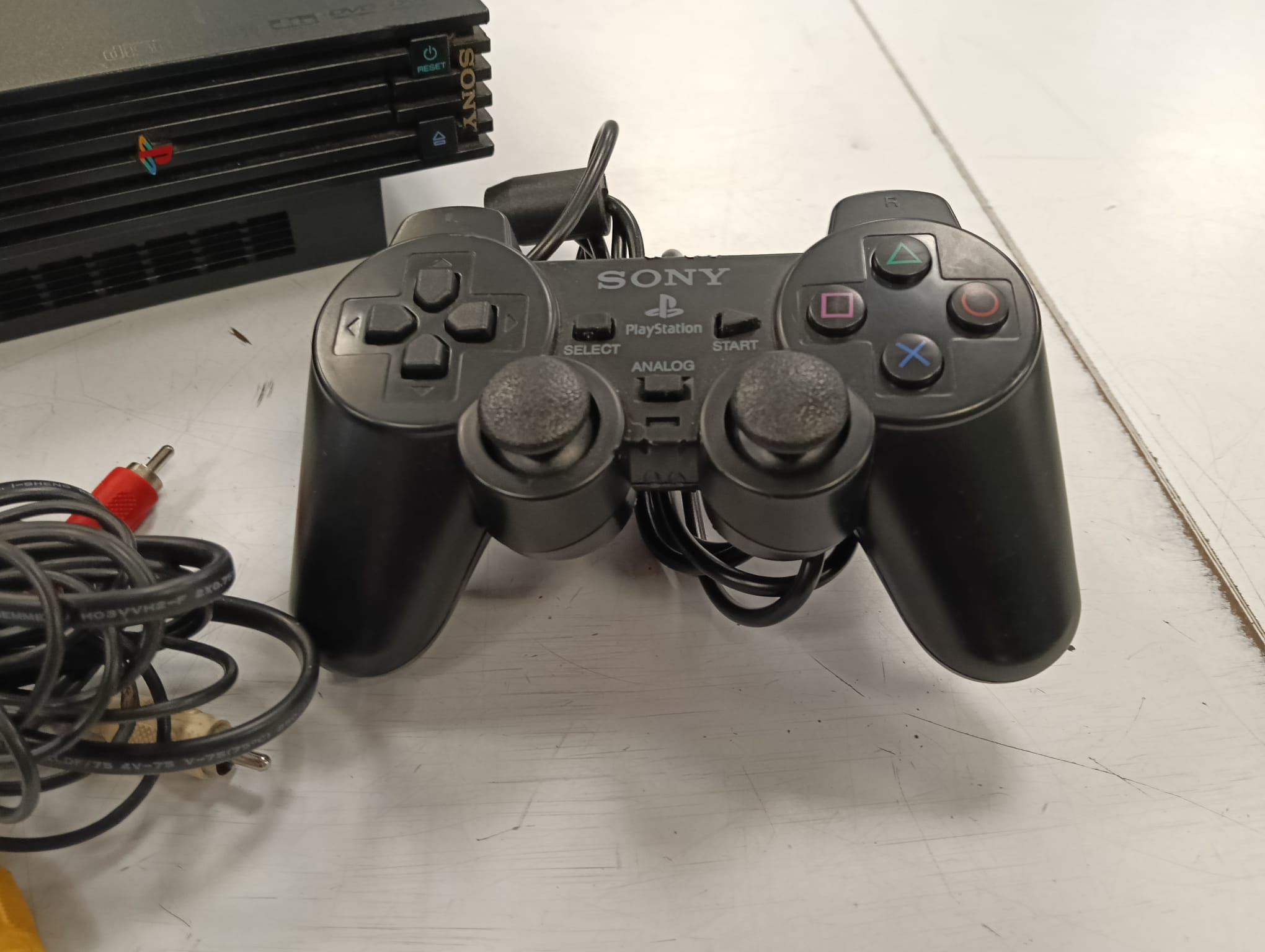 Consola PlayStation 2 modelo Fat en color negro, junto con su mando original. Mando Sony DualShock 2. Cables de conexión incluidos.
