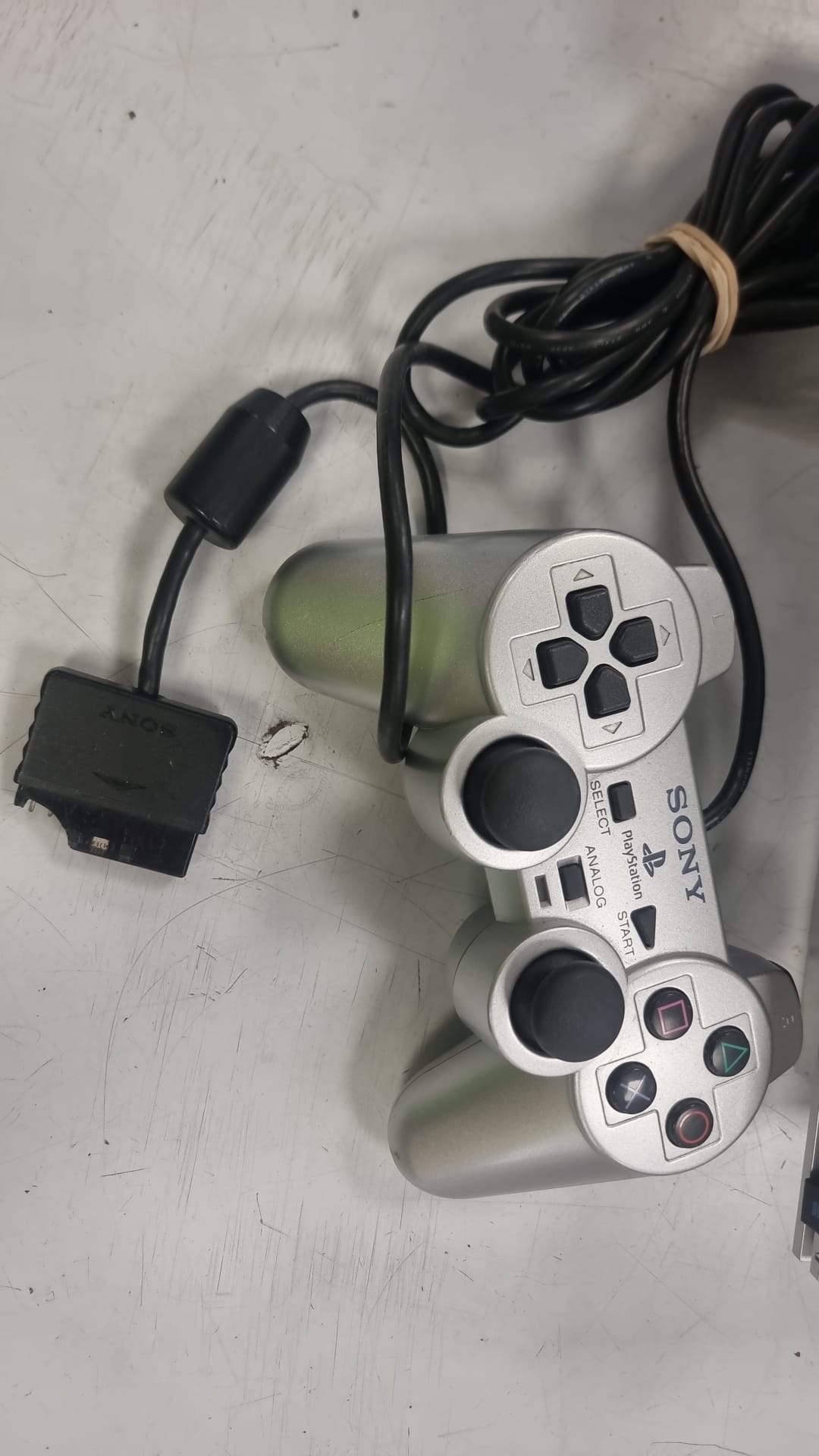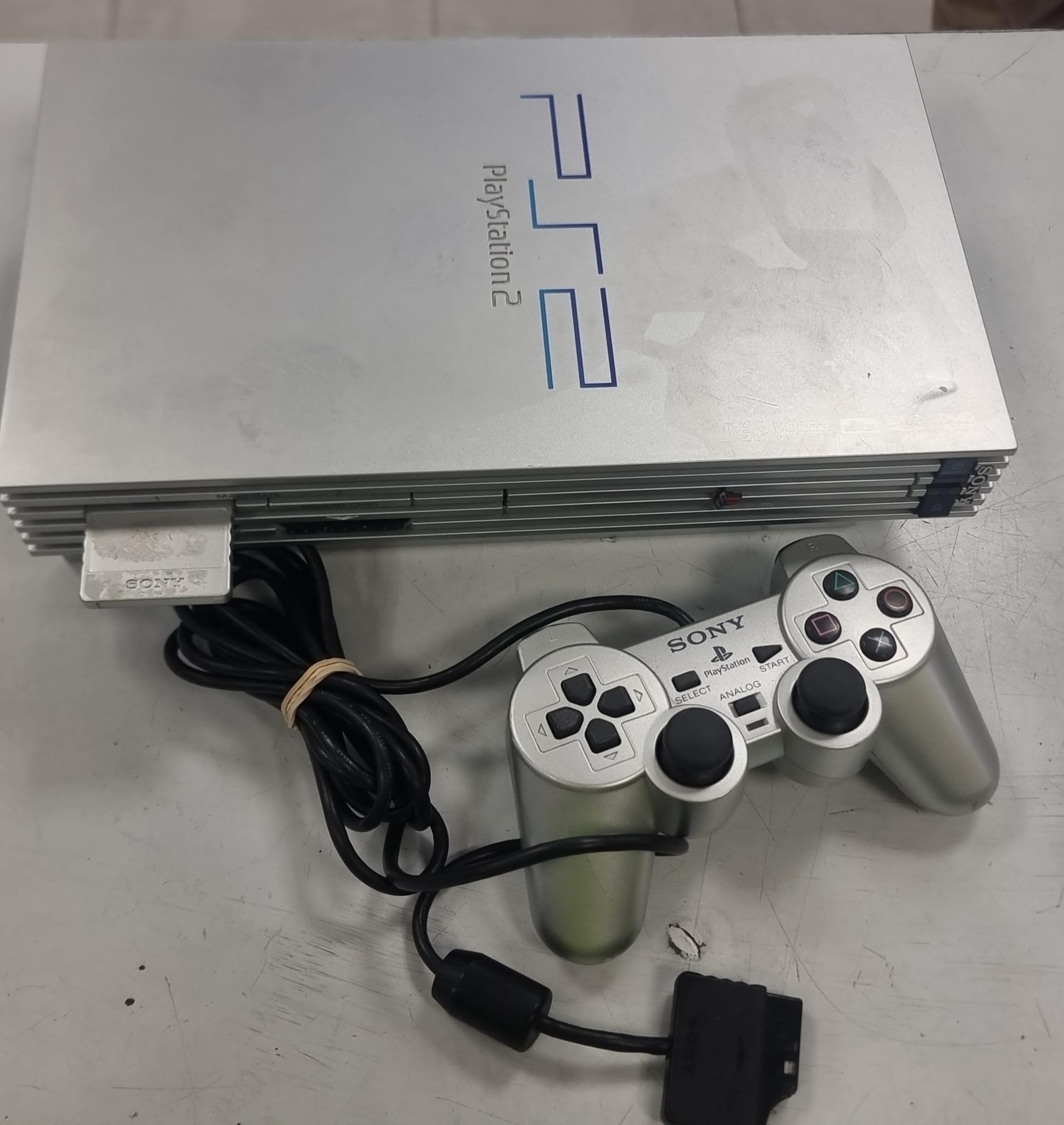 Consola PlayStation 2 modelo Fat en color plata, con su mando original desperfectos estetico. Signos visibles de uso.