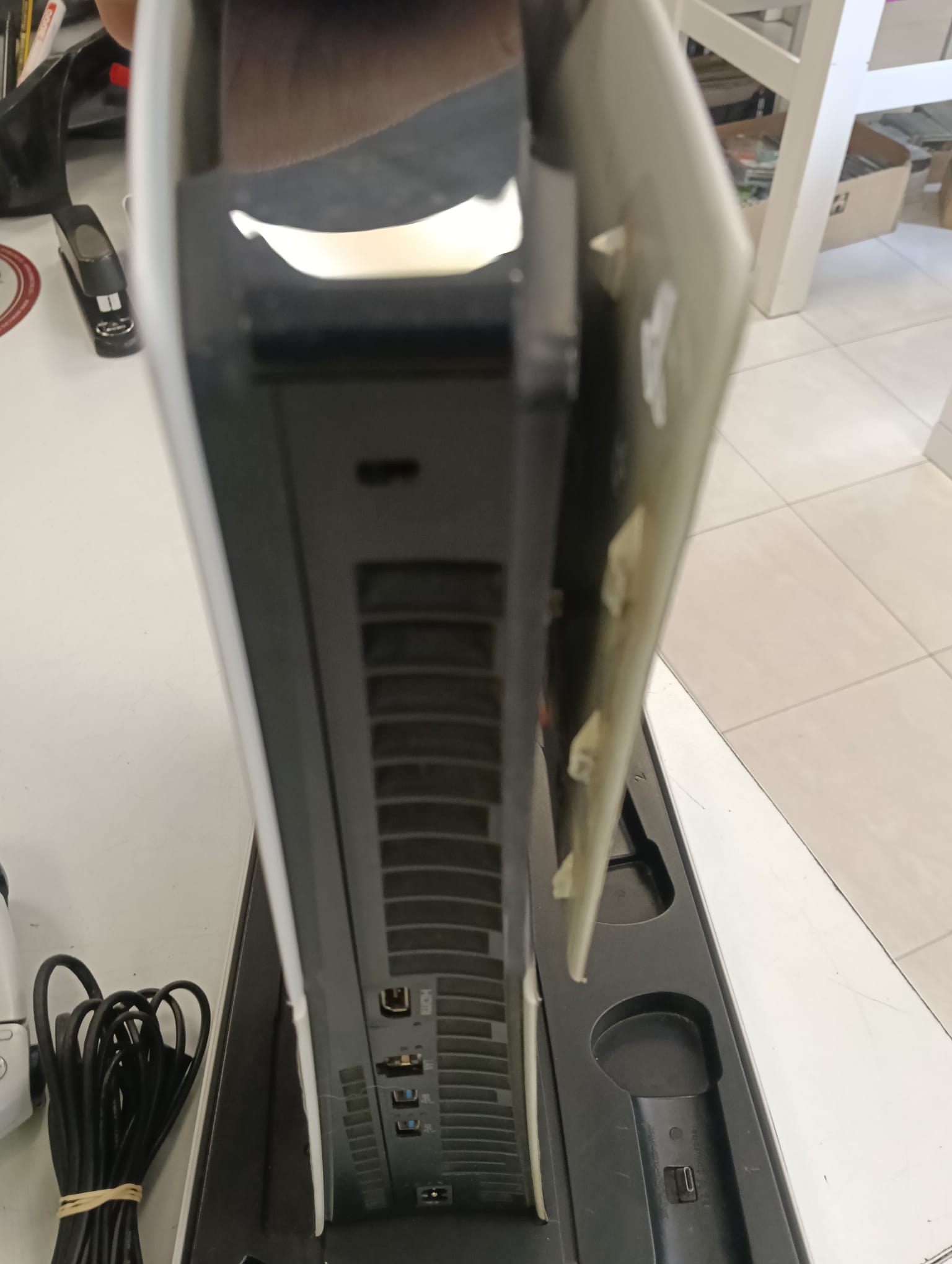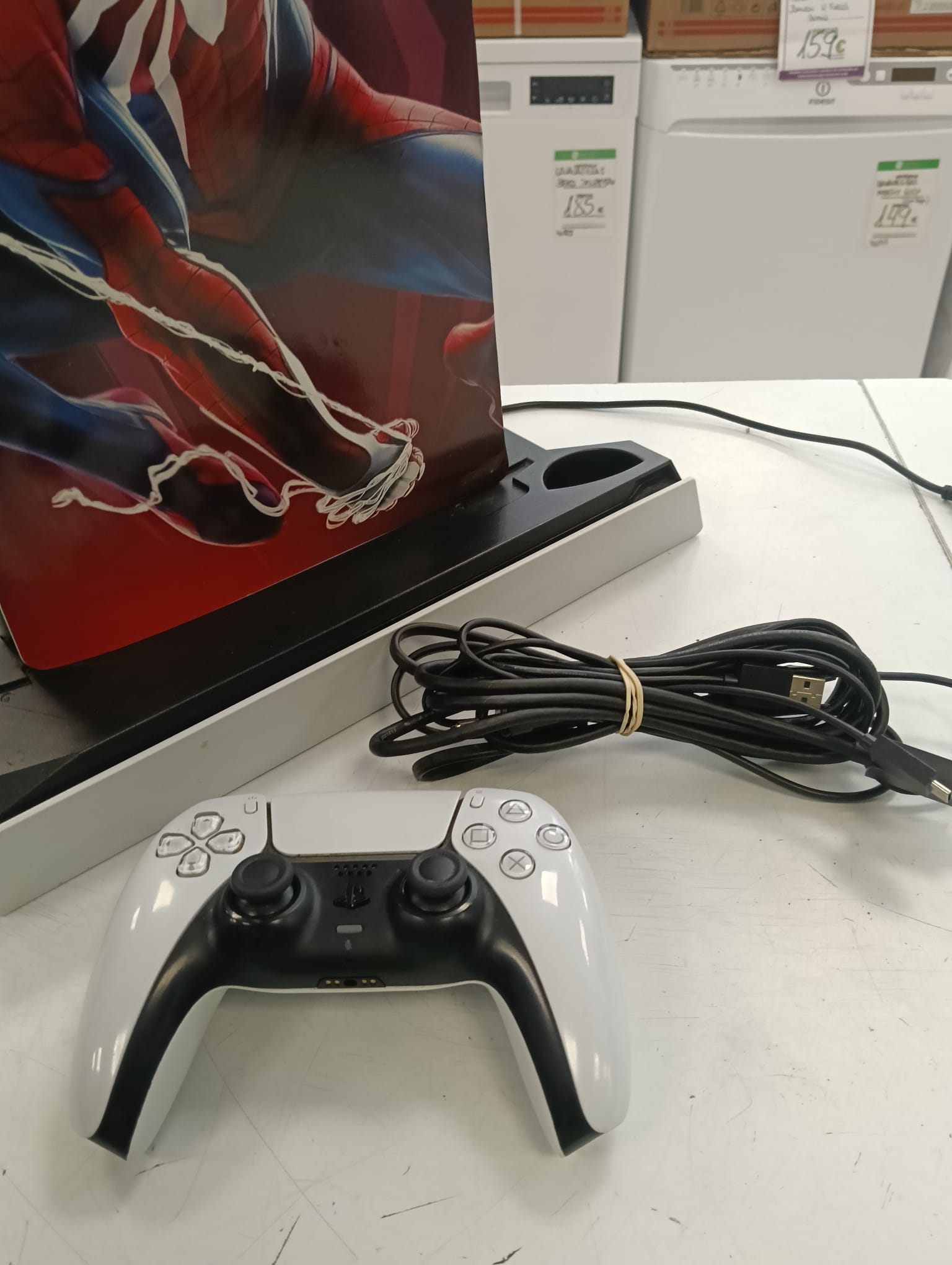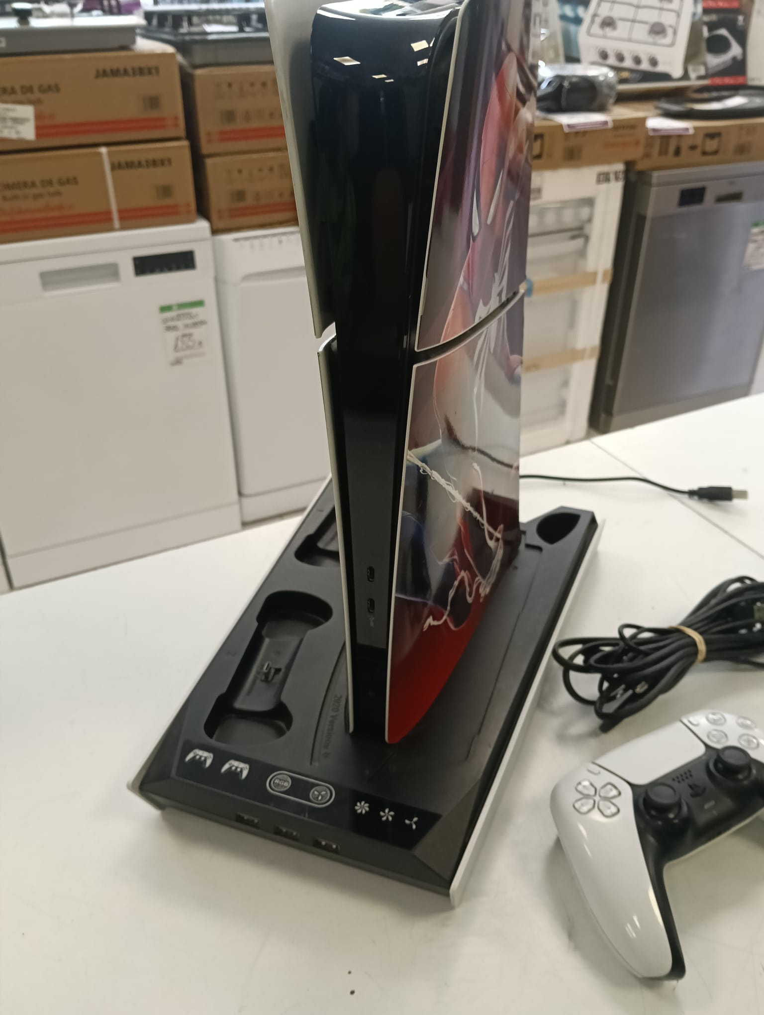 Consola PlayStation 5 Edición Digital con diseño rotulado de Spider-Man y base de carga.Capacidad de 1TB Incluye base de carga. Pestaña rota como se observa en la imagen.