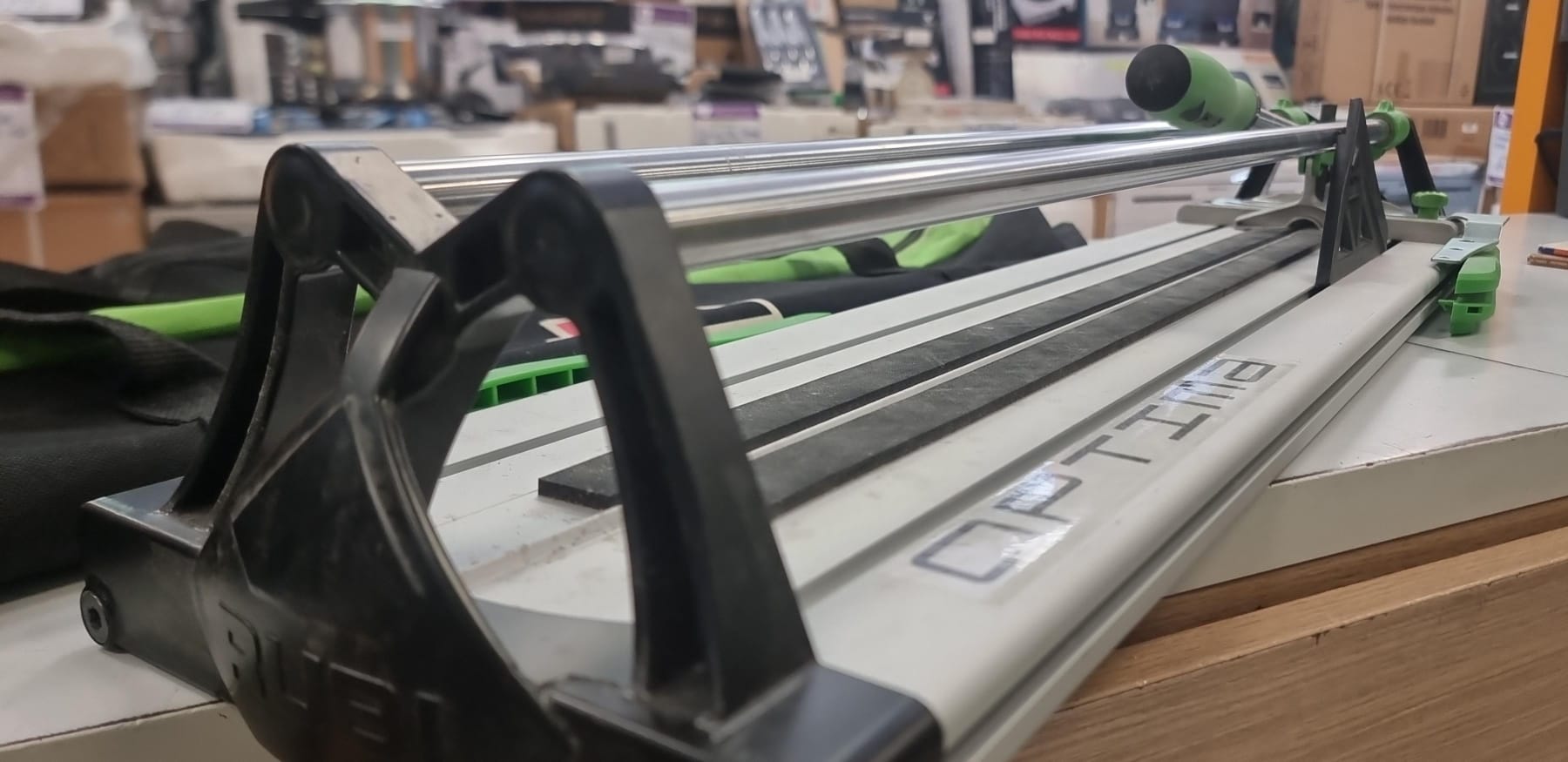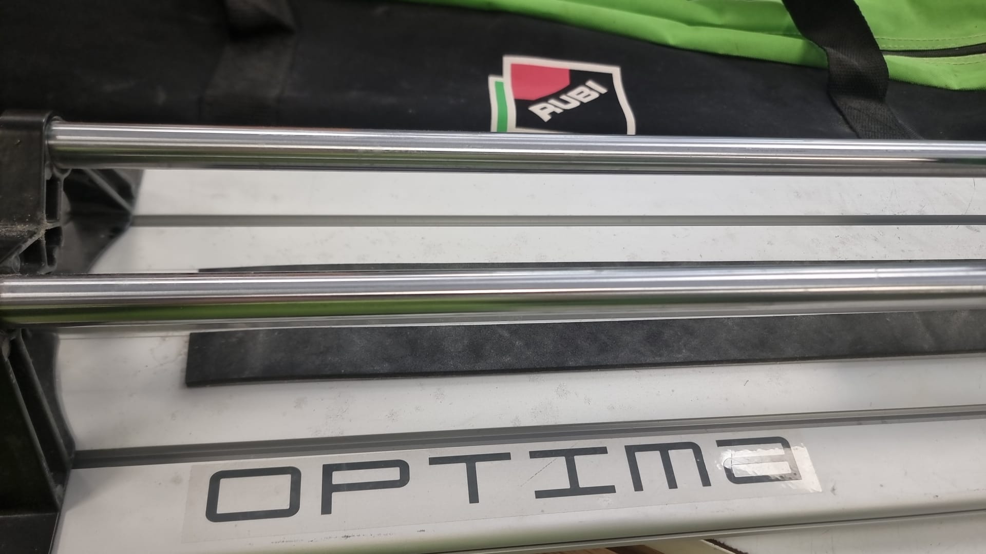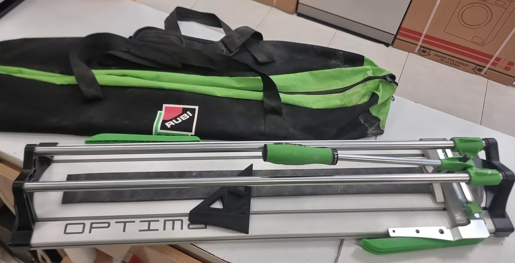Cortador de azulejos de la marca Rubi, modelo Optima 65.Incluye bolsa de transporte.Mango de corte ergonómico en color verde.Base de corte plateada con guías metálicas.