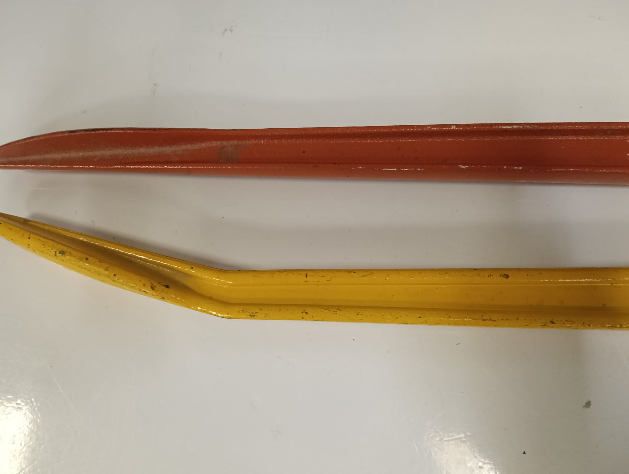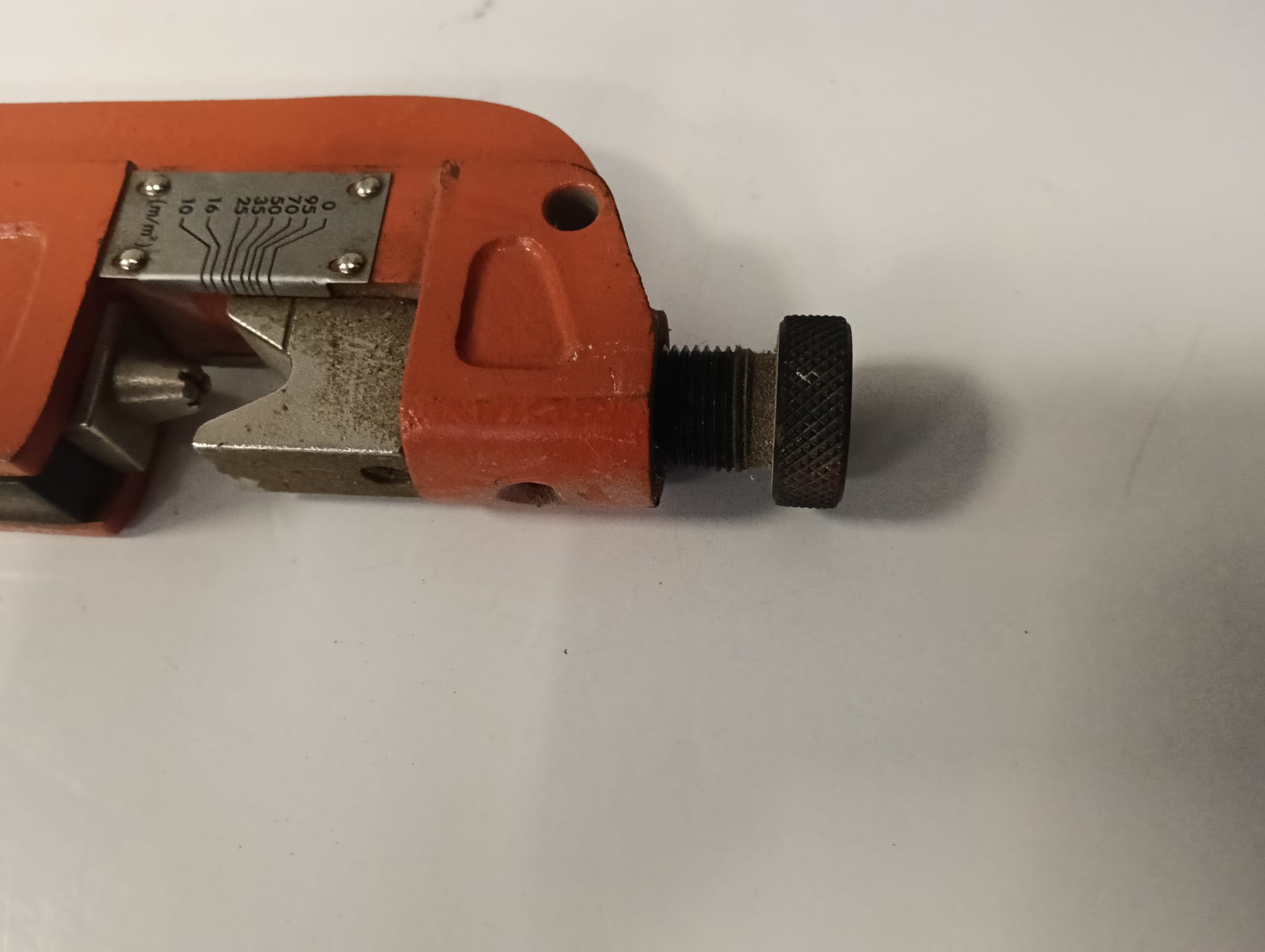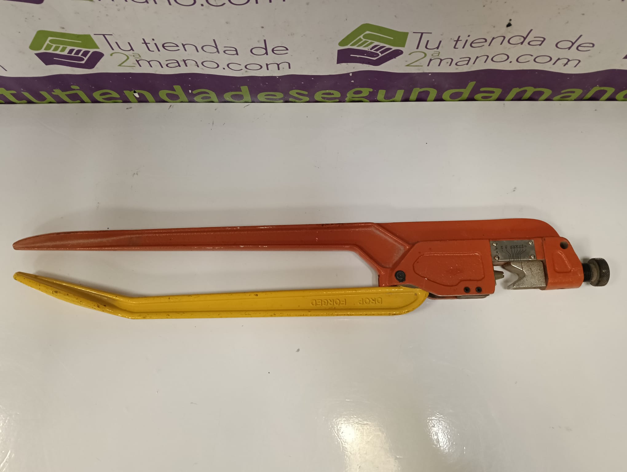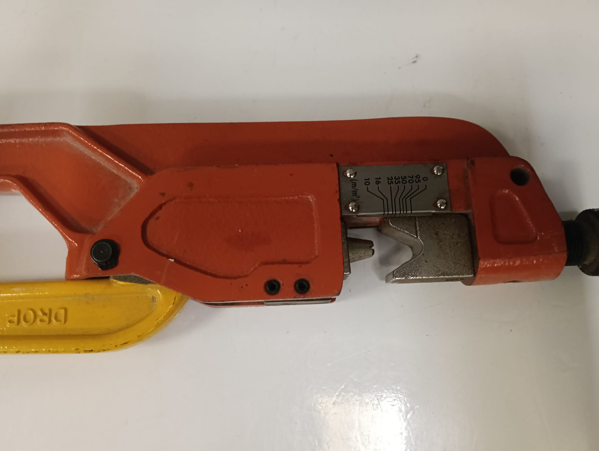 Herramienta para crimpar terminales de batería. Rango de trabajo: 10 mm2 a 120 mm2. Construcción robusta en metal naranja y amarillo.