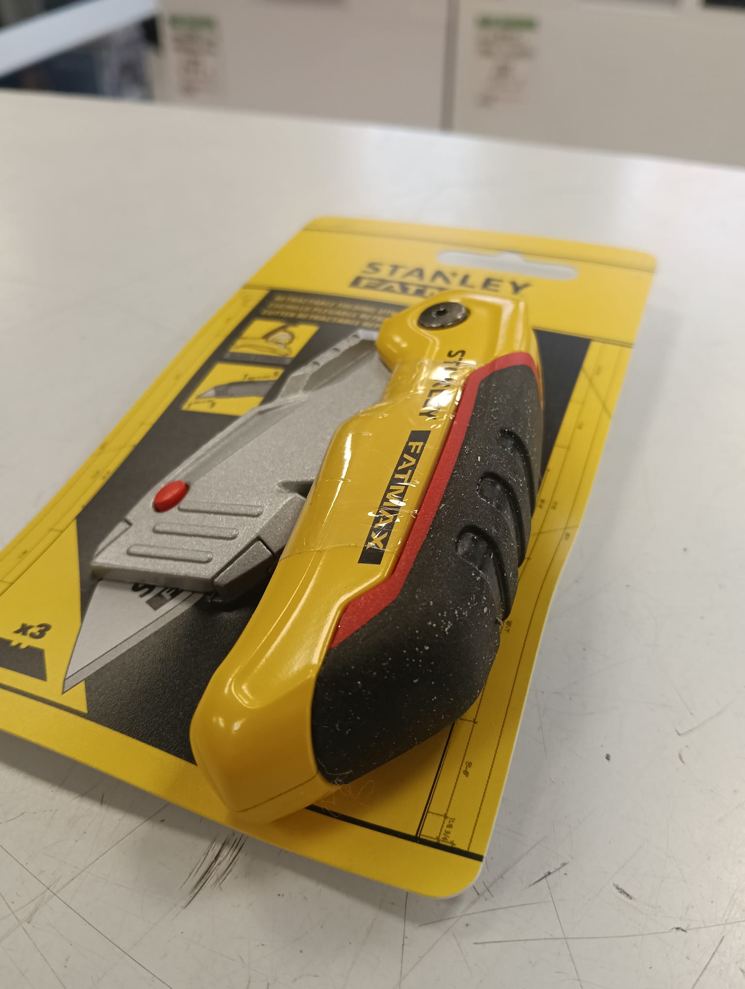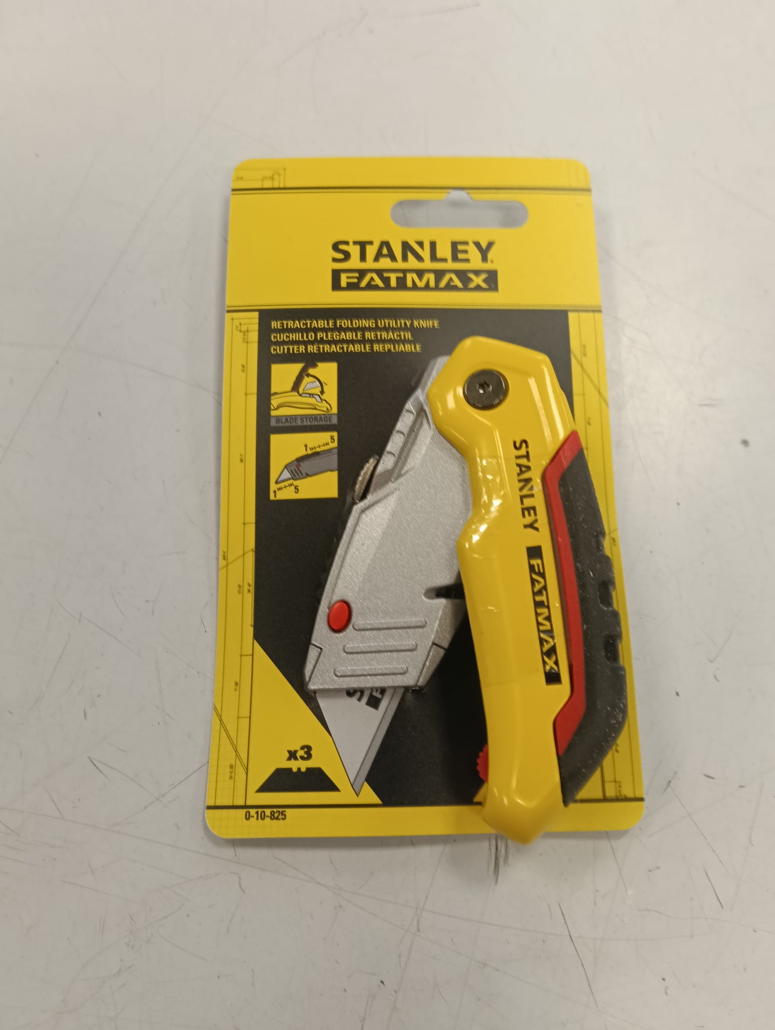 Cúter Stanley Fatmax modelo 10-825, con diseño plegable y retráctil.Incluye 3 cuchillas de repuesto.Mango de color amarillo y negro.
