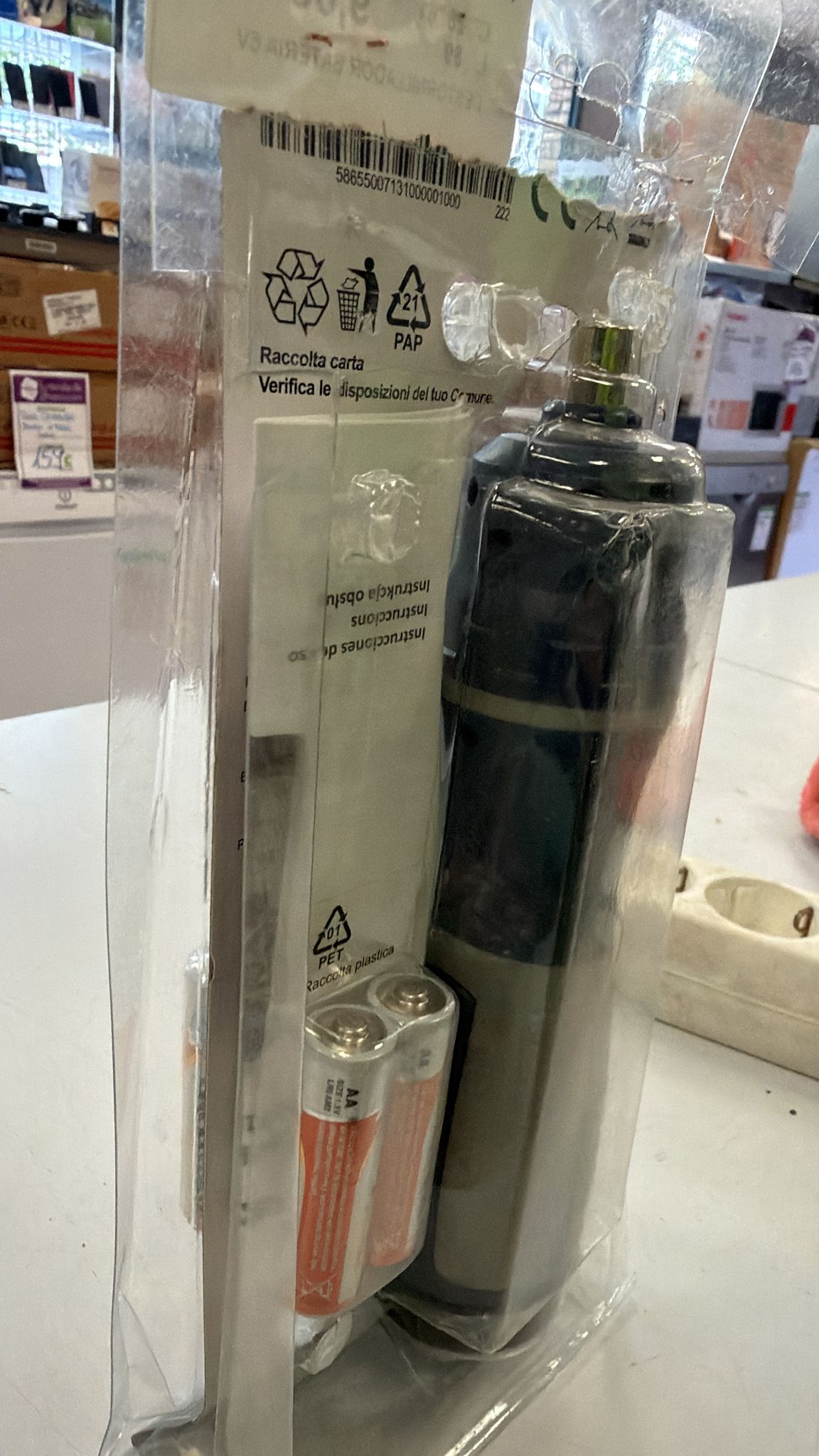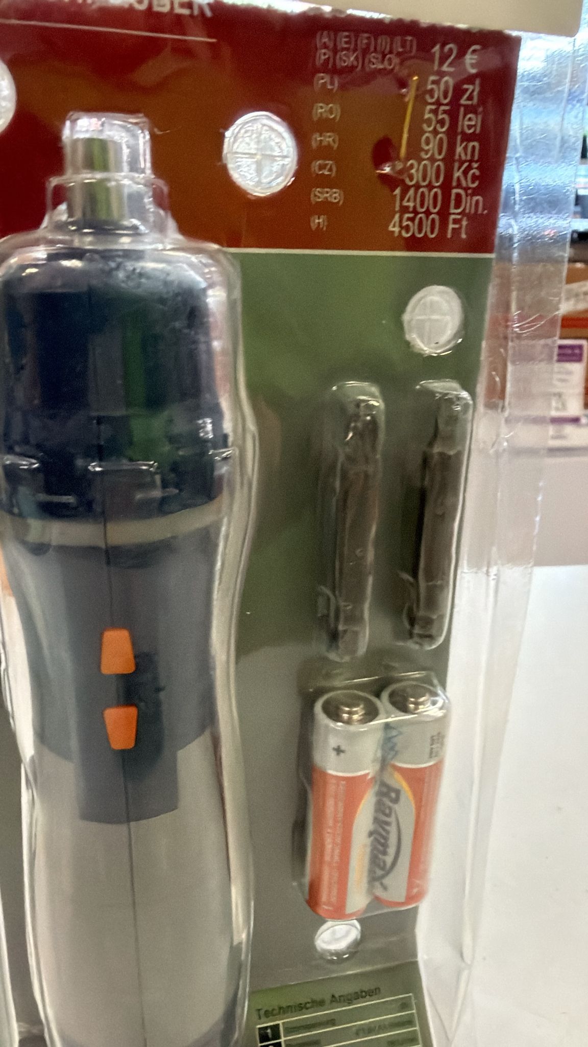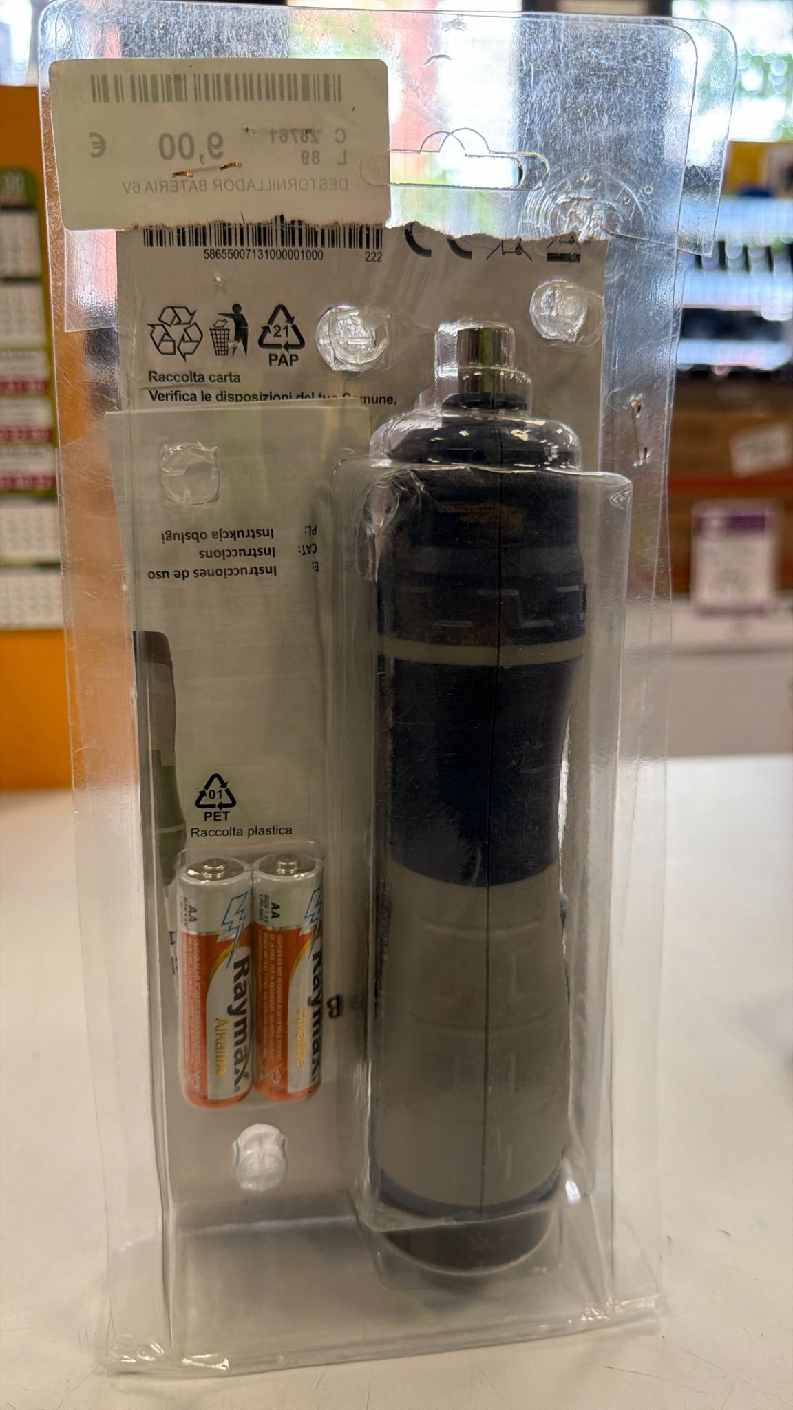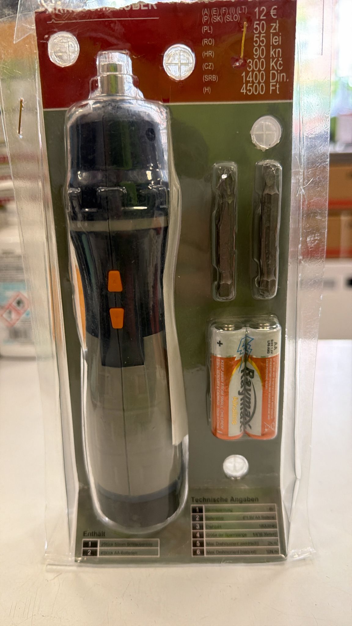 Destornillador eléctrico a batería, ideal para tareas domésticas. Incluye dos puntas de destornillador. Funciona con 4 pilas AA (incluidas). Diseño ergonómico.